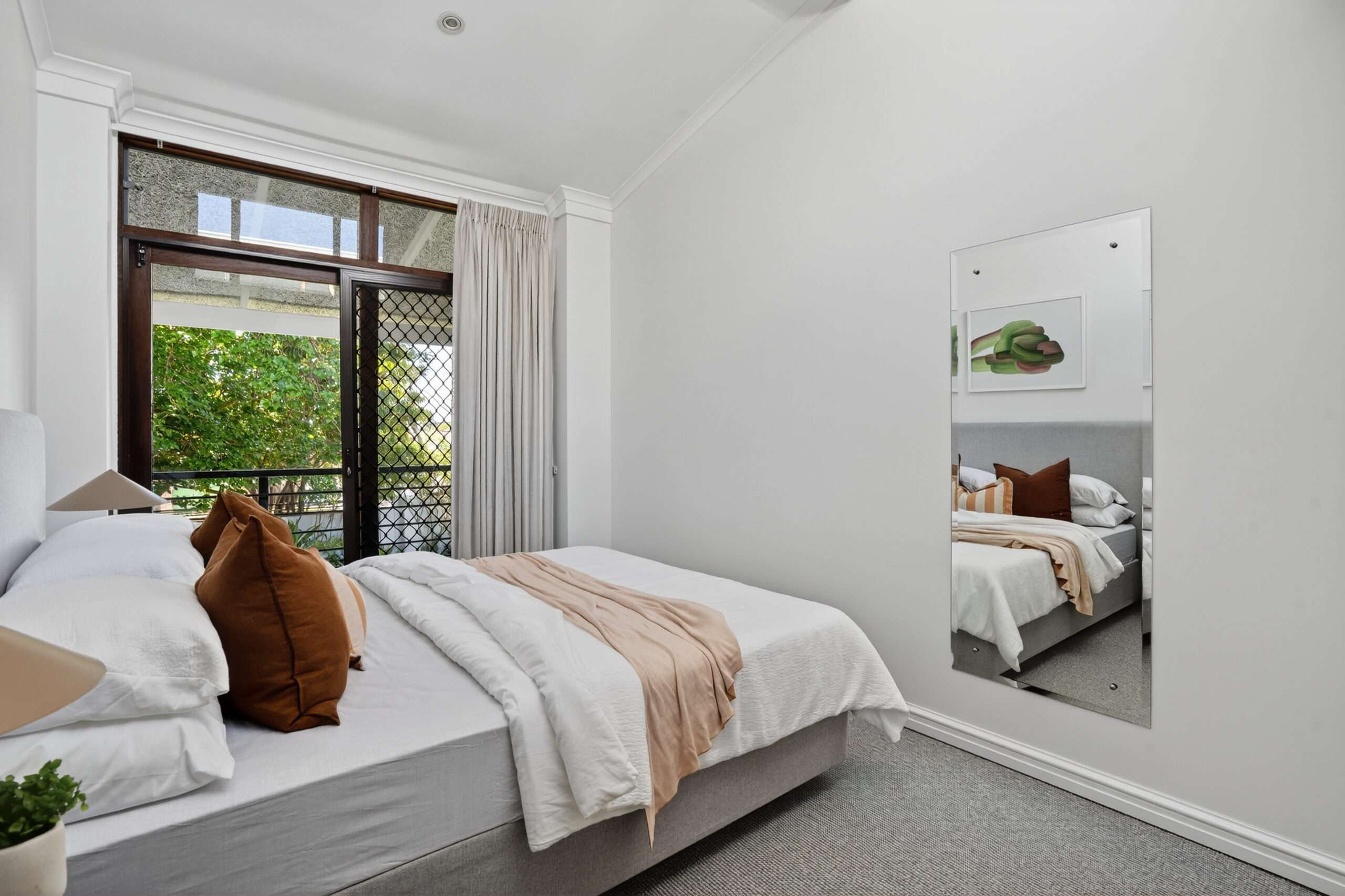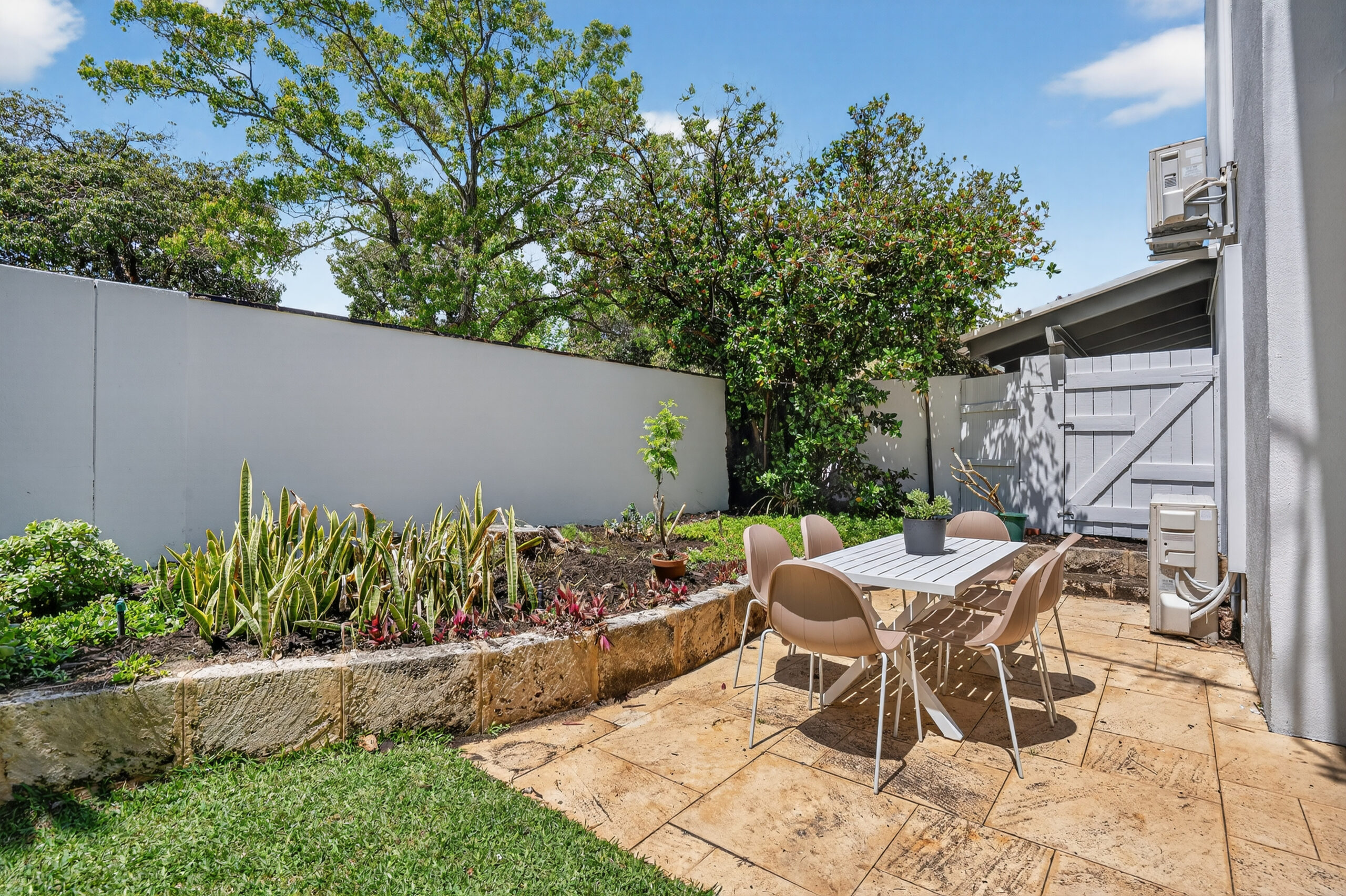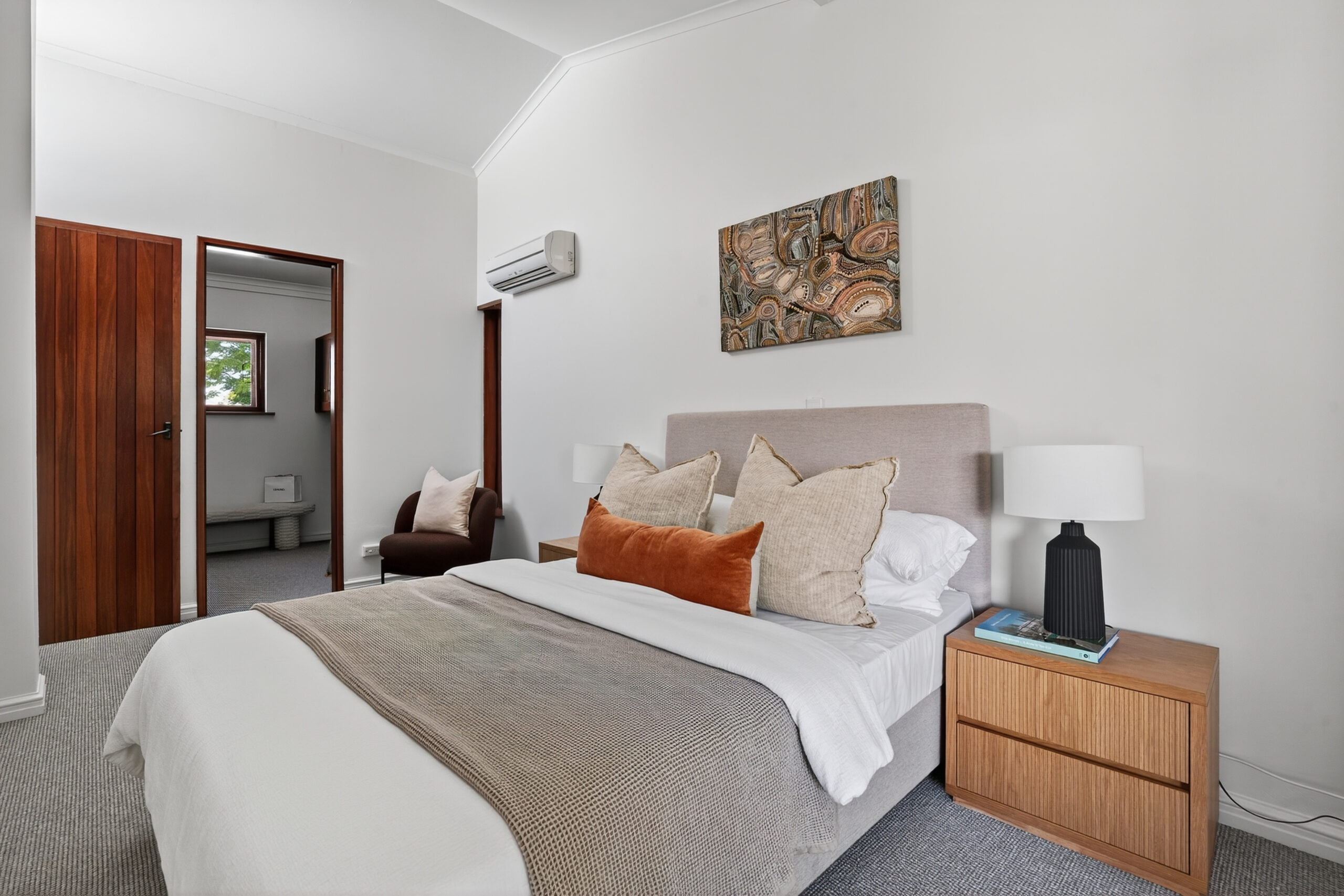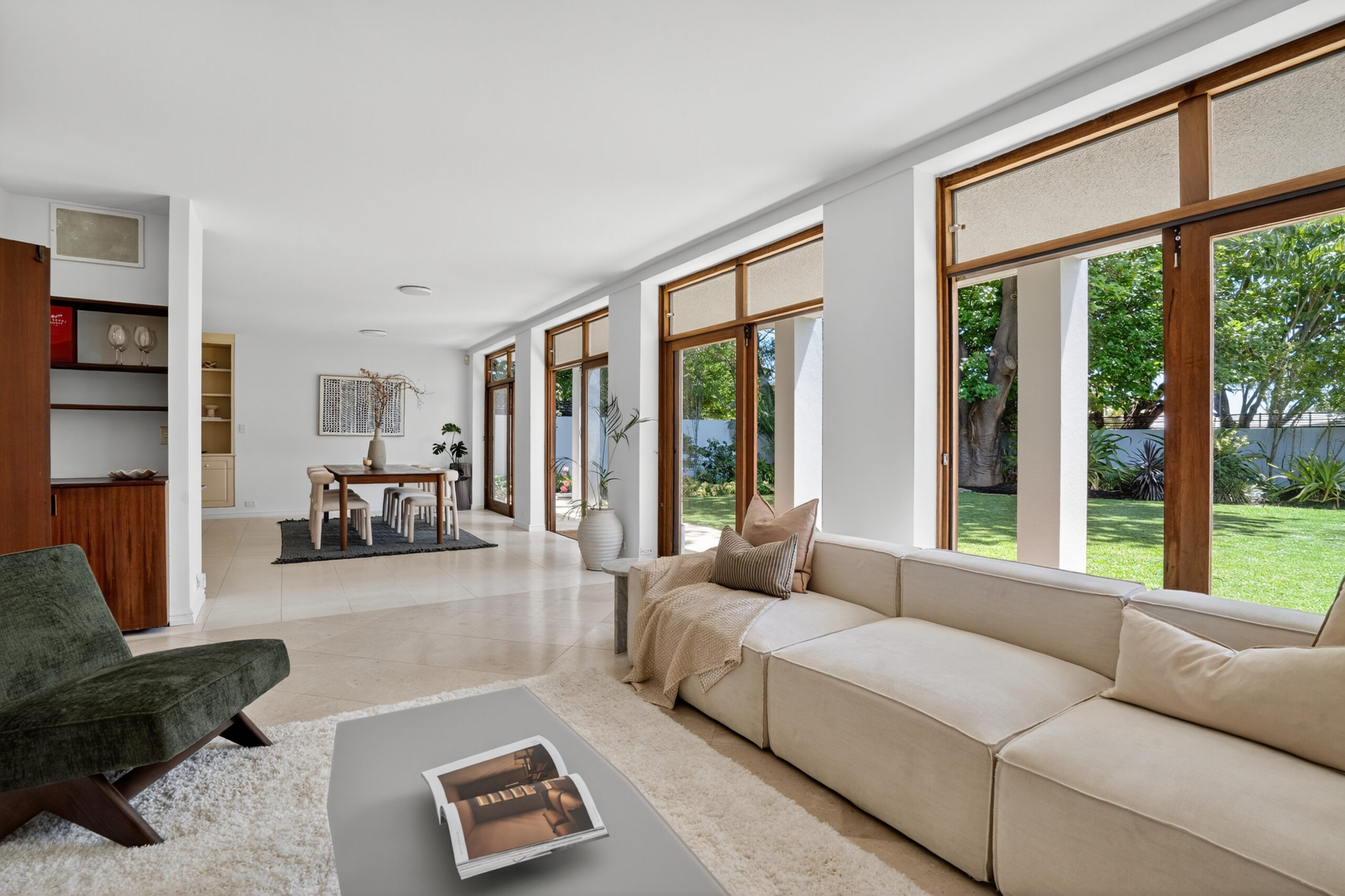 Originally built in the 1970s and designed by celebrated architect Colin Moore, thoughtful updates over the years have preserved elements of its “brutalist” inspired design and its quiet confidence. Upon entry, the open-plan layout and connectivity to the front garden undoubtedly takes centre stage. A series of sliding, timber doors bring the outdoors in, with abundant natural light making this space a joy to inhabit, and the front garden is peaceful and private with its high walls, flourishing garden beds, an expanse of lawn, with plenty of room for a pool if so desired, and a majestic flame tree tucked into the corner.