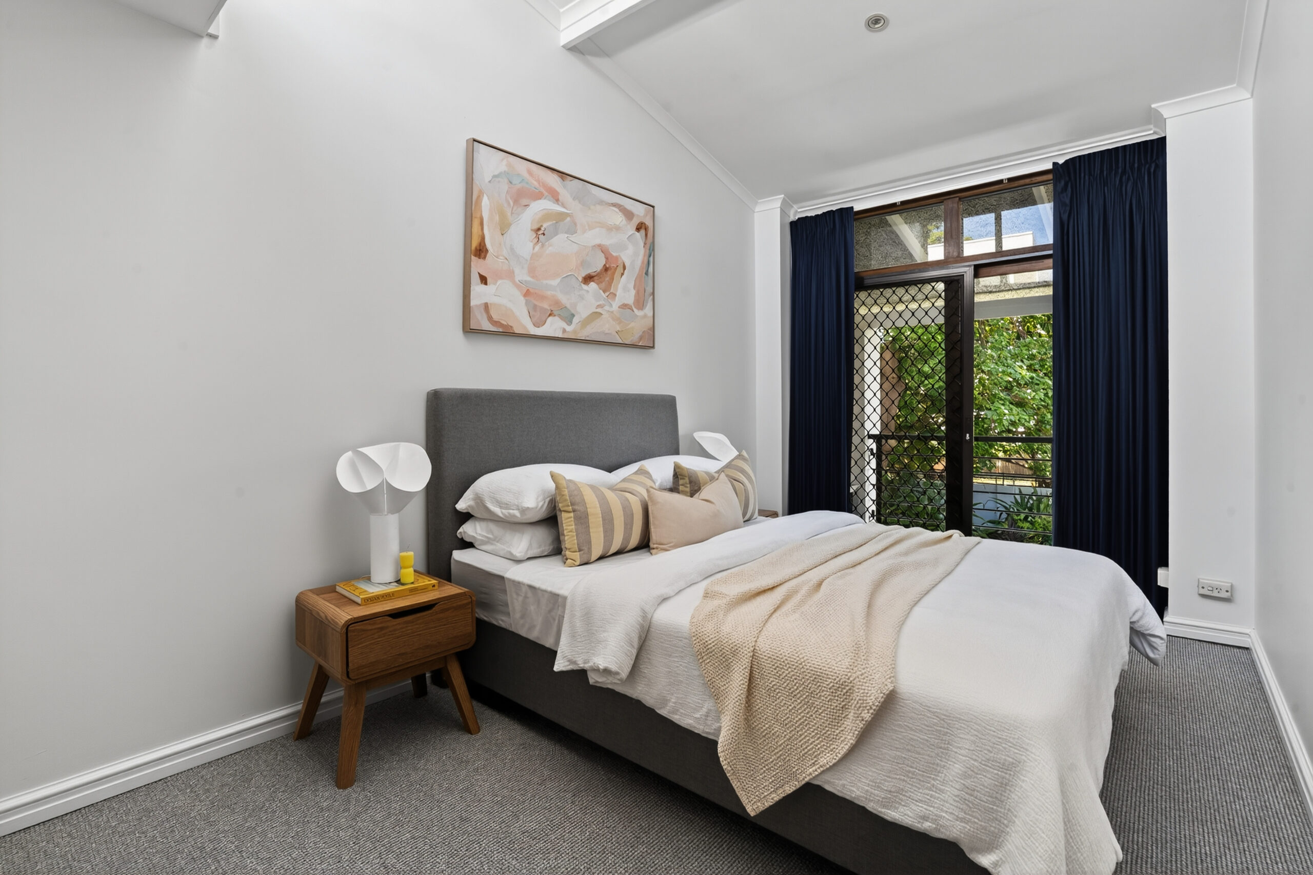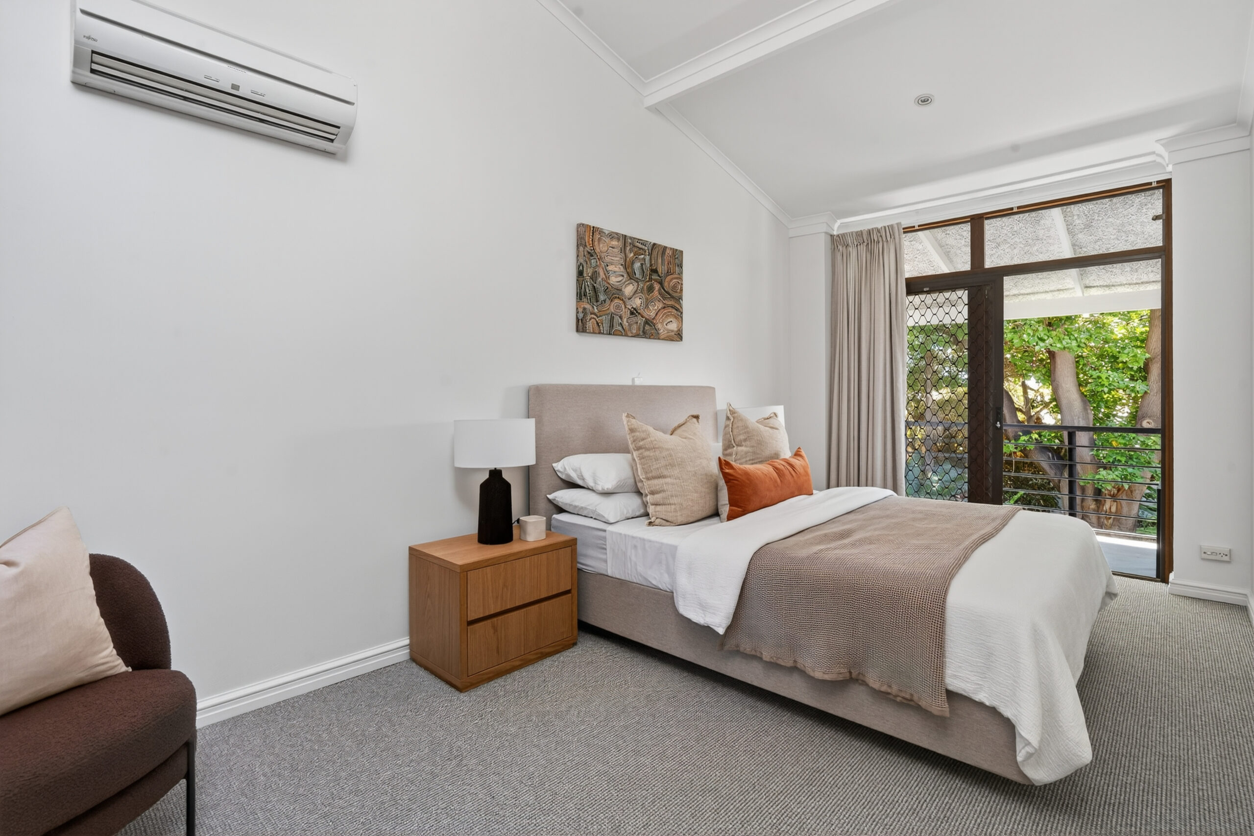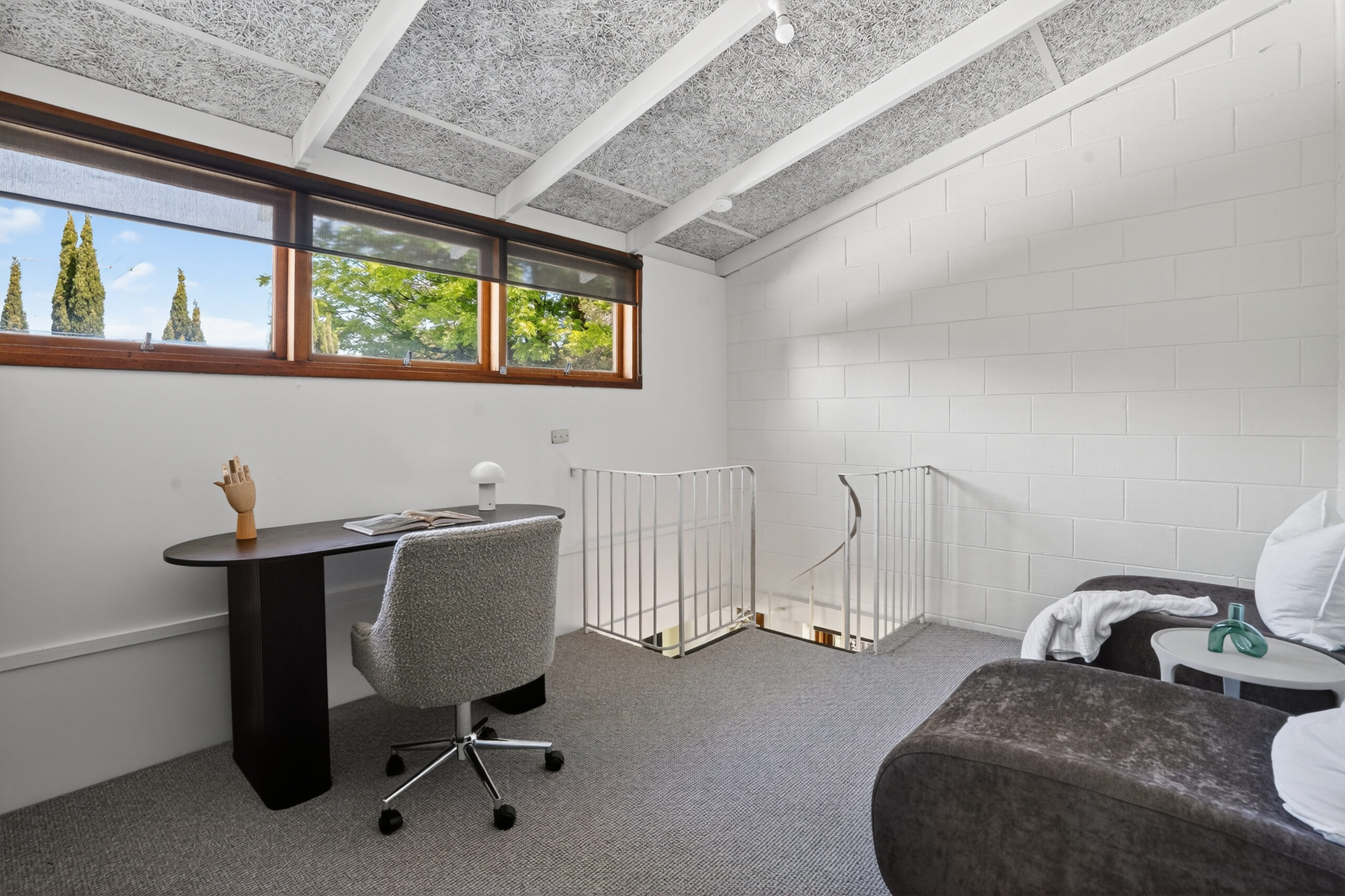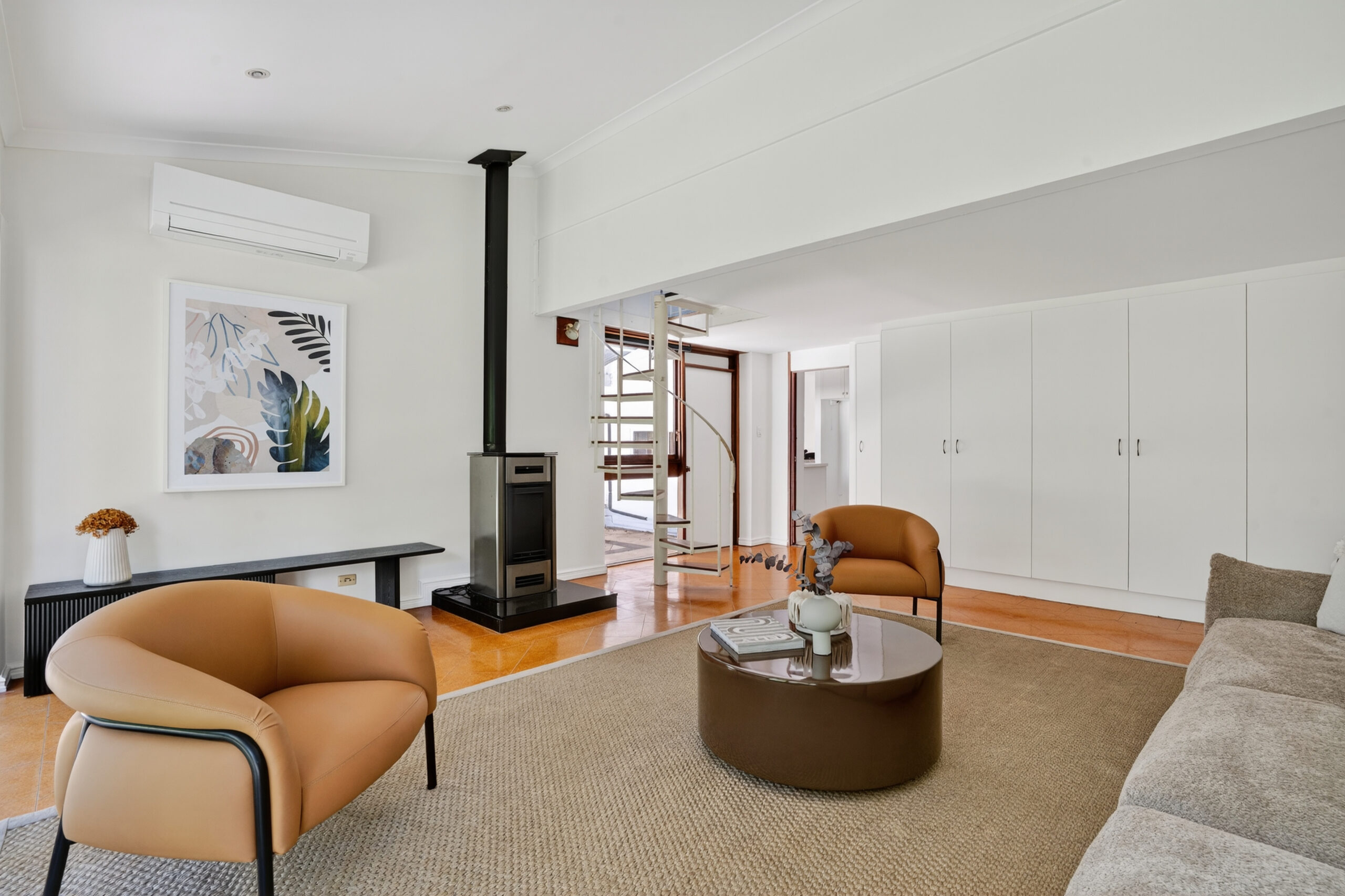 The simple galley kitchen houses Miele cooking appliances and an ASKO dishwasher, with a laundry nook and bathroom nearby. Beyond is a second living area which extends out to a private south-facing garden, featuring a wall of built-in storage, gas fireplace and air-conditioning. A spiral staircase rises to a loft-style room. Ideal for use as a home office, creatives’ zone, teenagers’ retreat, hobby space, or additional storage – while out the back is a workshop for storage of tools and toys, extra parking, or handyman projects, plus a drying court for the laundry.