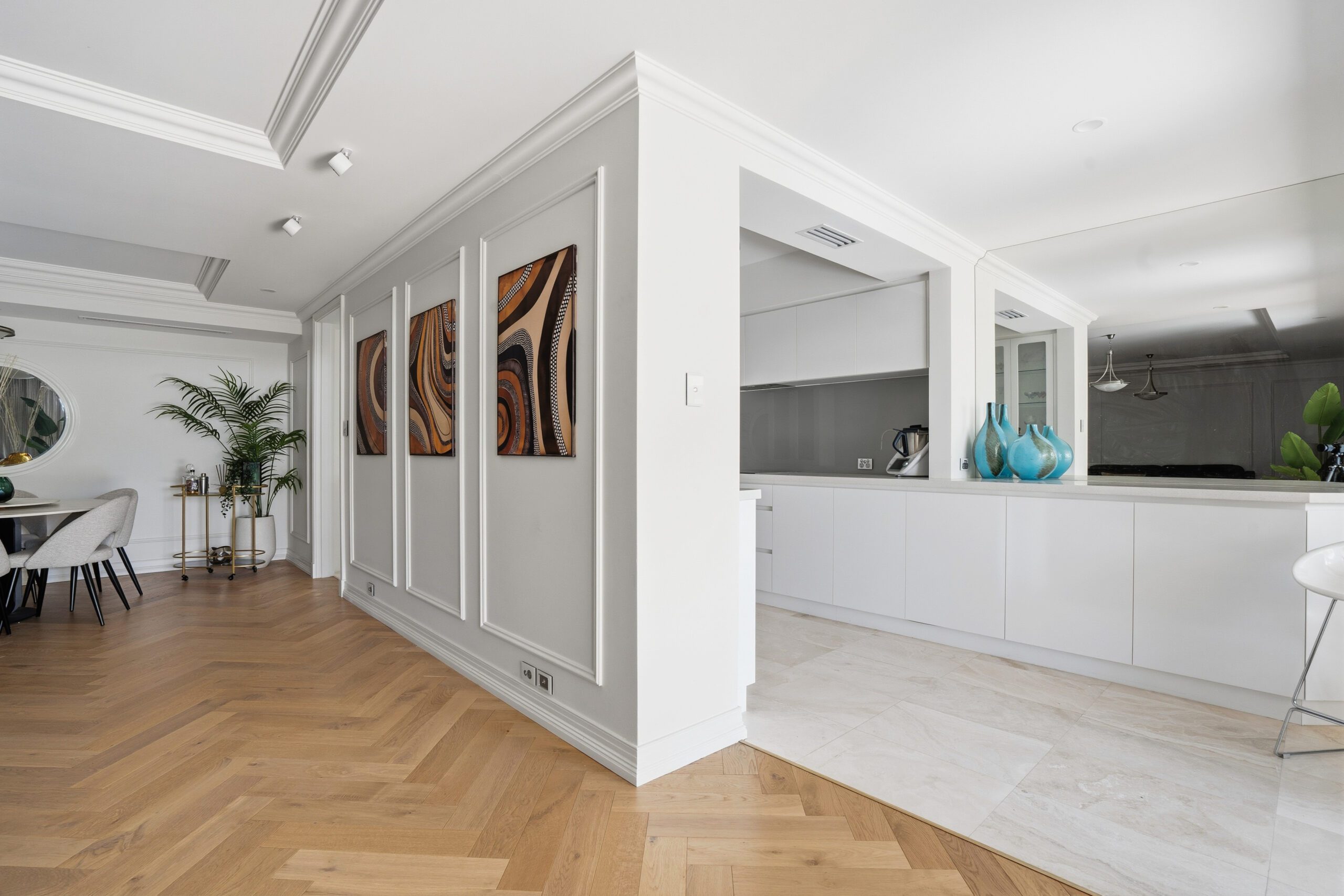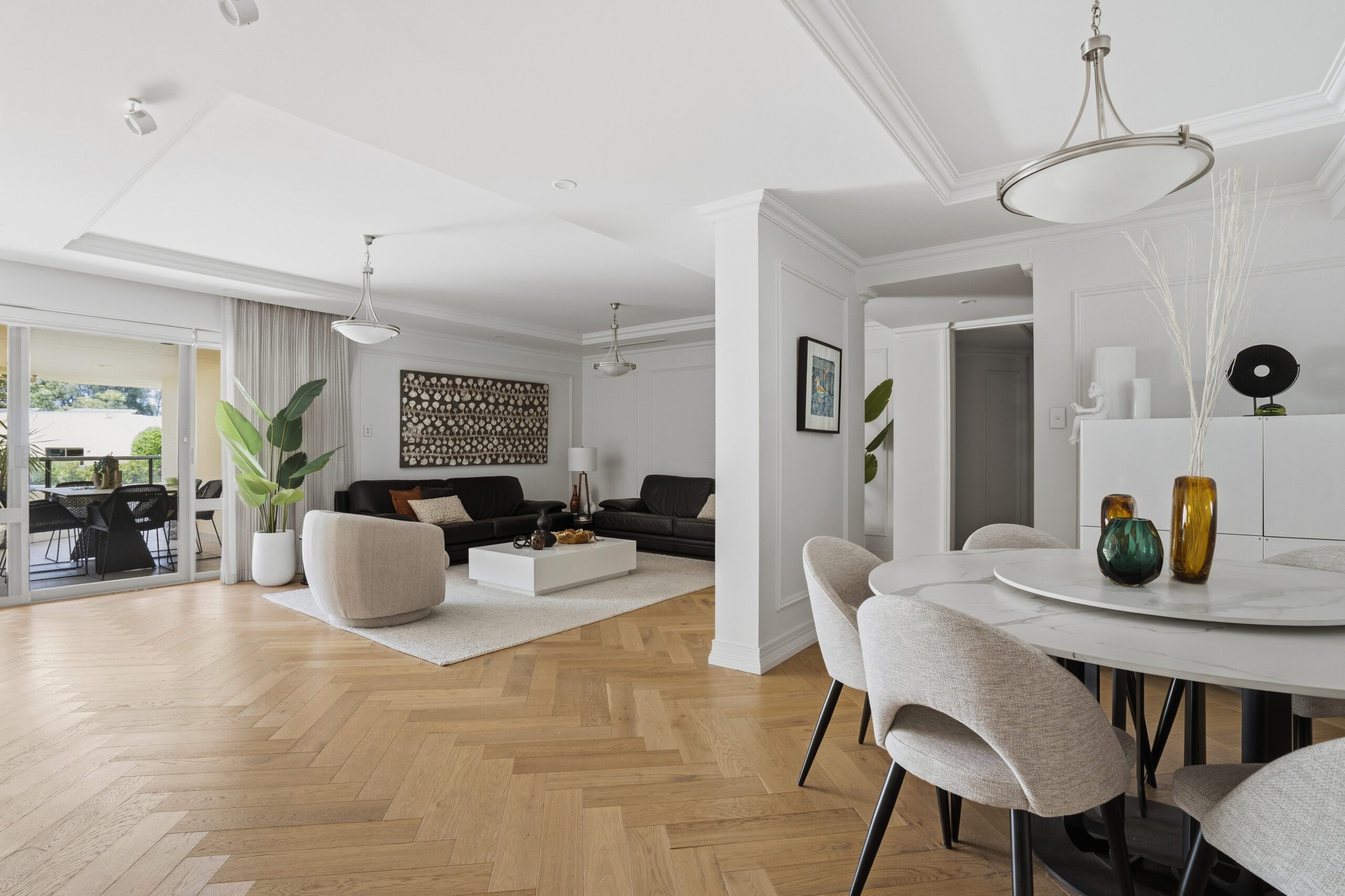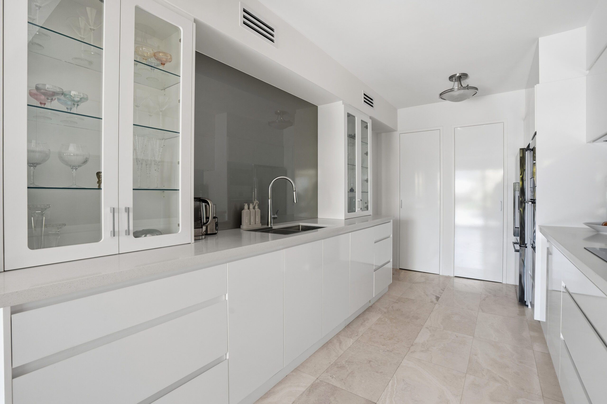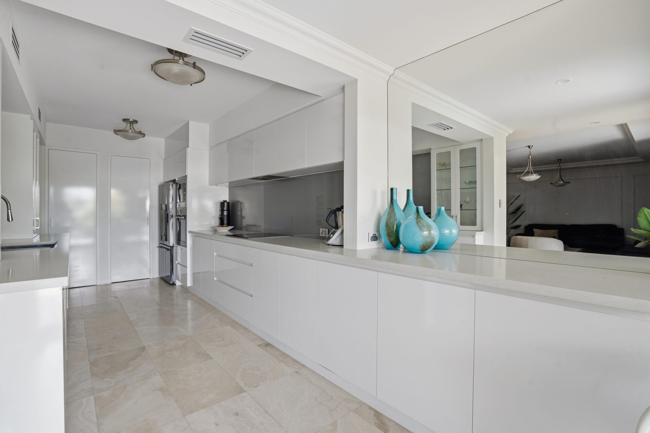 Features include stunning herringbone Oak flooring, Carrera Marble finished bathrooms, Travertine stone flooring in the kitchen, stone benchtops, deluxe cabinet work throughout, European appliances, ceramic tiled balcony, plus so much more. All virtually as-new.