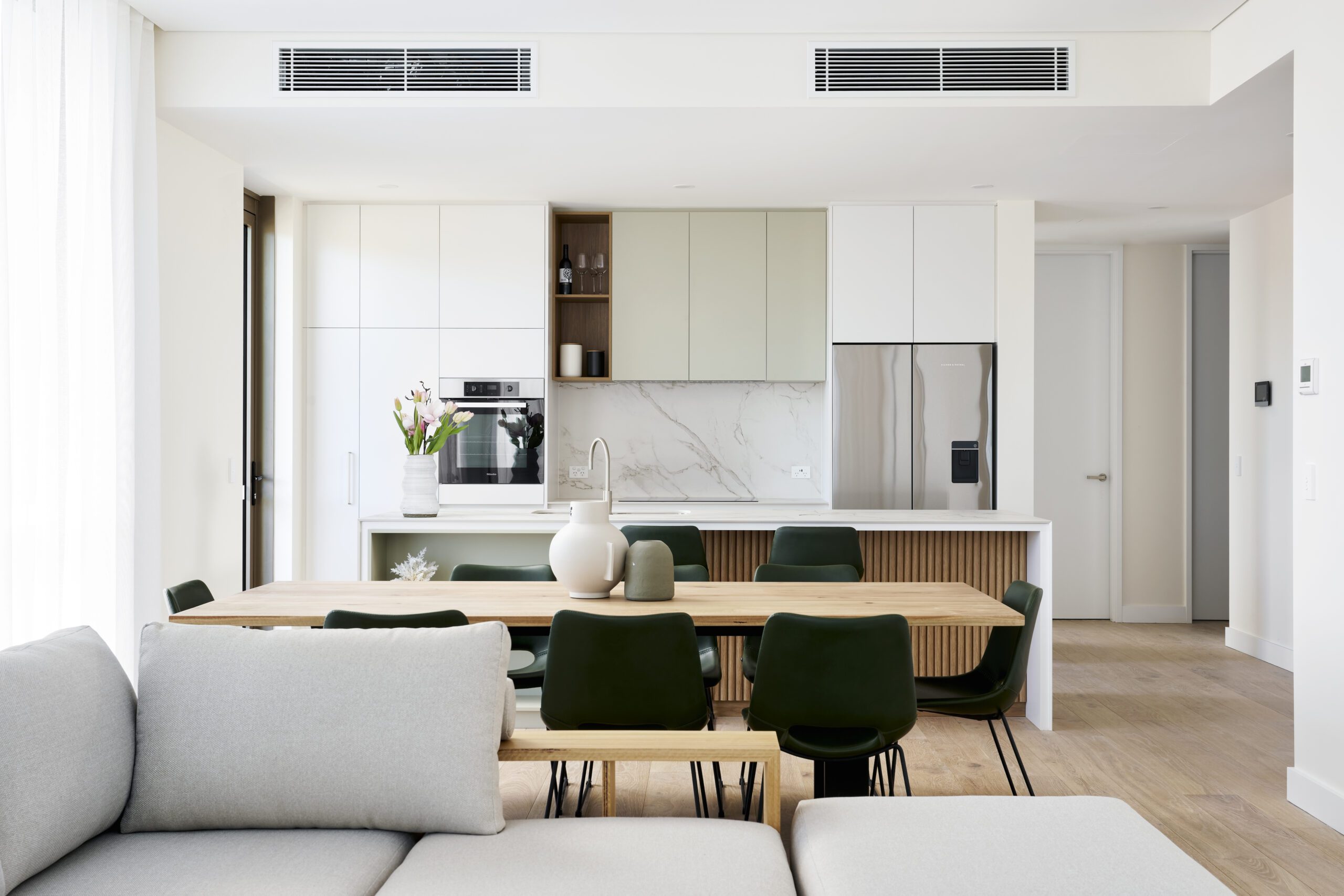 Architecturally designed, each apartment has beautifully crafted kitchens with Miele appliances, large open living spaces and an entertainers’ balcony already fitted with a barbeque. Ducted reverse cycle air-conditioning, good storage and quality finishes adding to a comfortable standard of living. You can move in ready to welcome and entertain your family and friends, while enjoying a luxurious and streamlined lifestyle.