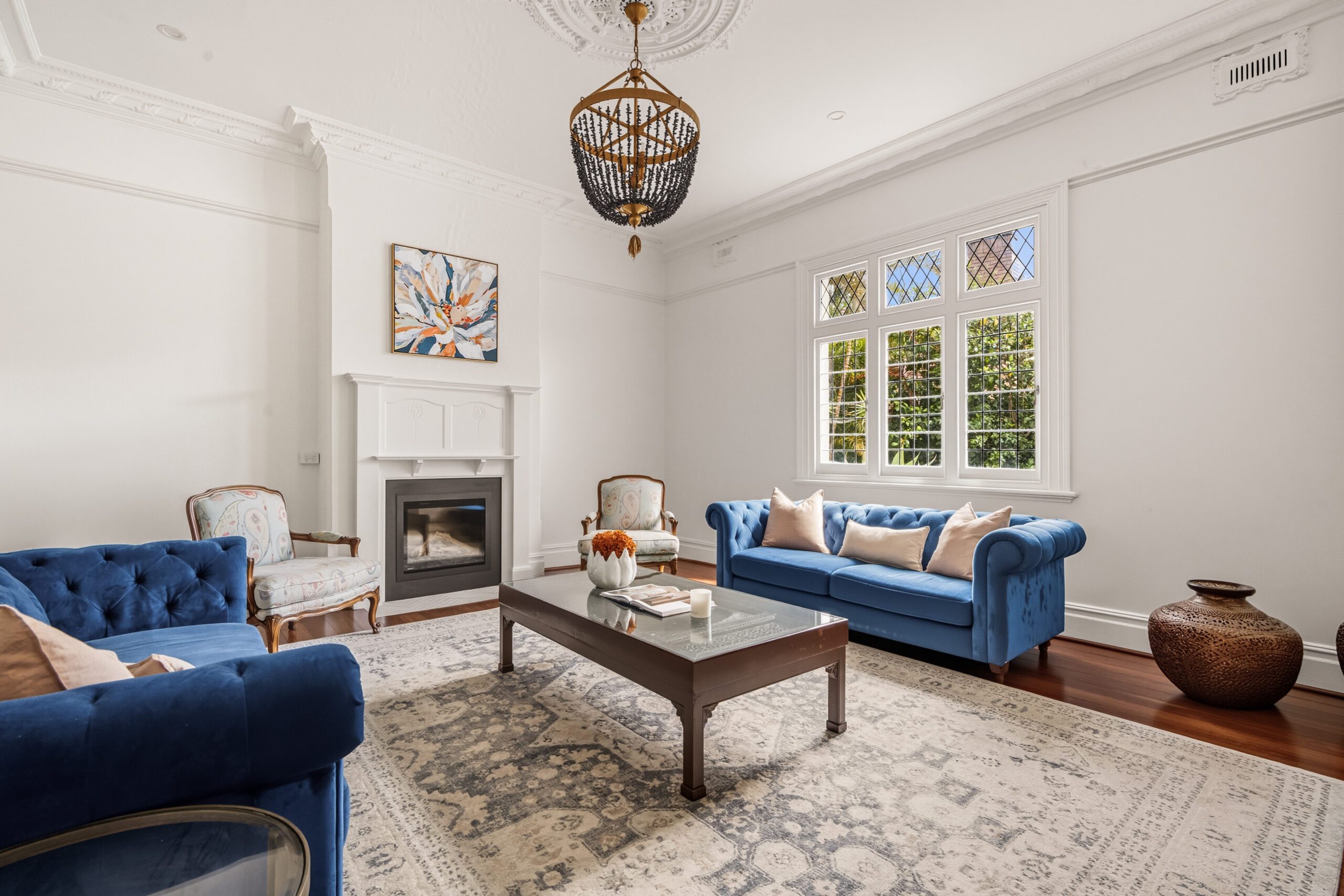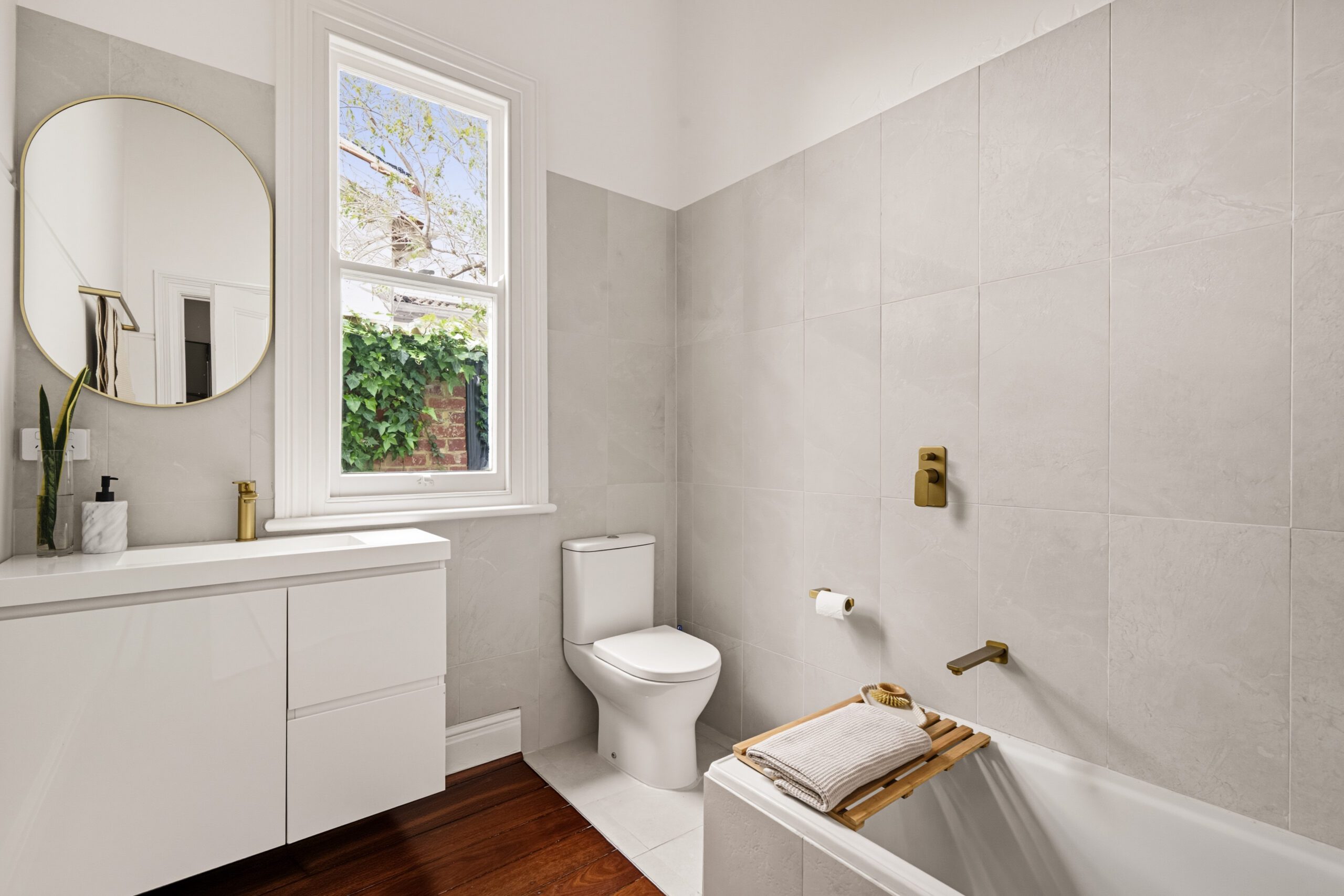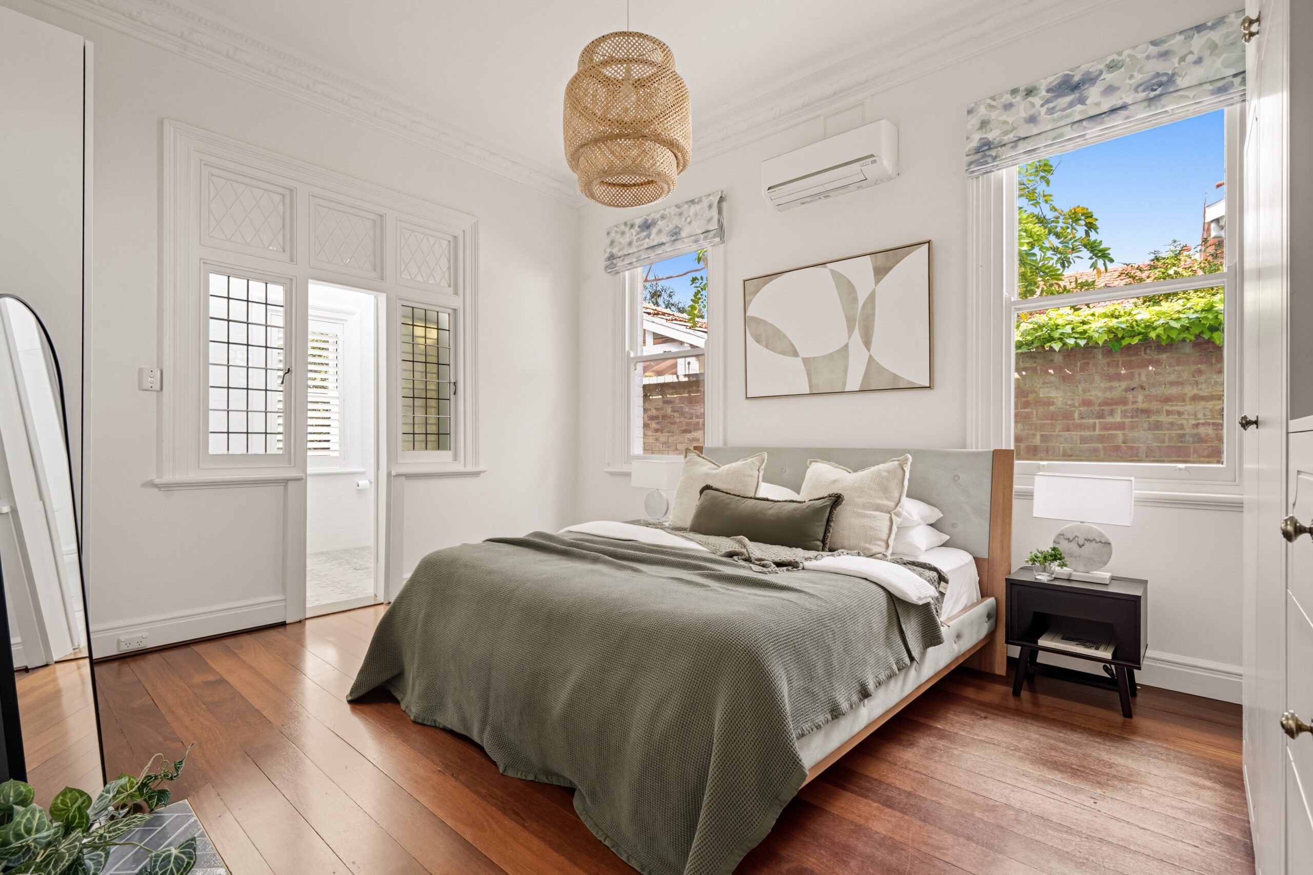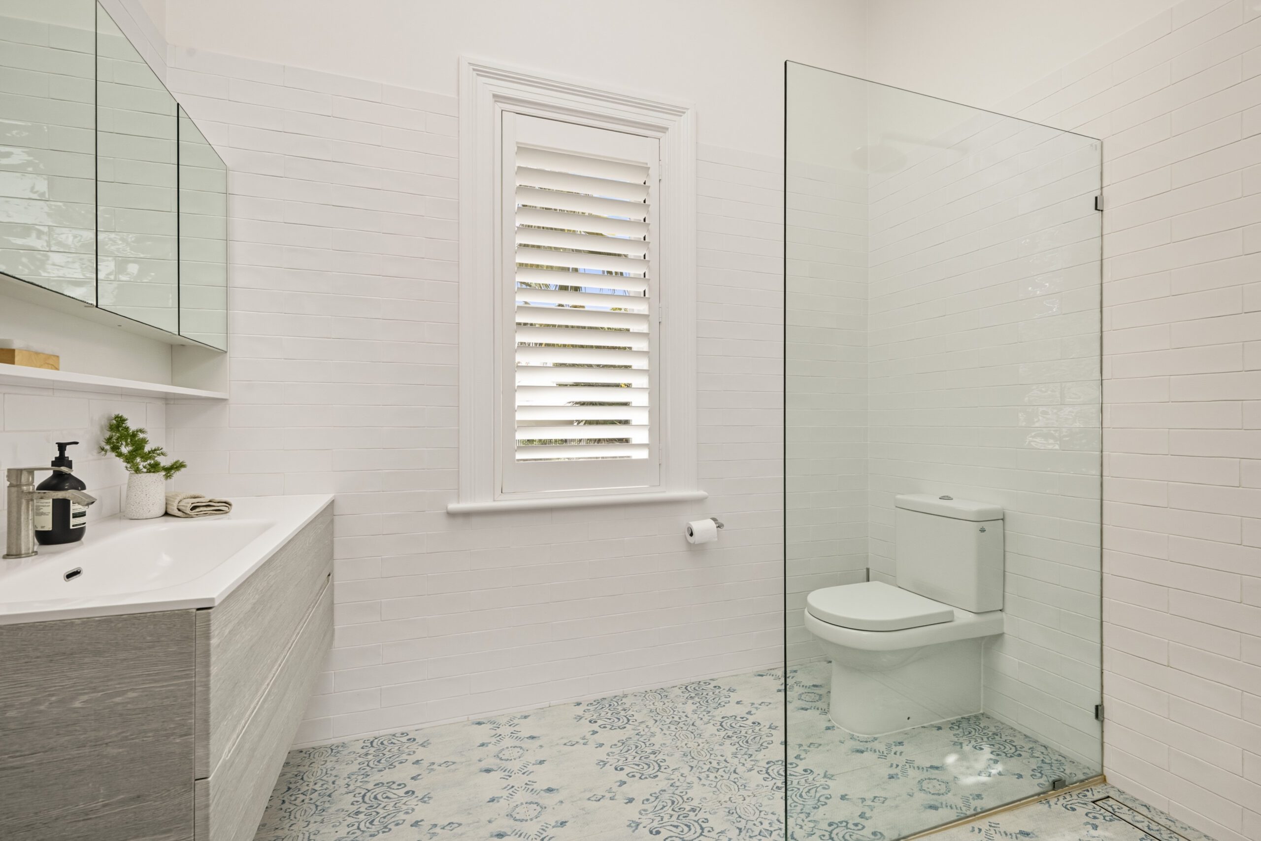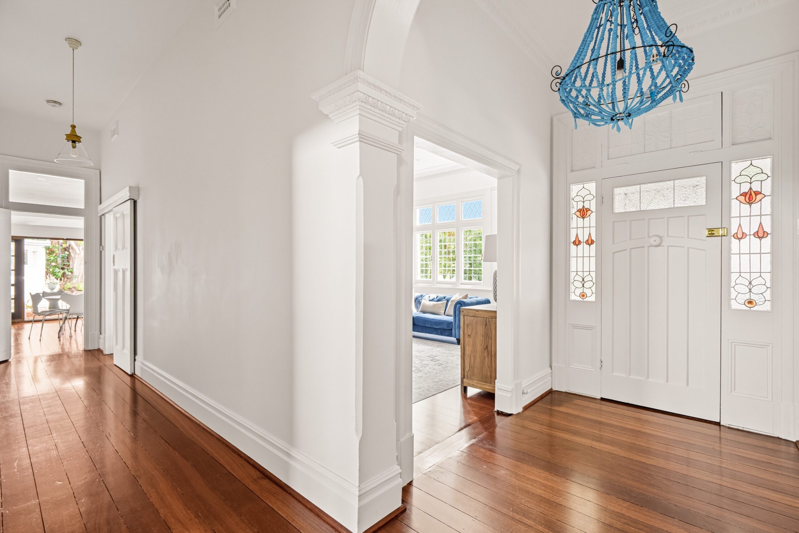 Shady, leafy gardens enhance the front and rear, with a wraparound veranda signalling the home’s era. Inside is even more: leadlight glass, sweeping high ceilings, ornate ceiling roses, and an elegant period archway. A huge sunlit lounge is immediately on the right, complete with a built-in gas log fireplace, as three equally generous bedrooms peel off the hallway – one with a decorative fireplace, and all with air-conditioning. The master suite has a fabulous skylit ensuite with all the trimmings: heated towel rail, glossy subway tiles, floating vanity, white plantation shutters, toilet, and walk-in rain head shower. Down the hallway, past the full-height built-in storage, a second bathroom is equally as stylish with brass fixtures, floating vanity, and a rain head shower above the bath.