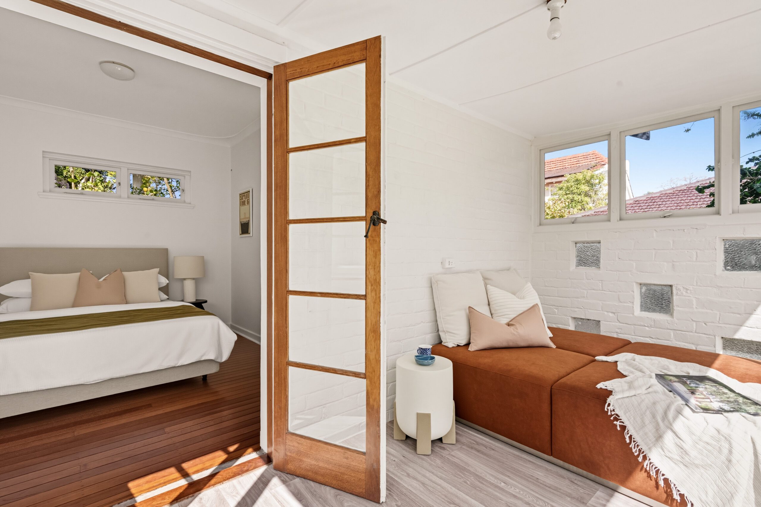 At the heart of it all, the kitchen is finished in sleek simplicity: soft-close cabinetry, marble-look benchtops against a herringbone splashback, and appliances. Nearby, a carpeted multi-purpose room with air-conditioning, leads to a series of rooms that can be configured however you like – including multi-generational living – or reimagined into something new. There’s a simple kitchenette, separate lounge, bedroom, bathroom, and private exterior access. A sunny, semi-detached studio is flooded with natural northern light and makes an ideal work-from-home space, hobby zone, yoga room, or creative’s think tank – with a lovely garden outlook.