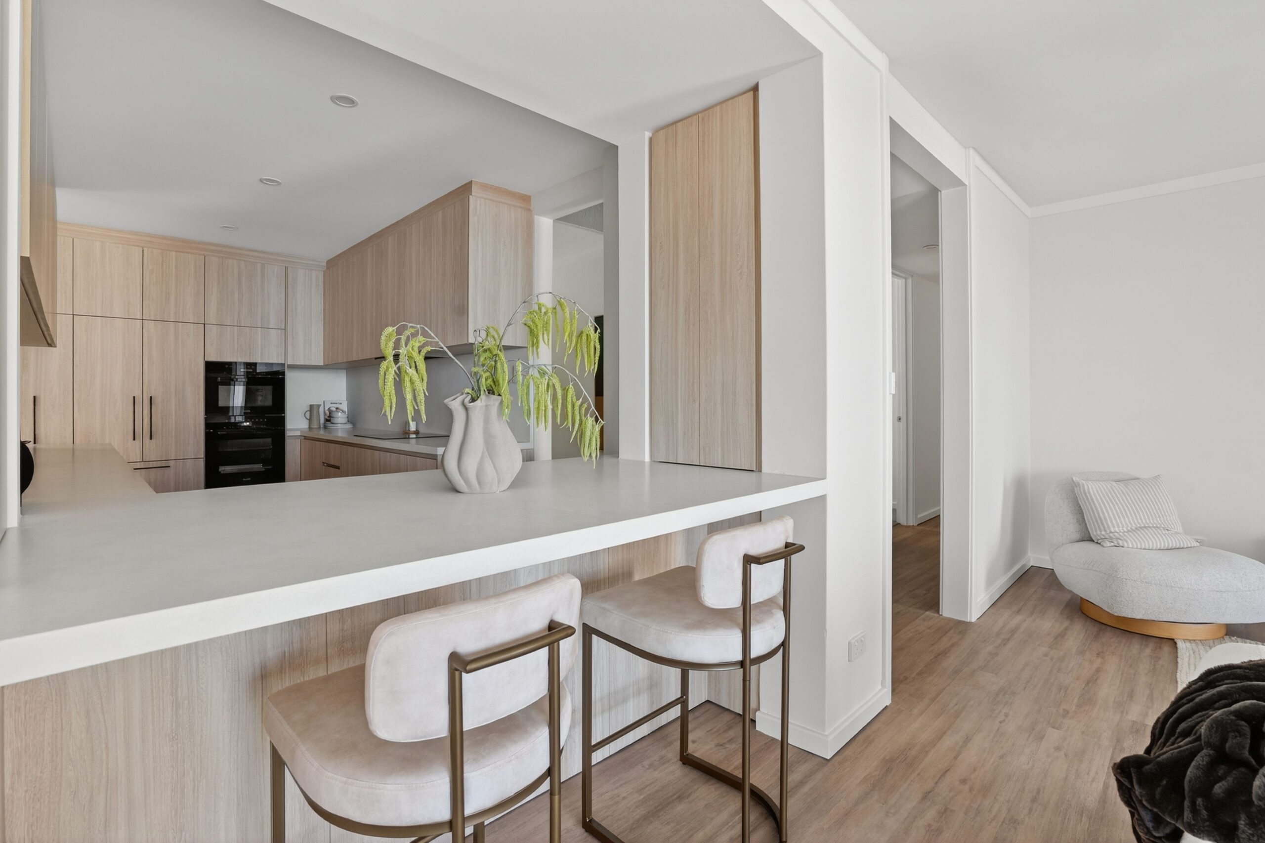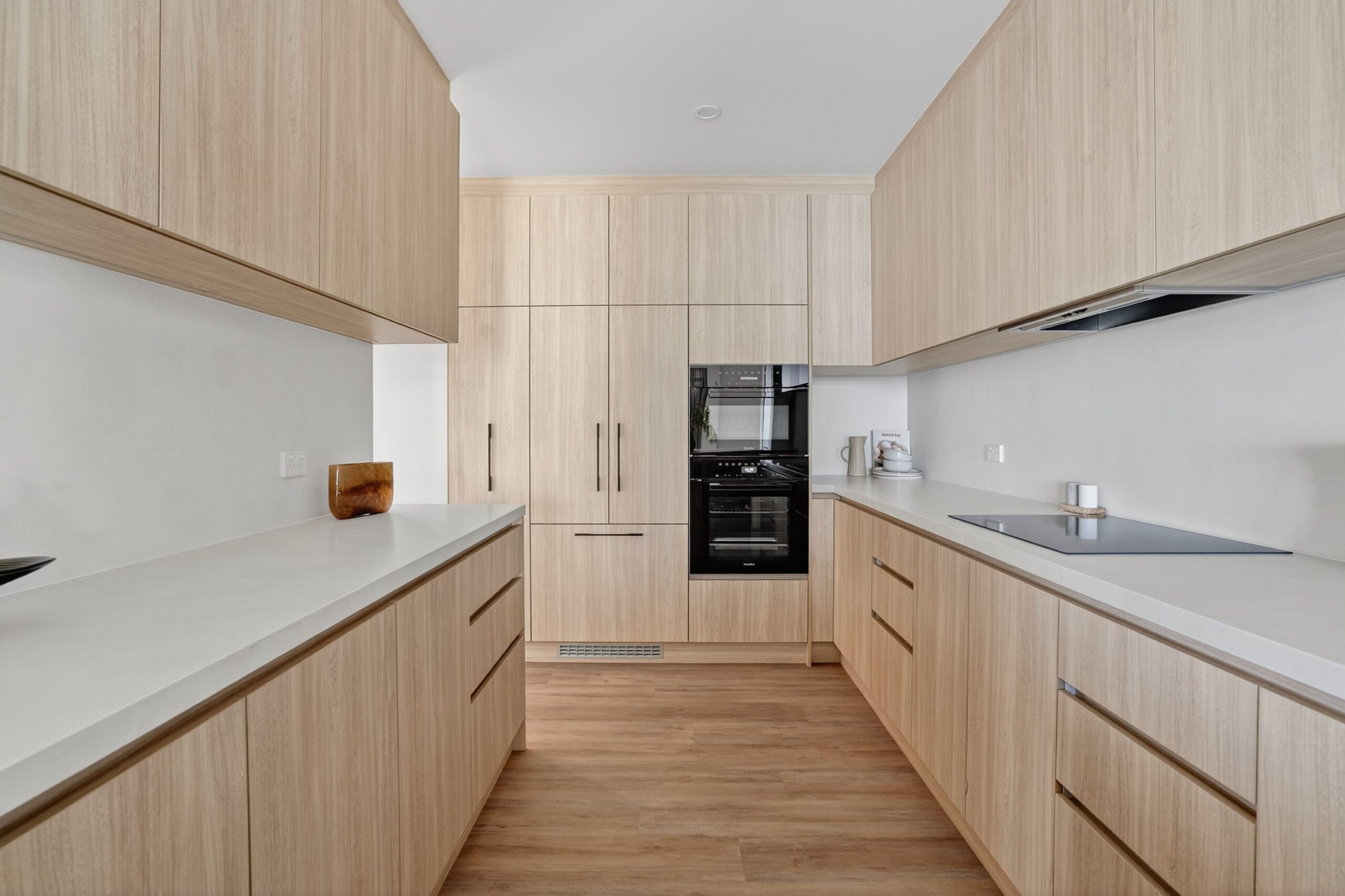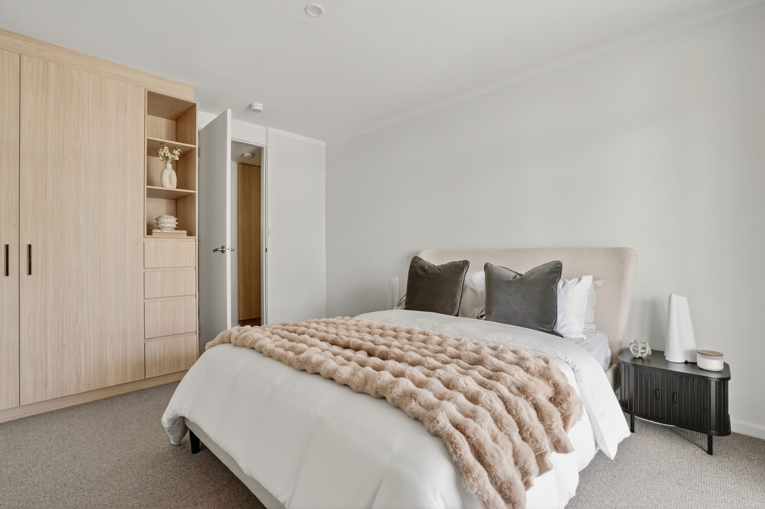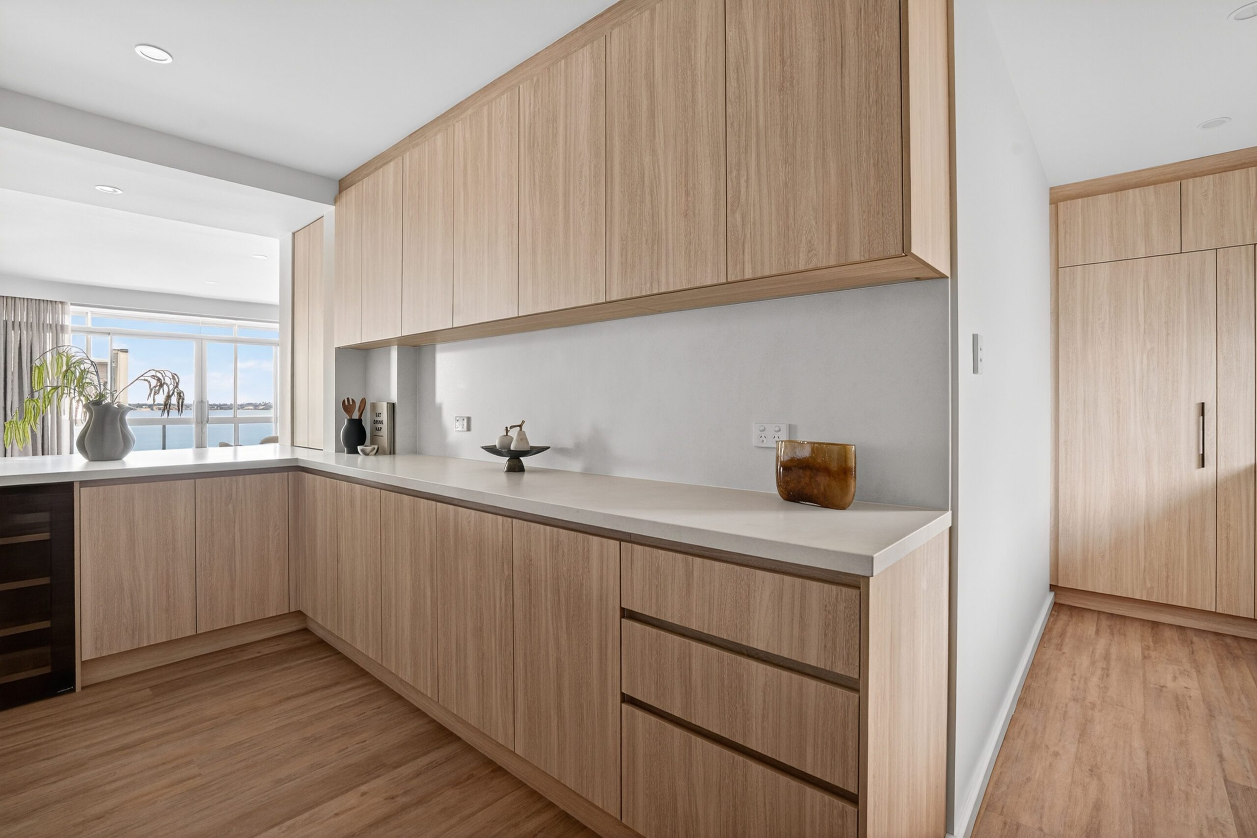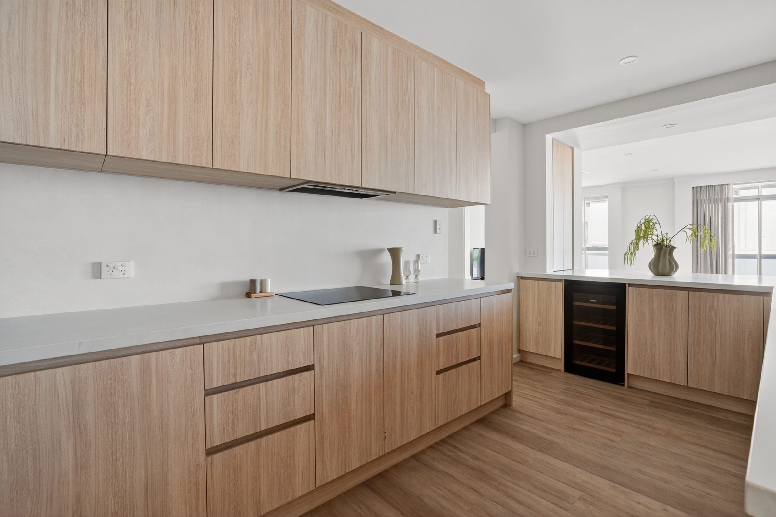 Beyond the secure, light-filled lobby, take the new lift to the top floor – Level Five. Inside, an elegant neutral palette is simply stunning against engineered timber floors and floods of natural light. To the right, the kitchen is magnificent. Engineered stone benchtops and splashbacks, LED strip lighting, and a suite of fully integrated appliances including Miele dual ovens, induction cooktop, and dishwasher, together with a Qasair rangehood, integrated fridge/freezer, wine fridge, and scullery concealing a discreet Euro-style laundry.