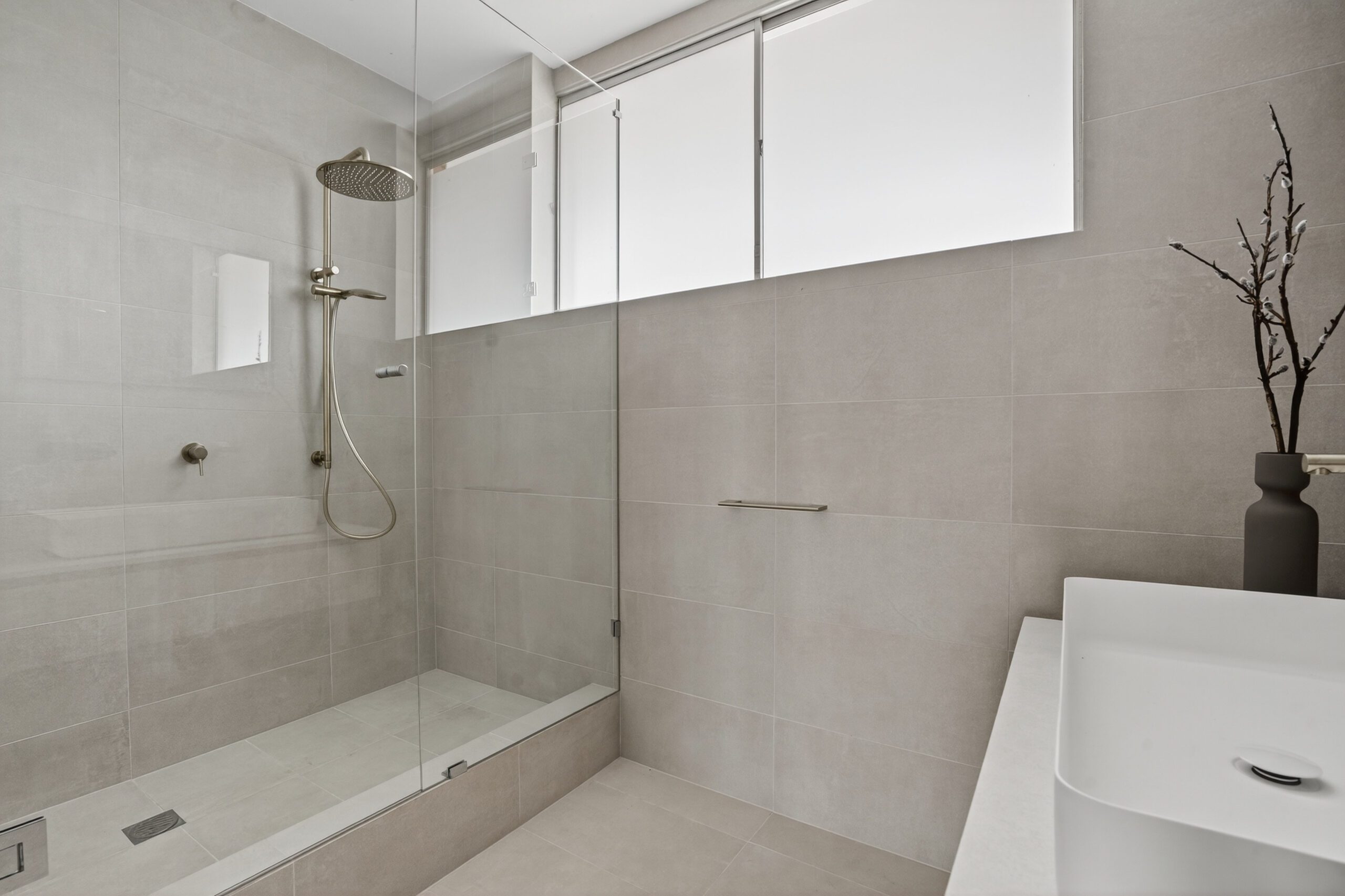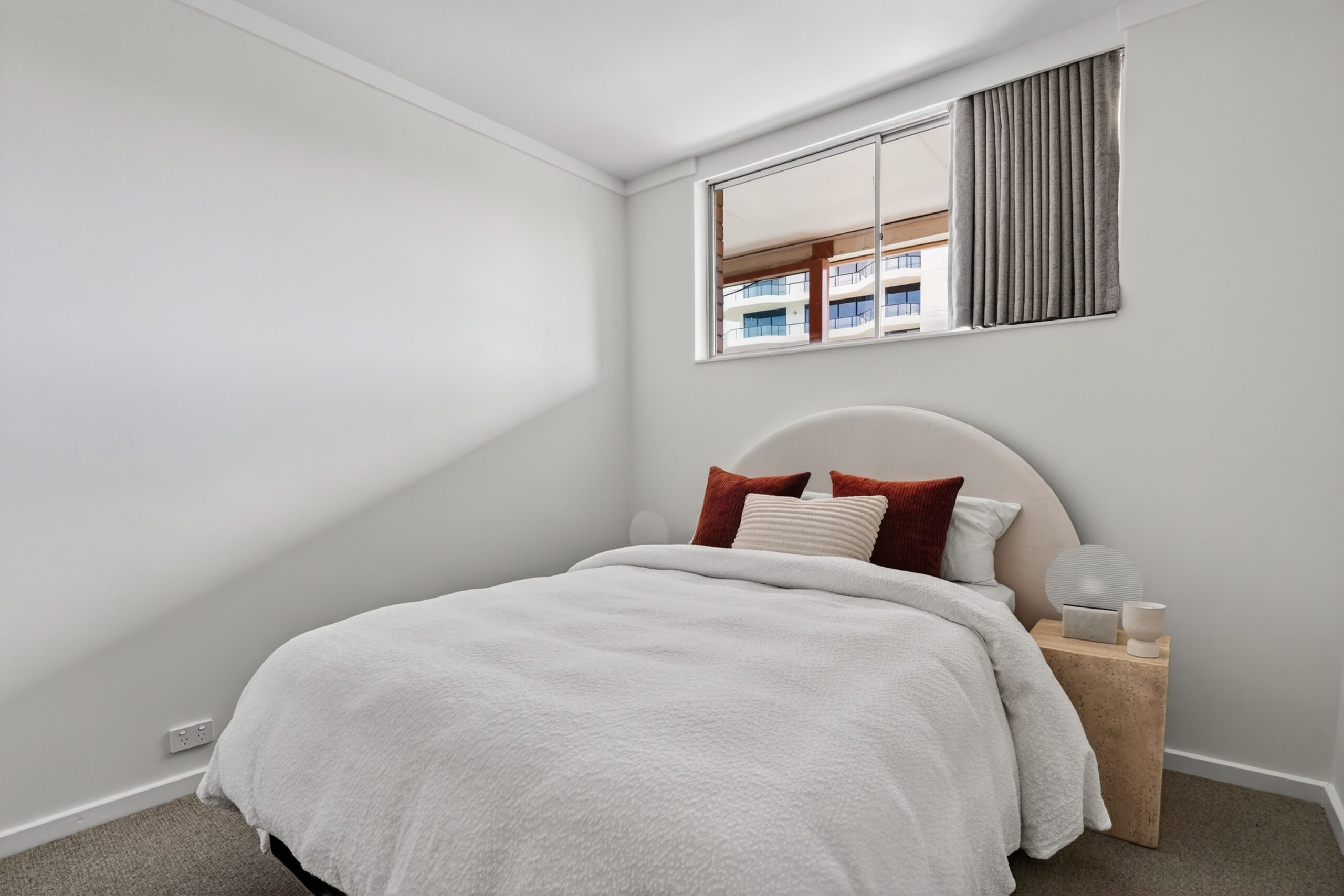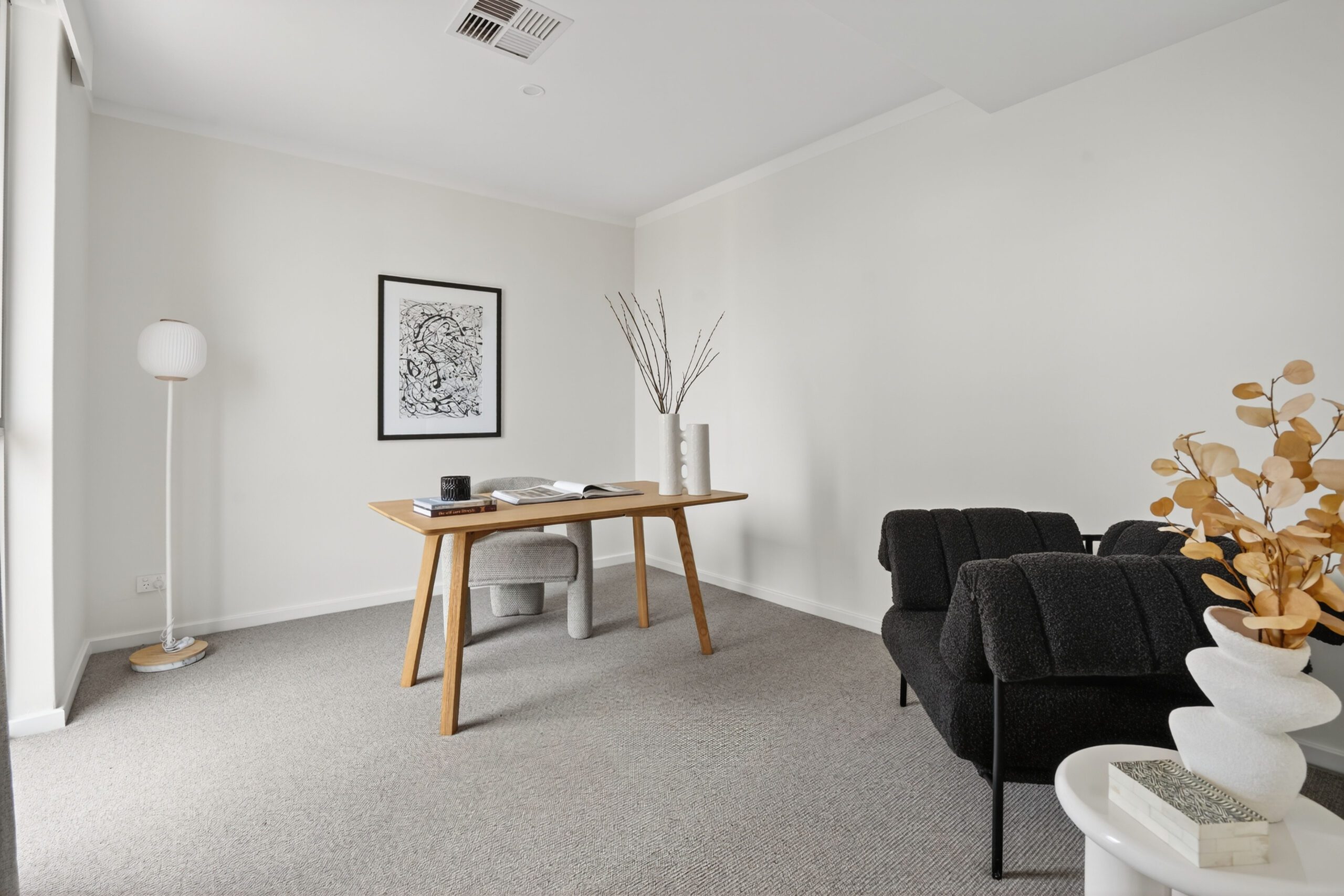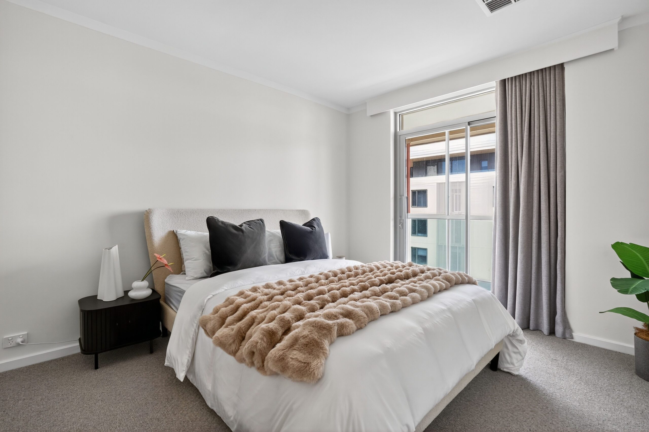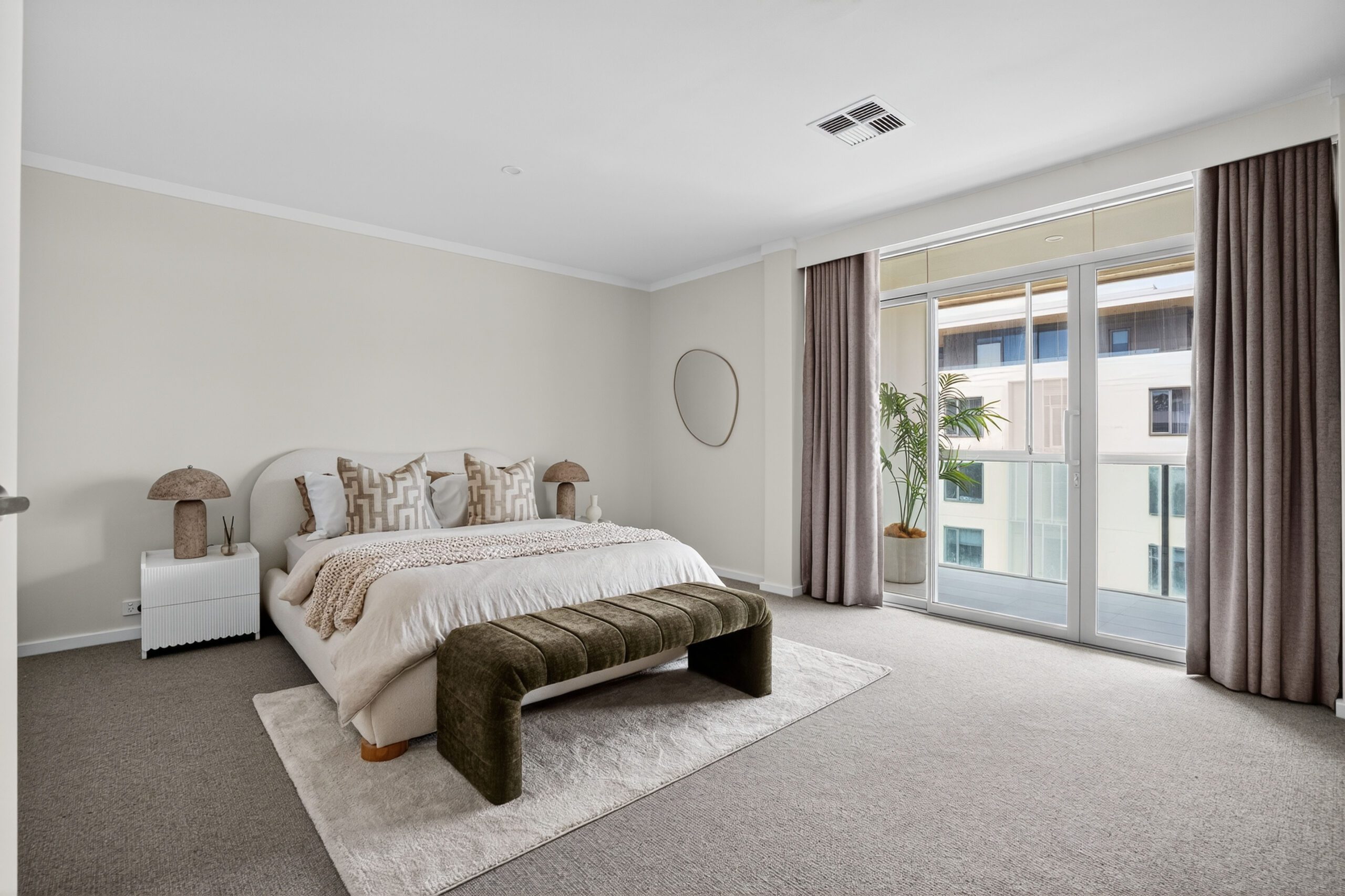 Beyond the secure, light-filled lobby, take the new lift to the top floor – Level Five. Inside, an elegant neutral palette is simply stunning against engineered timber floors and floods of natural light. To the right, the kitchen is magnificent. Engineered stone benchtops and splashbacks, LED strip lighting, and a suite of fully integrated appliances including Miele dual ovens, induction cooktop, and dishwasher, together with a Qasair rangehood, integrated fridge/freezer, wine fridge, and scullery concealing a discreet Euro-style laundry.