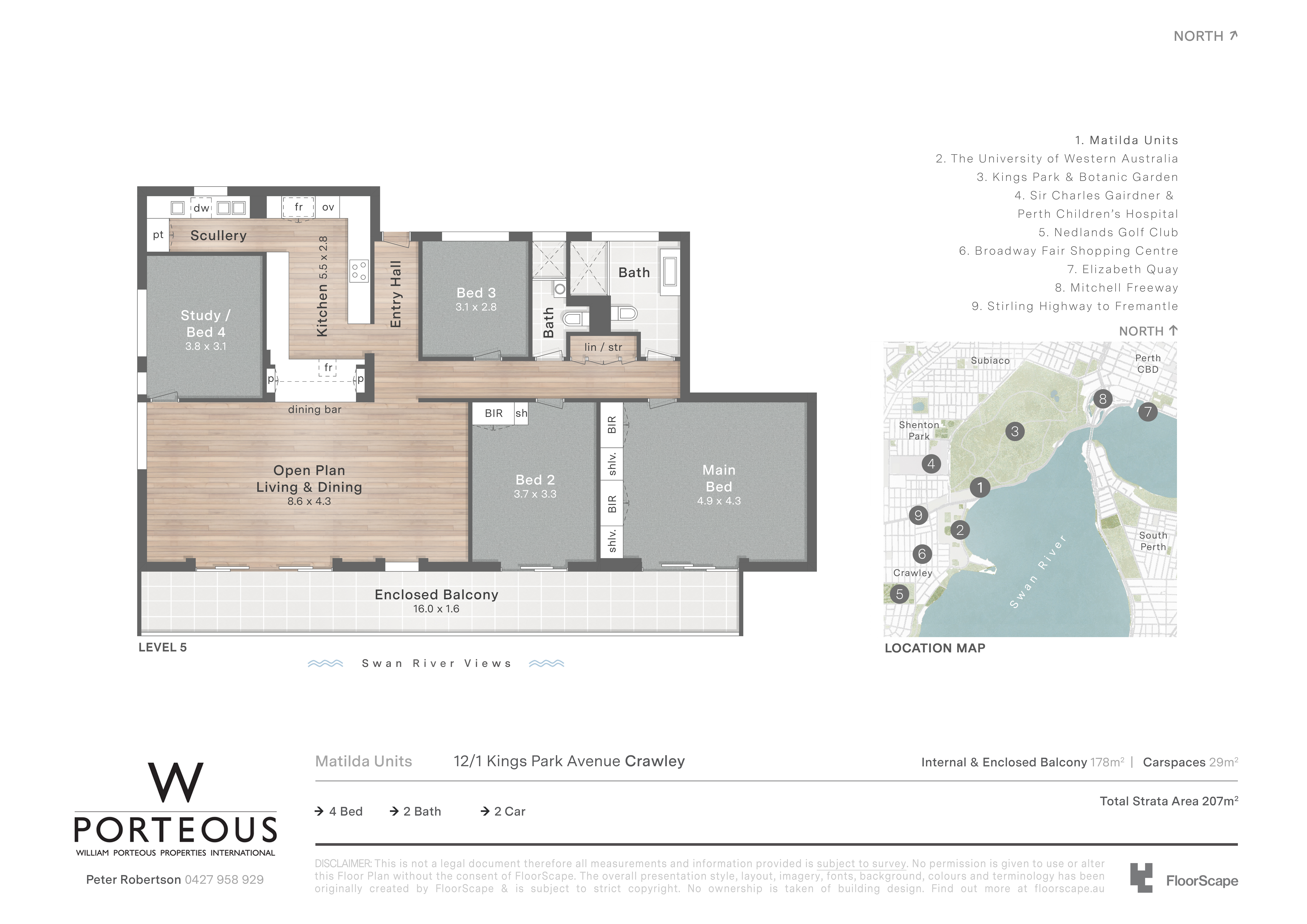 Featuring an enviable 178sqm of internal space completely reimagined to feel every bit a forever home, the flexible floor plan encompasses 3 large bedrooms, a study or 4th bedroom, 2 bathrooms, an exquisite kitchen with scullery/European laundry, and an open-plan living and dining. The incredible south-facing, enclosed balcony spans the length of the apartment, taking in vistas of the Swan River, Matilda Bay, Kings Park, South Perth, and beyond.