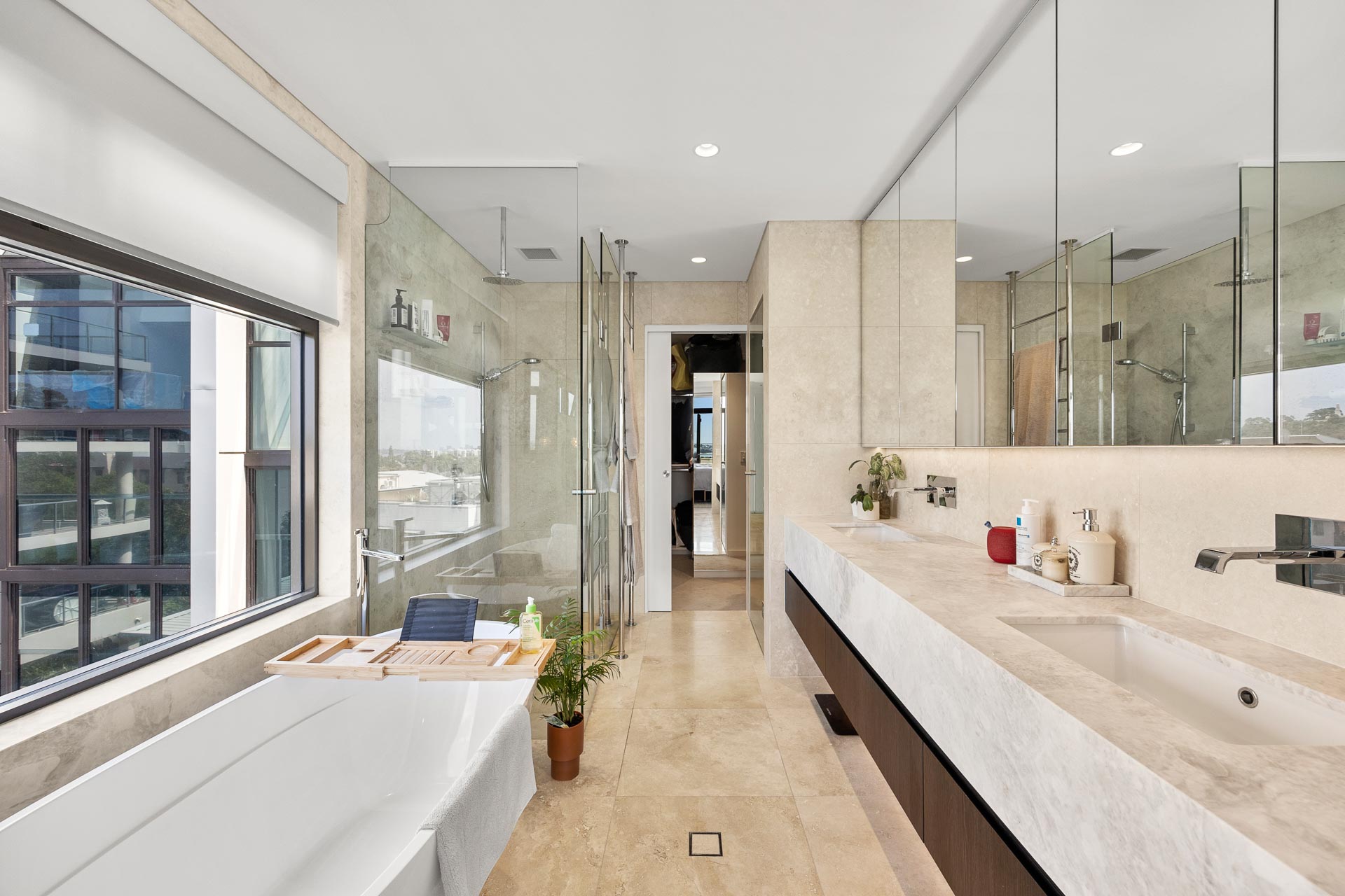 Behind this space is the third bedroom with ensuite and the bonus of a kitchenette, crafted specifically for versatility – it can be locked off from the main living areas and has its own internal hallway entry, allowing for either a carers’ room or guest wing, or perhaps a perfect privacy option for a young adult. With awe-inspiring views of the South Perth foreshore and the nearby hub of the city centre, the main bedroom enjoys an opulent ensuite featuring a luxe tub bath, double vanity, floor-to-ceiling heated towel rail and large shower with a separate rain shower head. Extensive walk-in robes with dedicated storage and ample hanging space are a continuation of the attention to detail so prevalent within this property.