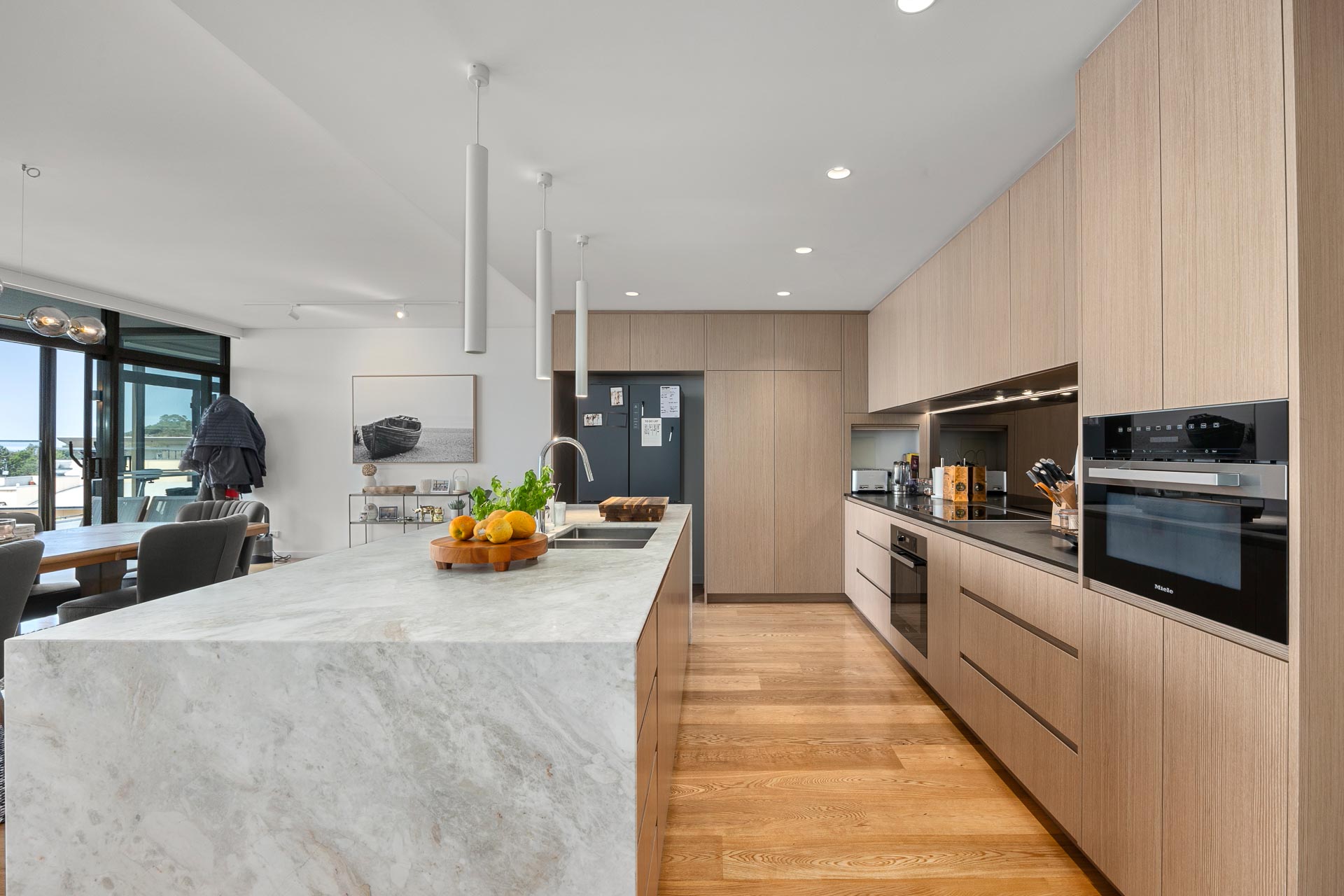 The quality is consistent throughout, boasting either recessed or elegant pendant lighting, built-in or walk-in robes, ducted reverse cycle air conditioning, block-out and sheer window treatments, and fully tiled bathrooms with premium tapware and frameless showers. In the contemporary kitchen itself, a full suite of Miele appliances and a Fisher and Paykel double fridge is complemented by a quality stone benchtop/breakfast bar and, adjoining, a dedicated laundry, also with a Miele washer/dryer if required.
