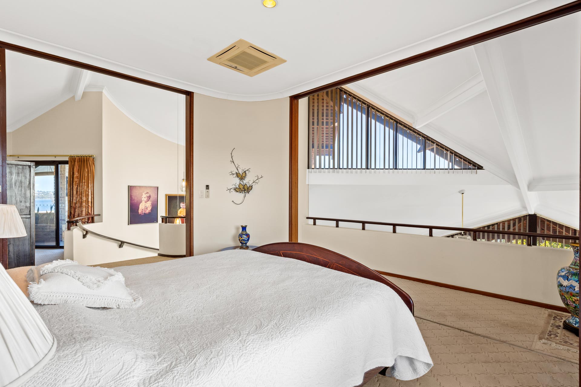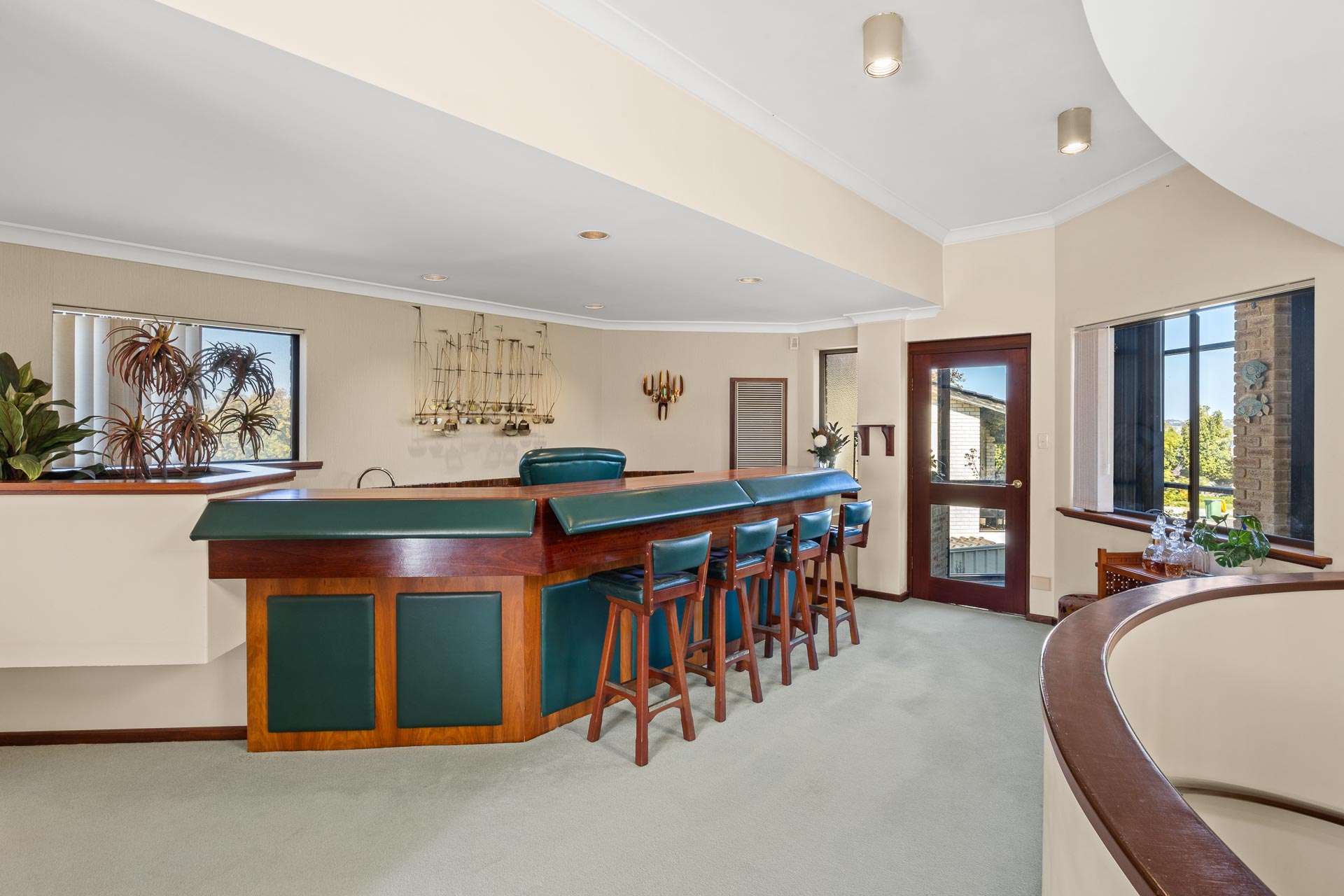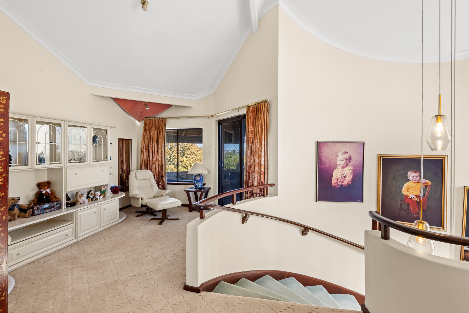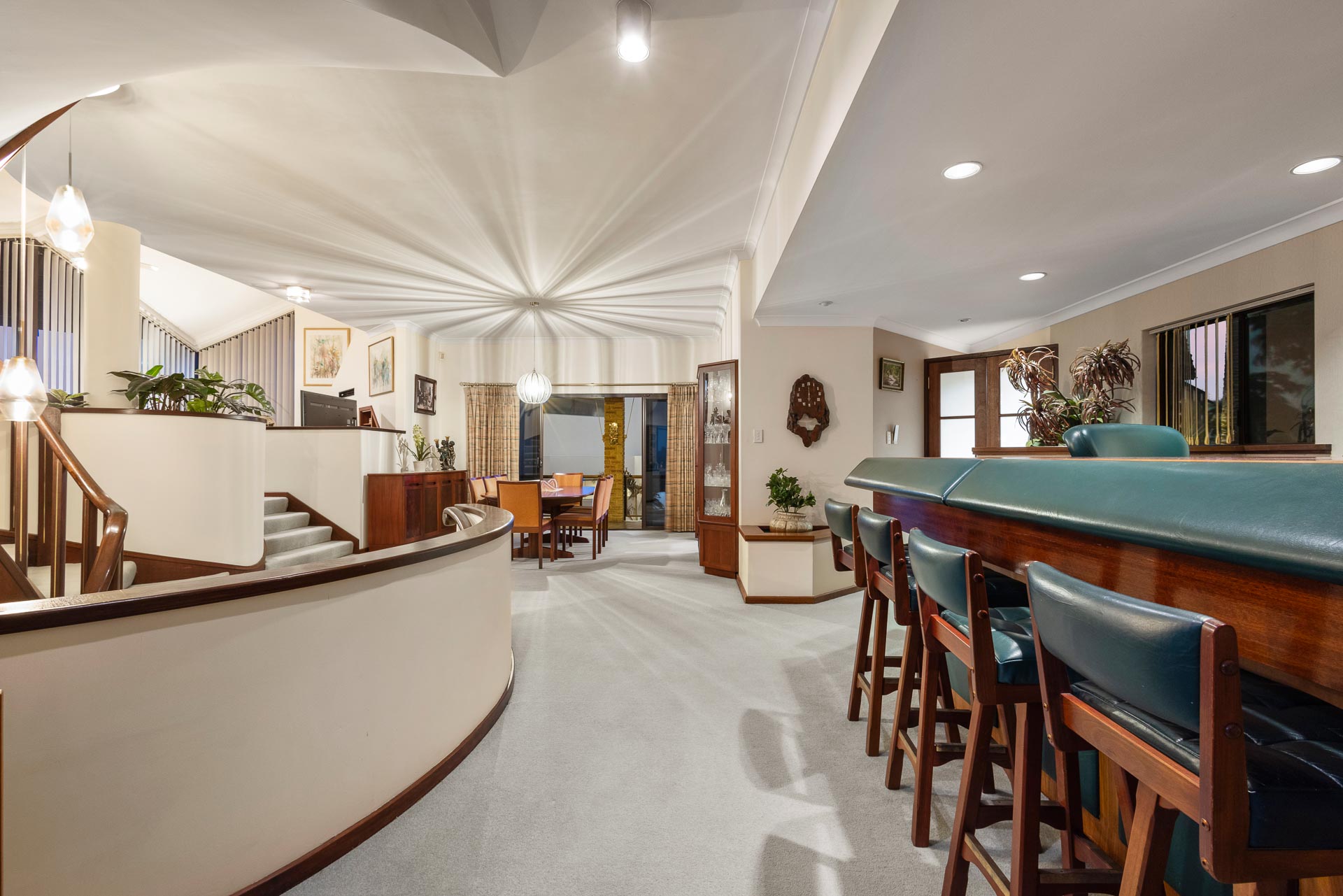 A classic hallmark of designs of its era, this home features a striking multi-level circular staircase that provides an element of old school cool and sweeps from ground floor to the first floor living space and onwards up to the parents’ retreat.
