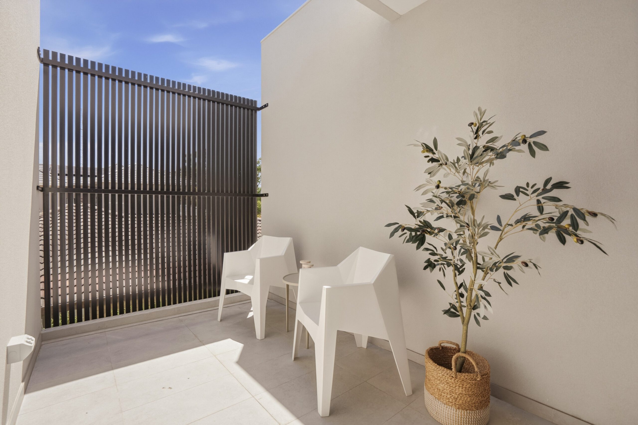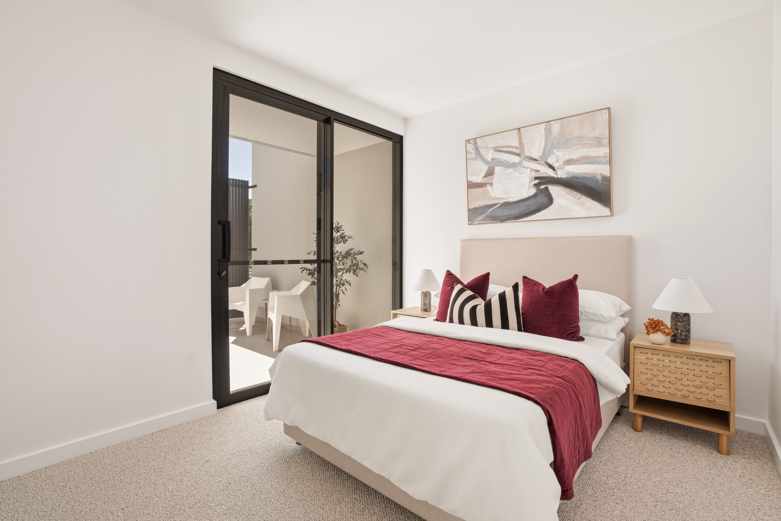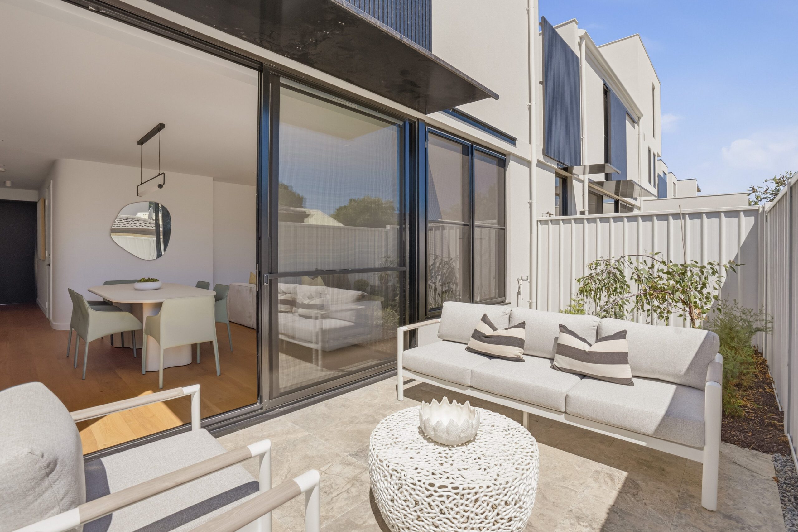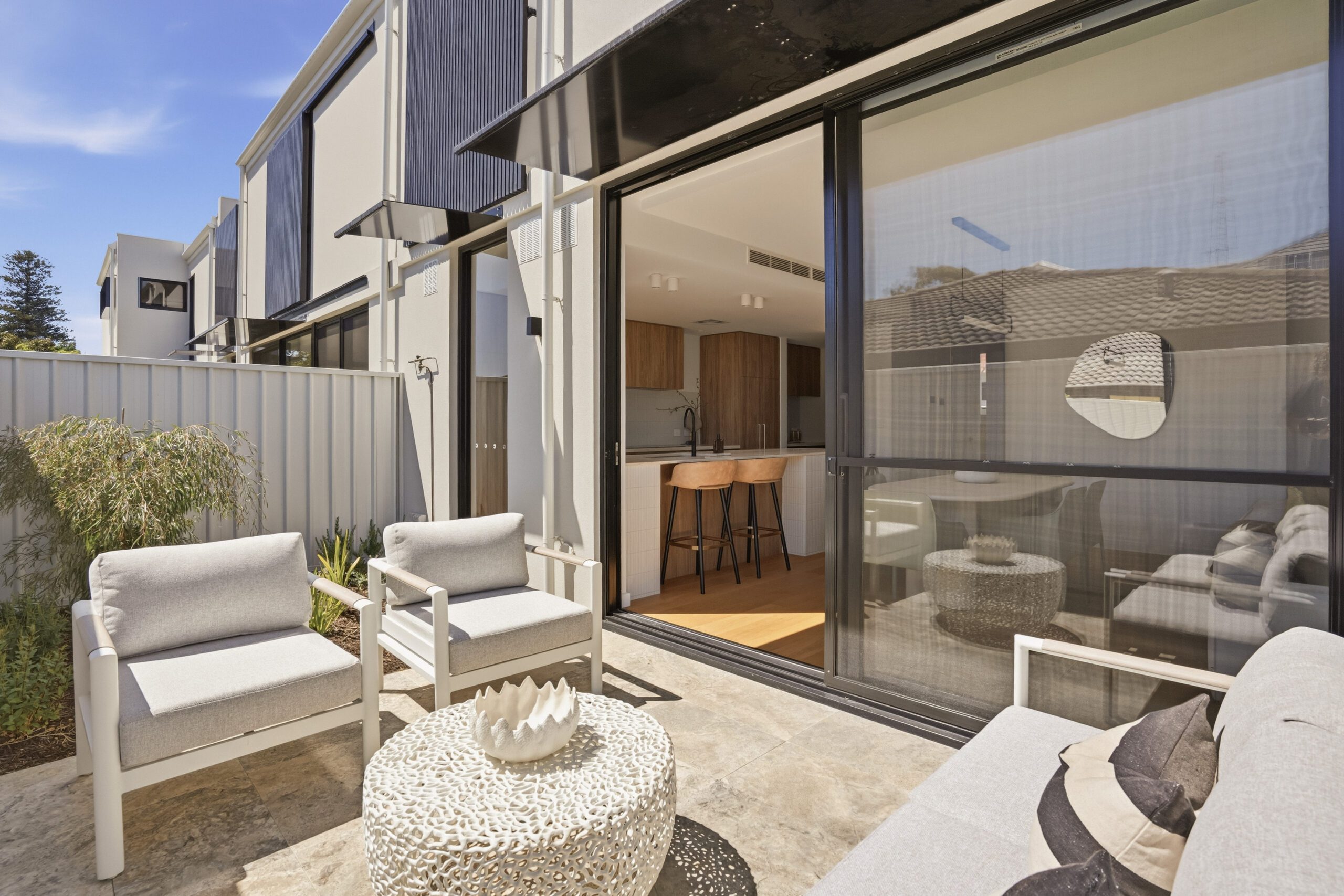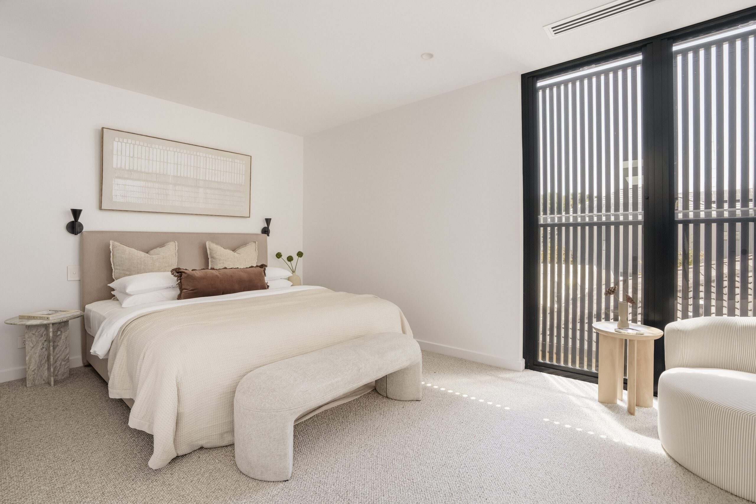 A private north-facing courtyard with travertine stone paving and reticulated garden beds, is a feature of the ground floor, beautifully connected to the main kitchen/lounge/dining areas.