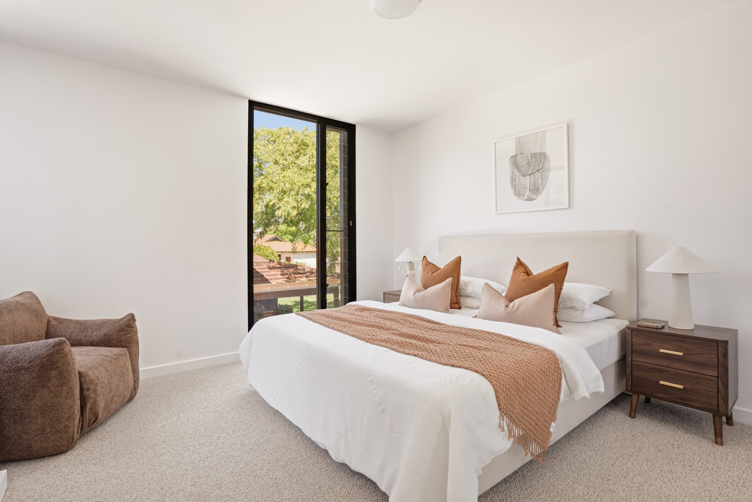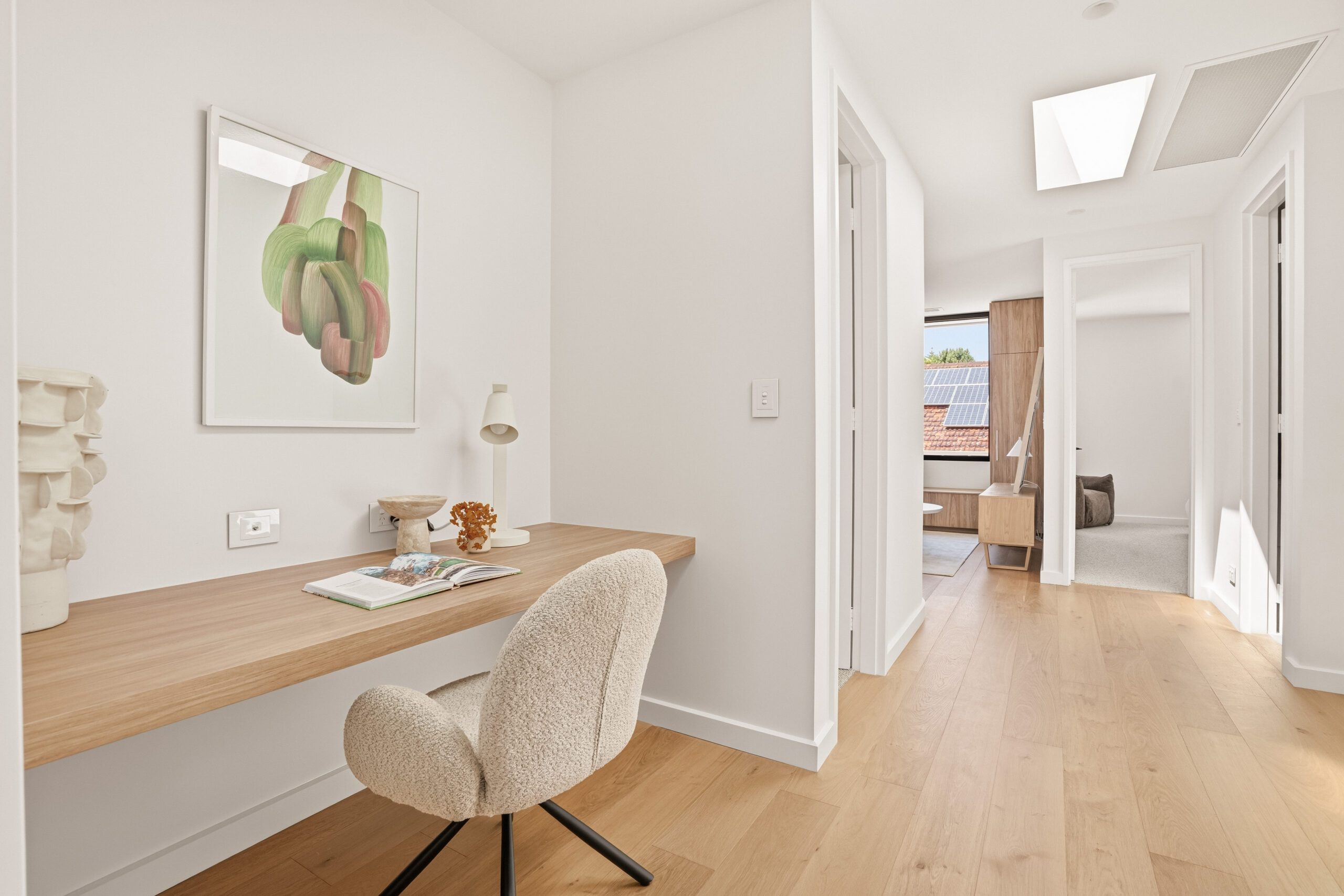 The generous open-plan living and dining room feature timber floors opening onto a private north-facing courtyard. The gourmet kitchen is beautifully finished with stone benches, Miele appliances, and an integrated fridge/freezer. The cleverly designed scullery also incorporates the laundry. Your ground-floor living area also has easy access to a separate powder room.