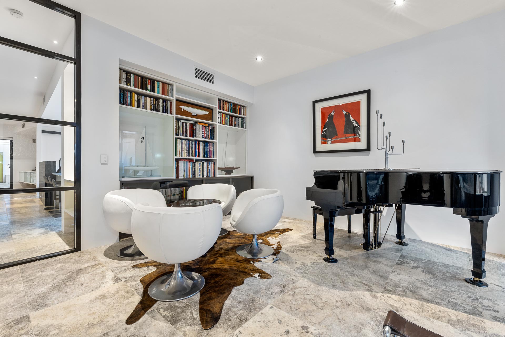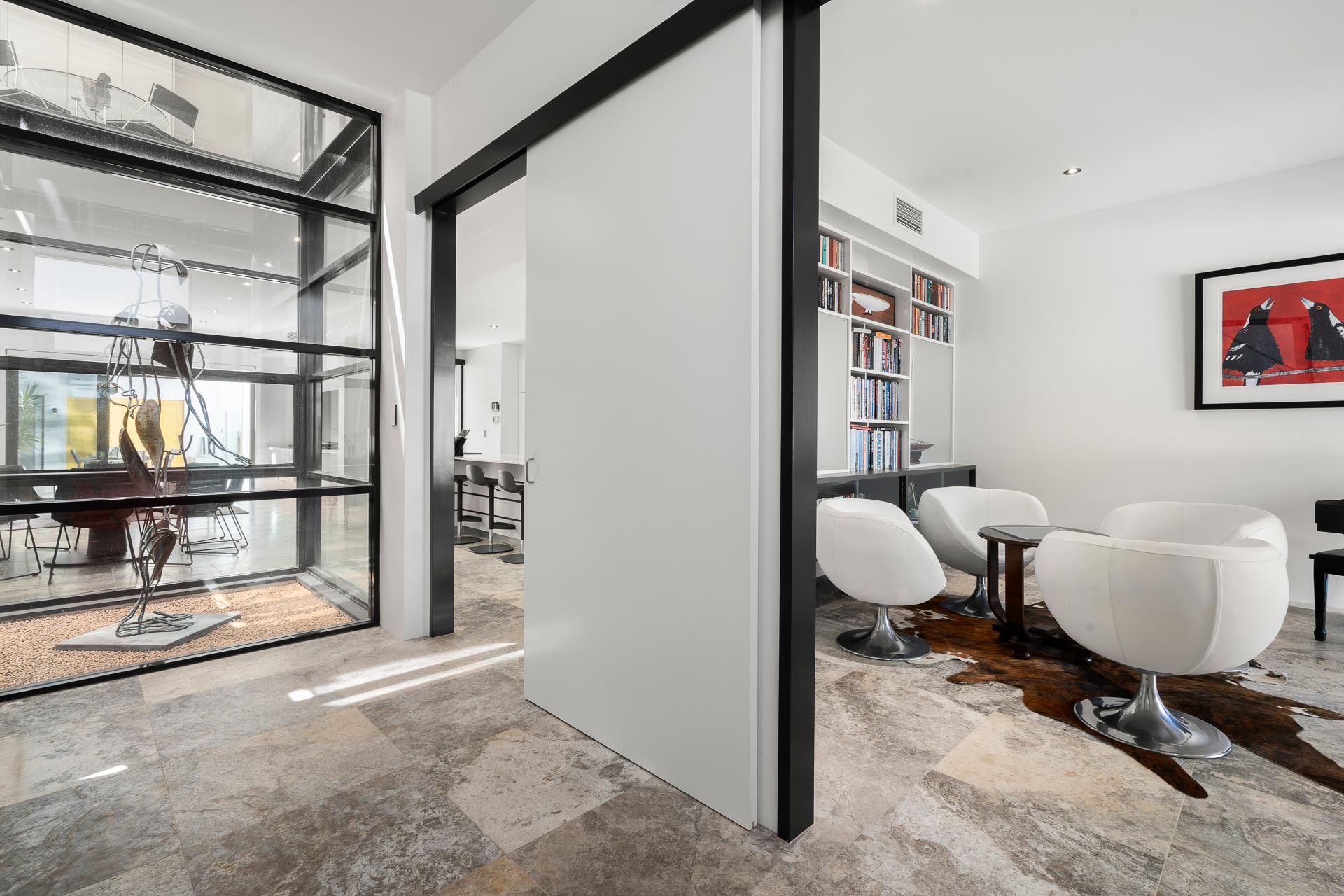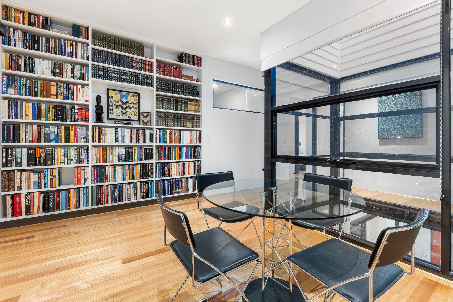 The front lounge room features extensive built-in library shelving, with additional space for your reading collection in the study/living area at the landing on the second level. Upstairs, glossy Tasmanian Oak timber flooring strikes a perfect balance with the chic industrial tone of the glass air shaft, travertine and bare concrete feature walls.