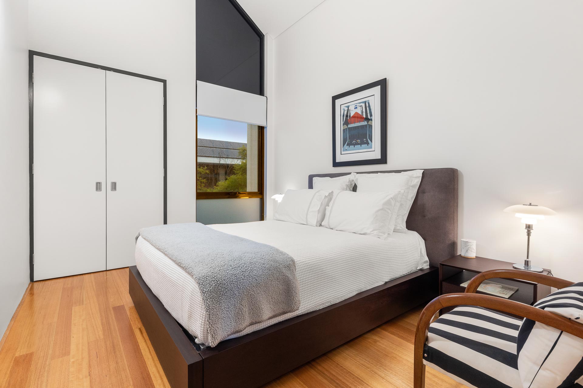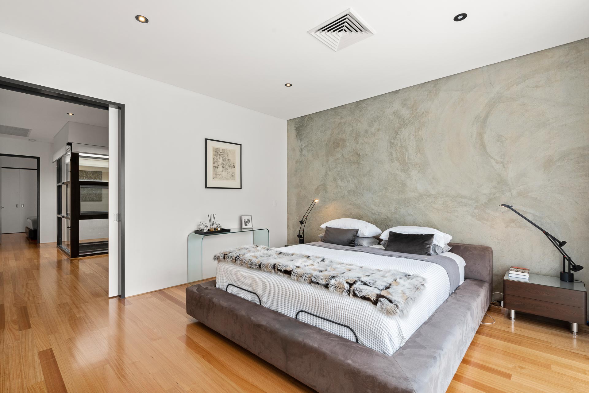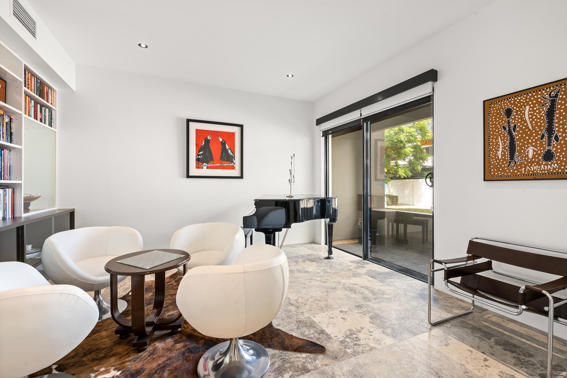 The front lounge room features extensive built-in library shelving, with additional space for your reading collection in the study/living area at the landing on the second level. Upstairs, glossy Tasmanian Oak timber flooring strikes a perfect balance with the chic industrial tone of the glass air shaft, travertine and bare concrete feature walls.