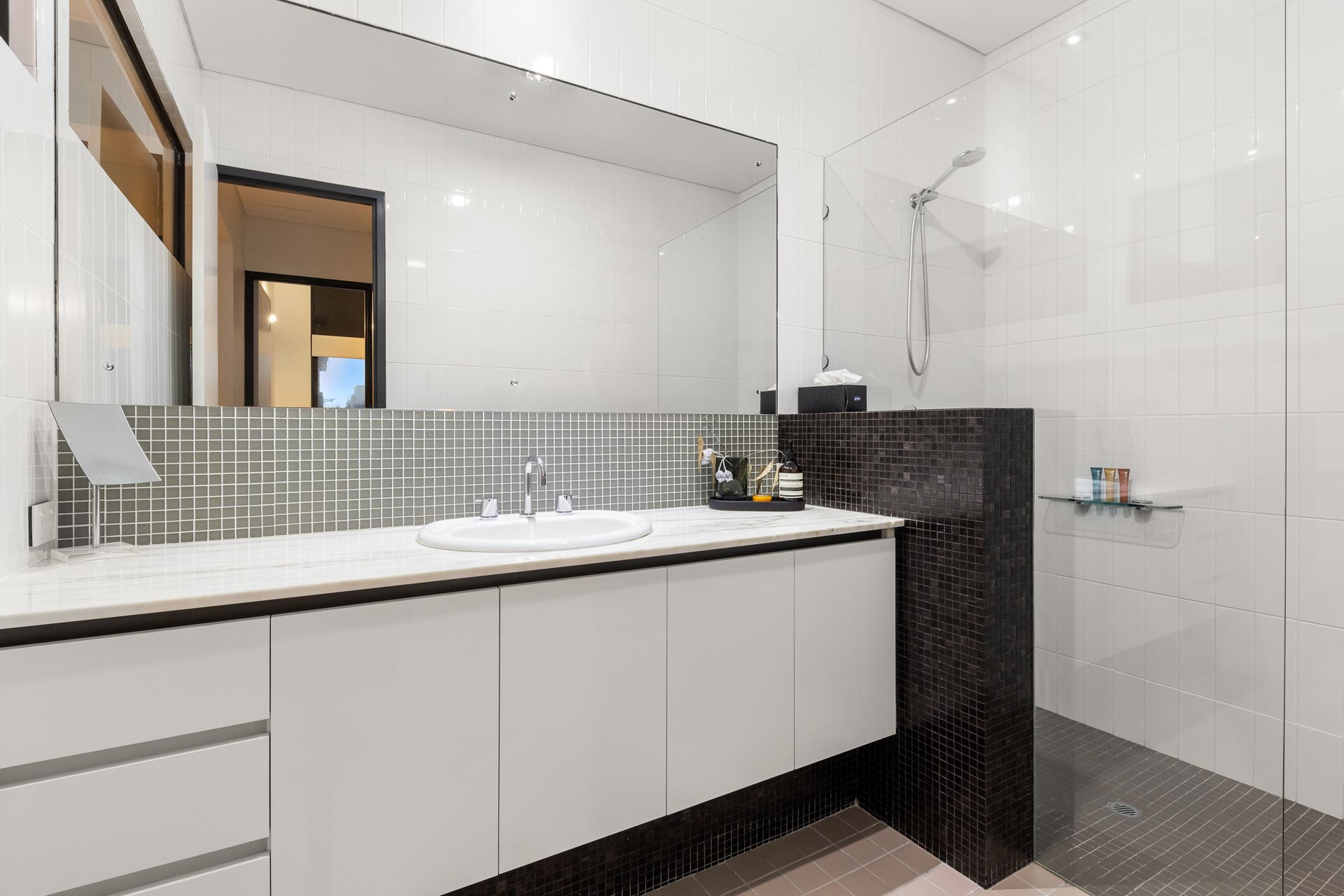 The two generous secondary bedrooms have stunning raked ceilings, built-in robes and double roller blinds, and one has a private balcony. They share a luxe, fully-tiled bathroom that showcases a Calcutta stone-topped vanity and a frameless shower.
