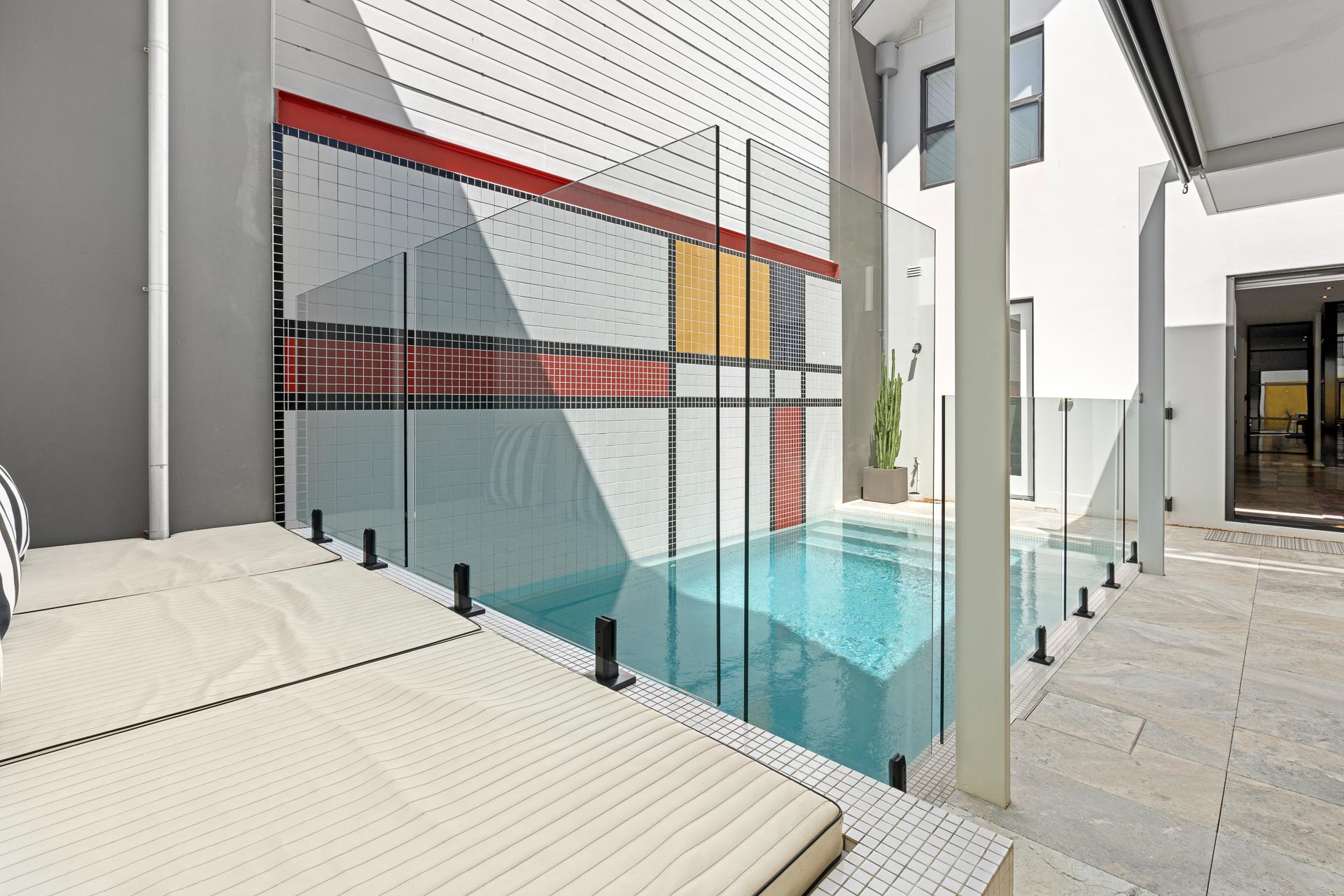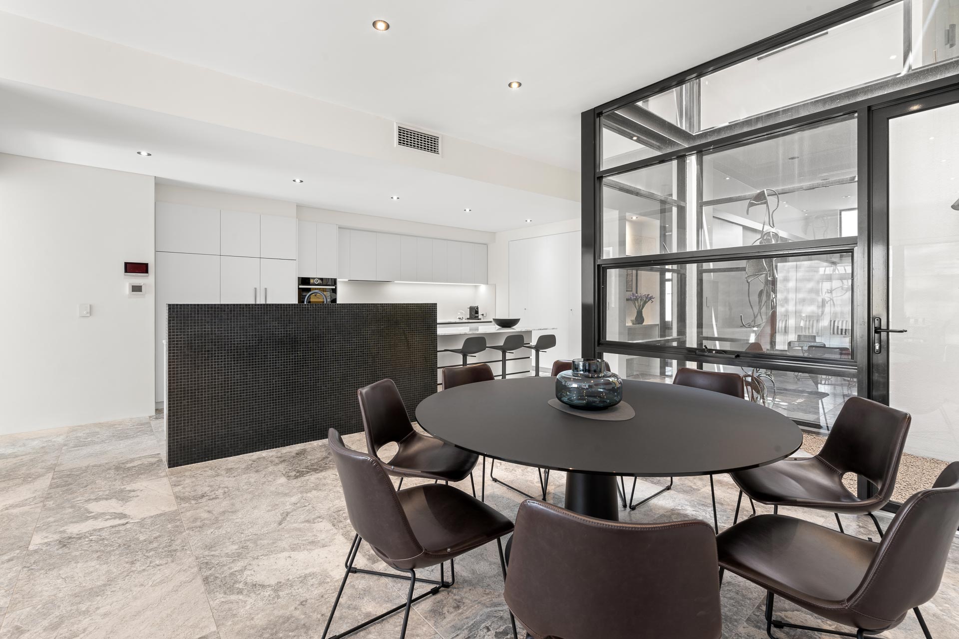 Via the front entrance, beautiful silver travertine flooring flows through the lower internal level and out to the spacious covered alfresco area. The central courtyard is very special. It is absolutely private and we have a stunning solar-heated, saltwater pool, complete with swim and spa jets, frameless glass balustrading and a mosaic-tiled feature wall. As the current owners do, you’ll likely use the alfresco entertaining area more than the internal kitchen. With a huge pergola, built-in BBQ, cooktop, and shade blind, you can relax and entertain in this resort-style space throughout the seasons.