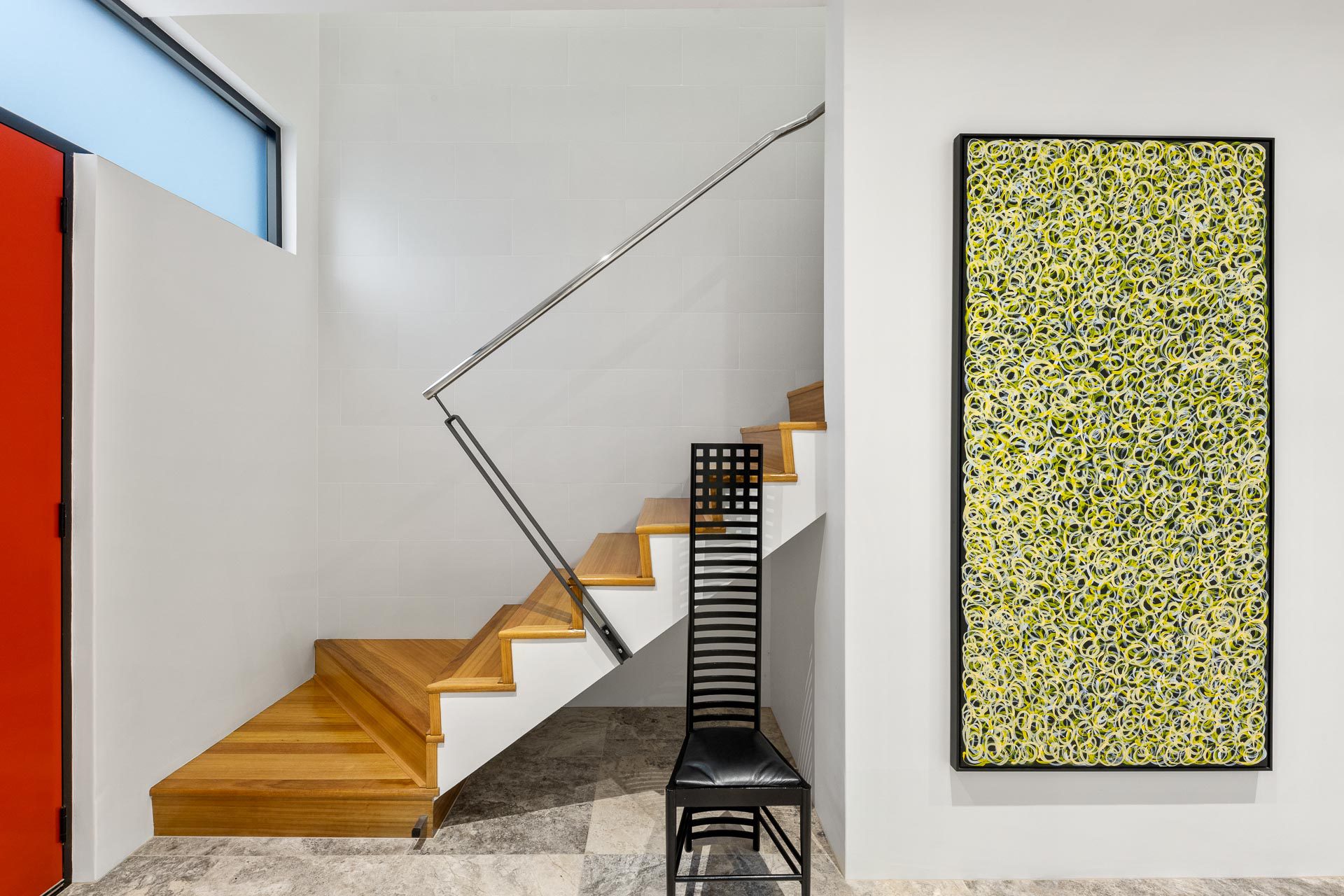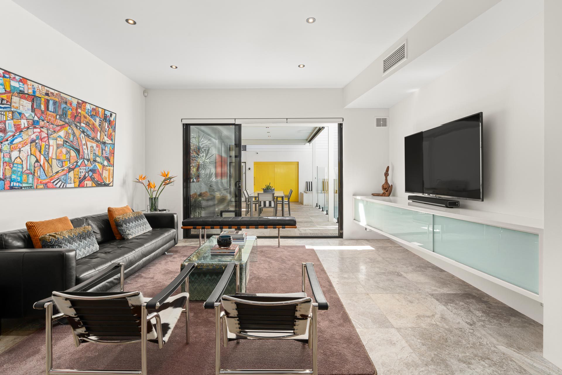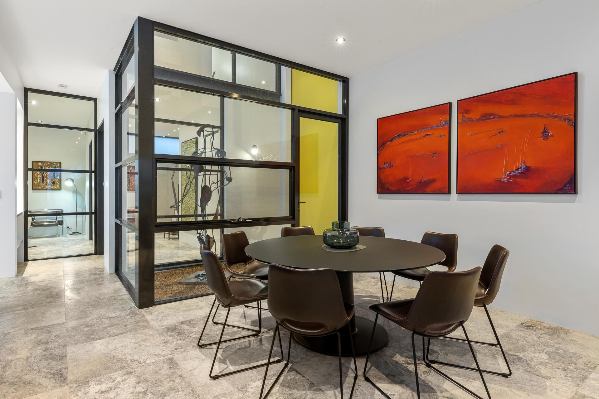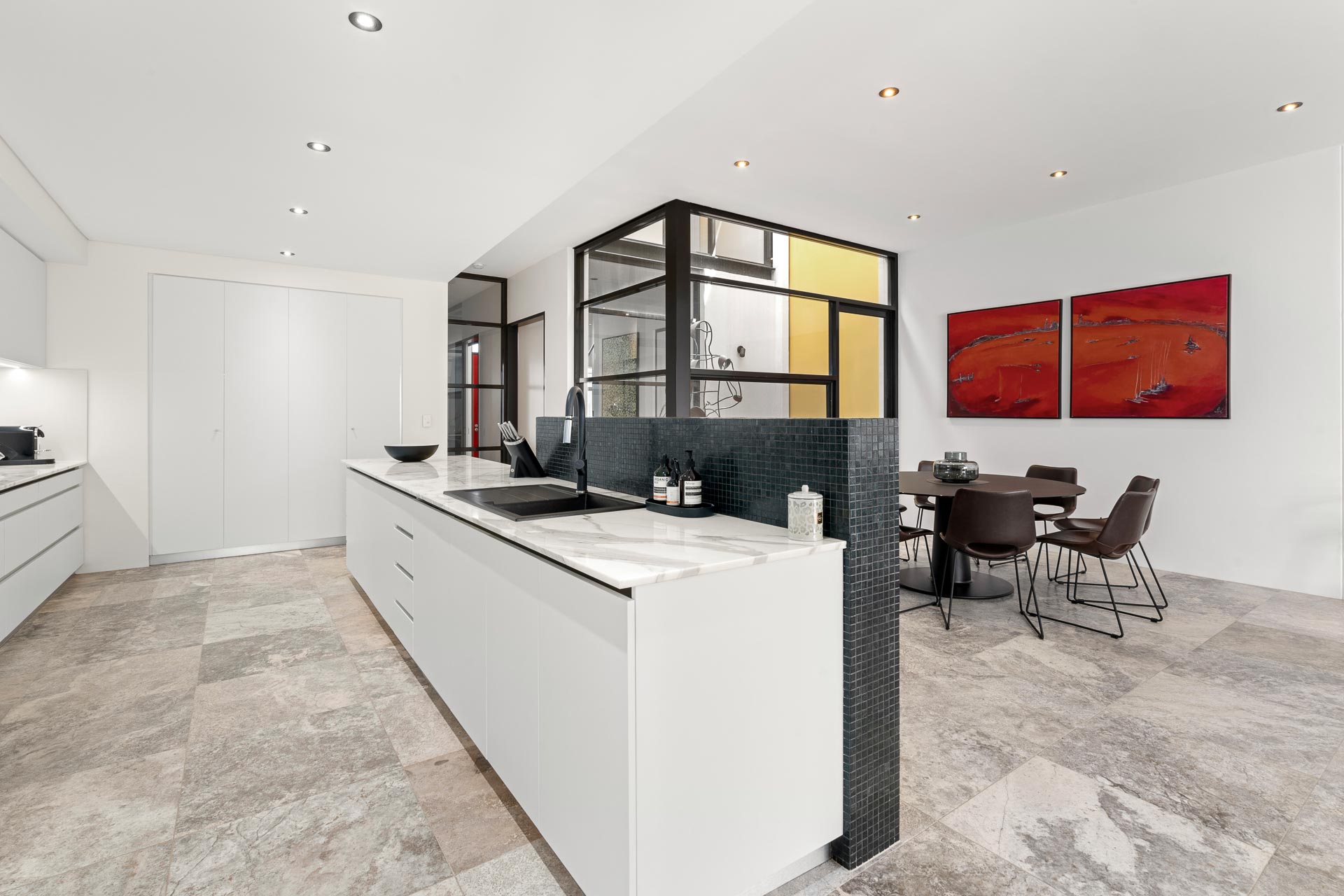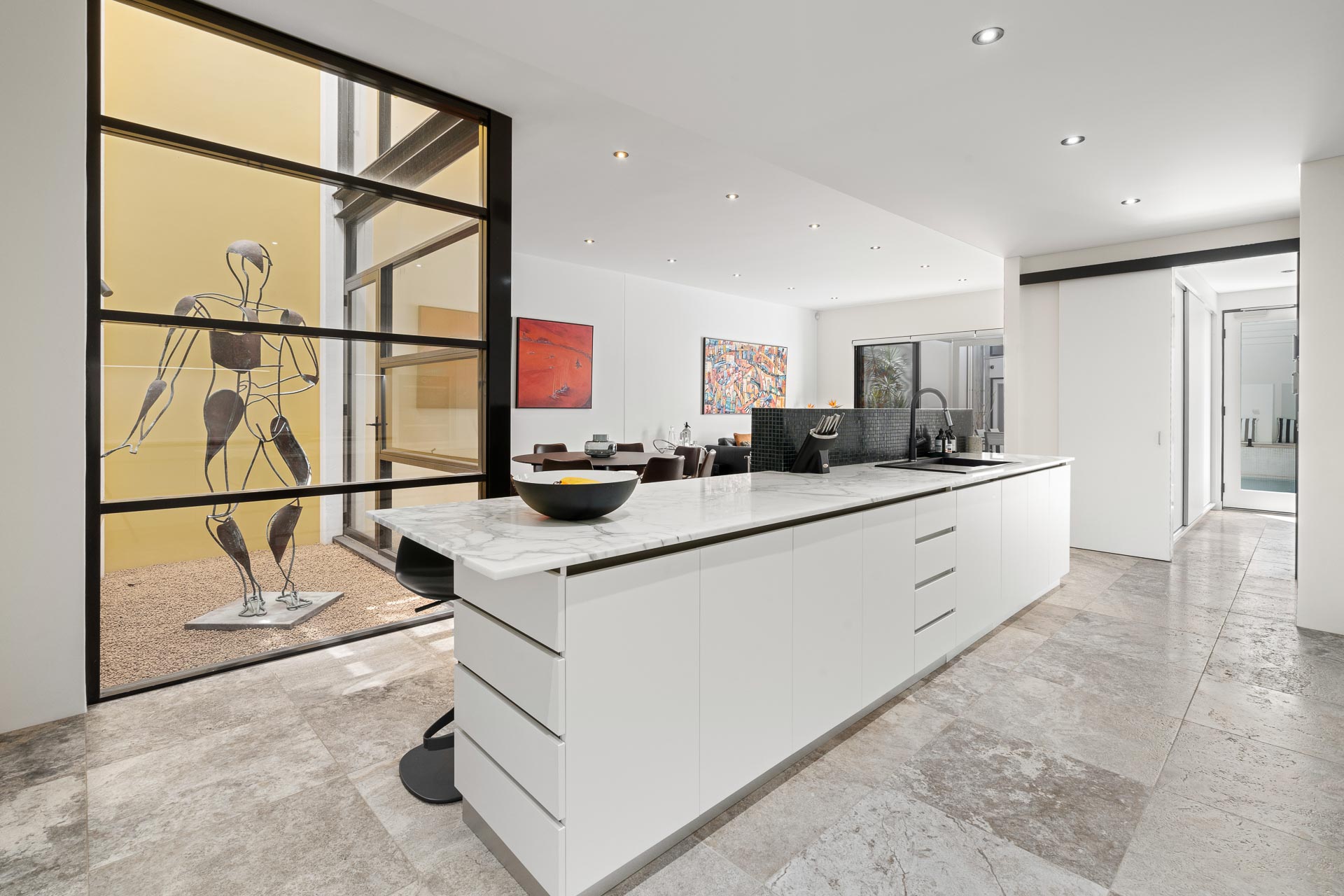 Crafted from solid concrete tilt slabs, it’s one of the few properties in the area with a swimming pool, and the quality of construction is evident throughout the home. Three-metre (approx) ceilings to each level and an impressive full-height glass air shaft featuring a striking 8-foot copper sculpture by Ben Juniper fill the house with abundant natural light.