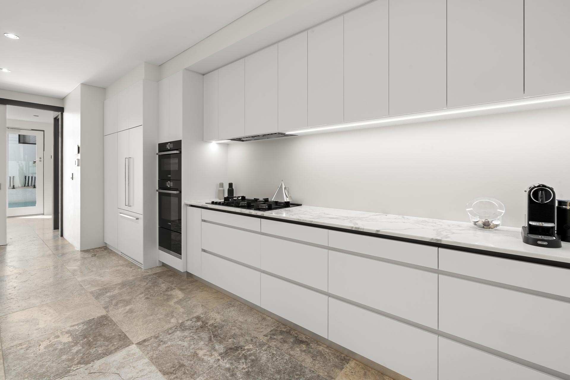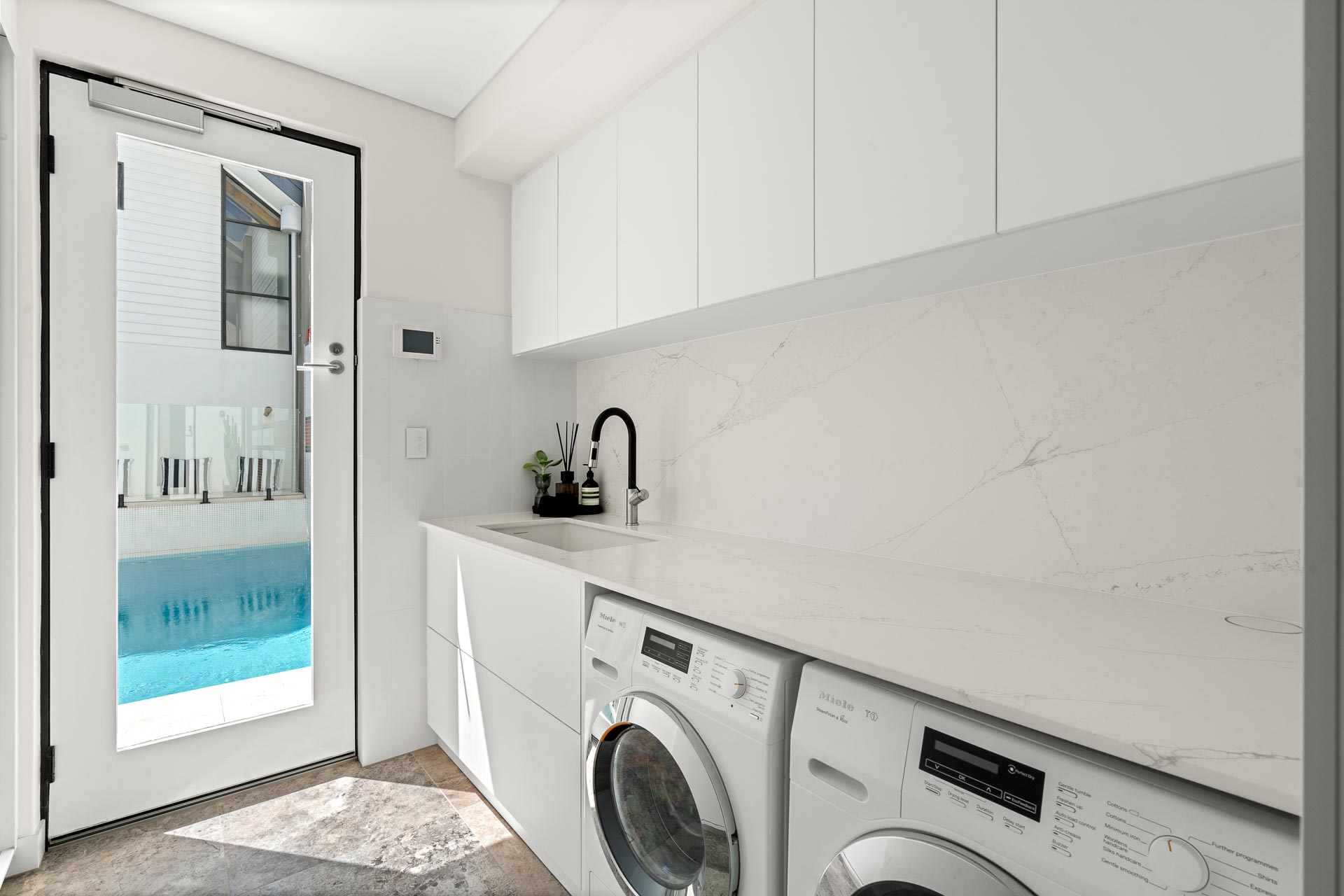 Back inside, the epic kitchen has sleek marble benches and Dekton splashbacks, a suite of high-end fully-integrated appliances, soft-closing drawers, push-to-open cabinets and an extra-large pantry that sits neatly behind bi-fold doors. Central to the open-plan living and dining area, with a clear view of the alfresco, you’ll remain connected to your family and friends while catering up a storm. The adjacent and freshly renovated laundry and powder room will also impress, with wall-to-wall linen storage, a chute, an extra large ceramic trough, Silas stone bench and convenient pool access.