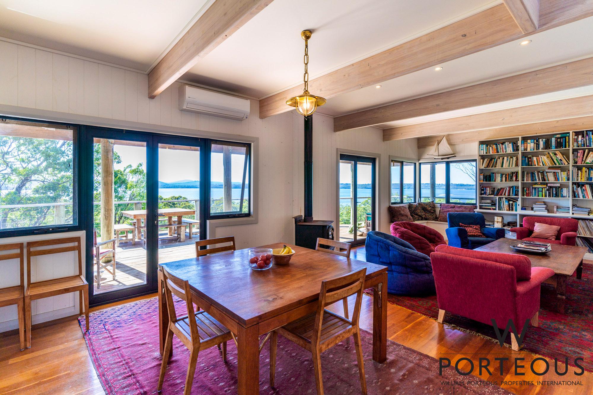 The drive swings up onto an elevated ridge and then guides you up to the main residence, a two storey house, perched above the trees, at the summit of a large hill. Lovingly crafted of timber and designed to make the most of the stunning vista over the surrounding forest, to the seeping sparkling expanse of the inlet in a 180 degree arc.