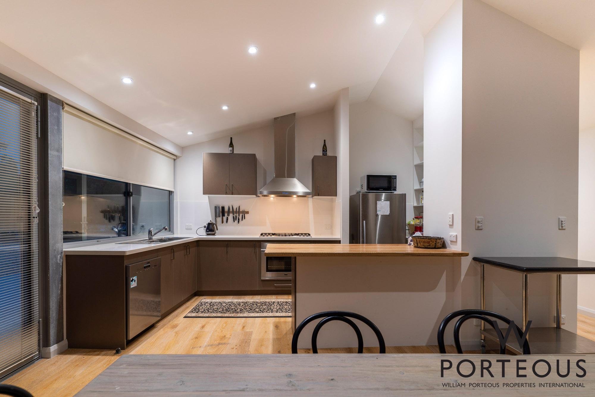 Downstairs we have the main common lounge and dining room off the kitchen, and all opening onto the curved main outdoor entertaining deck, all perfectly positioned and orientated to take in the view and be protected from the prevailing winds. With a fire for winter and reverse cycle air-conditioning for summer, it’s welcoming and comfortable year-round. The kitchen is well equipped with ample bench space, storage, a pantry, oven and gas cooktop. This is the central gathering point of the house. Charming, relaxed and comfortable.