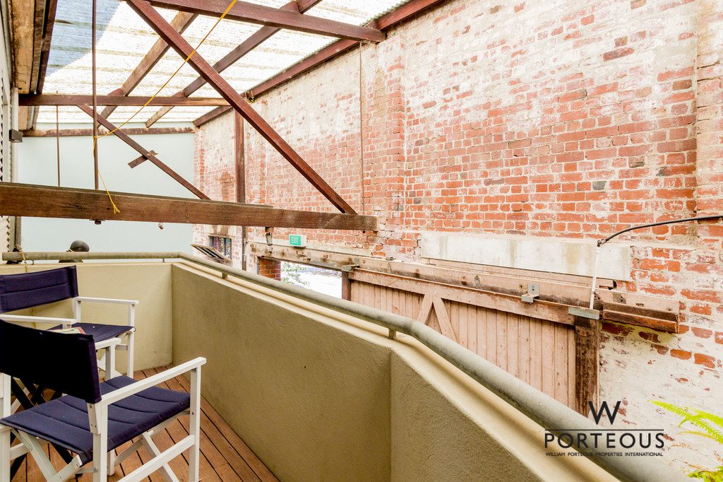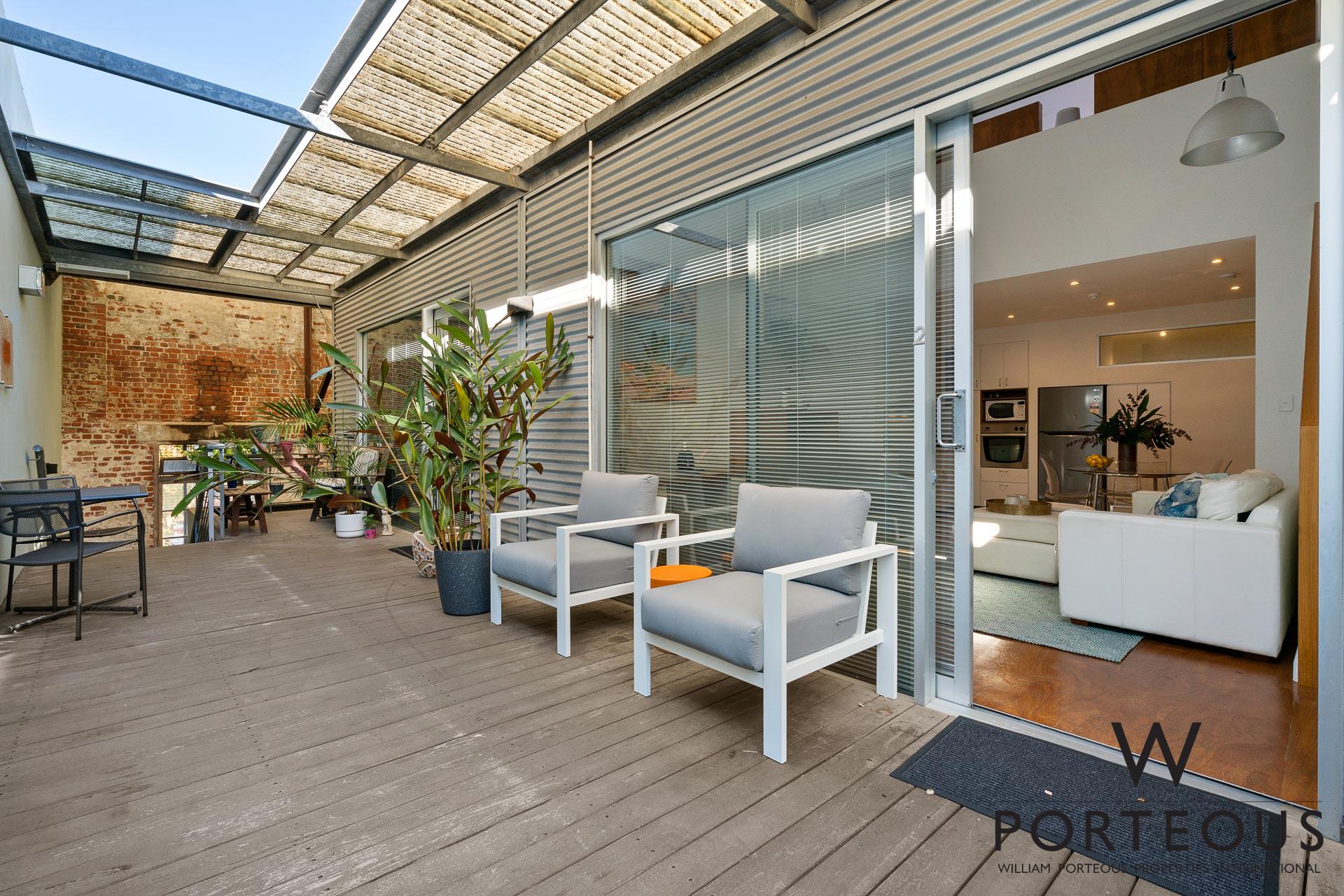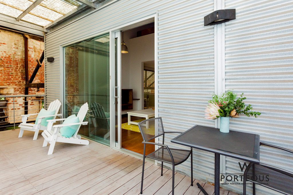 The main living space is light-filled and open, with lofted ceilings and a spectacular Marri staircase. Natural light pours in through the double sliding doors that lead out onto the shared alfresco. Tucked under the roof of the warehouse, the aged red brick and artfully worn wooden floor of the alfresco creates the perfect urban warehouse vibe. A relaxing spot to enjoy a glass of wine and entertain friends.