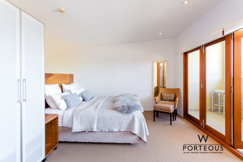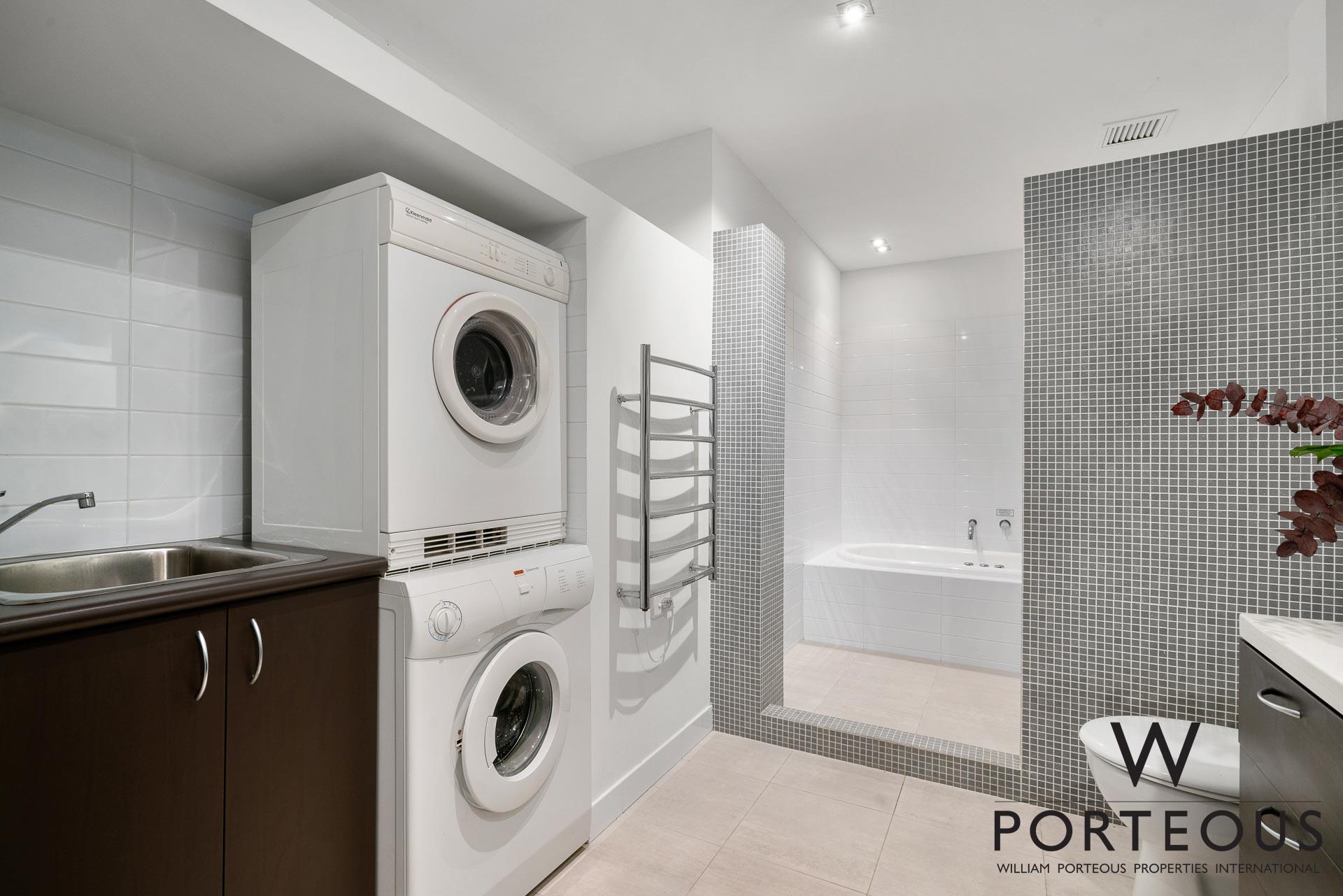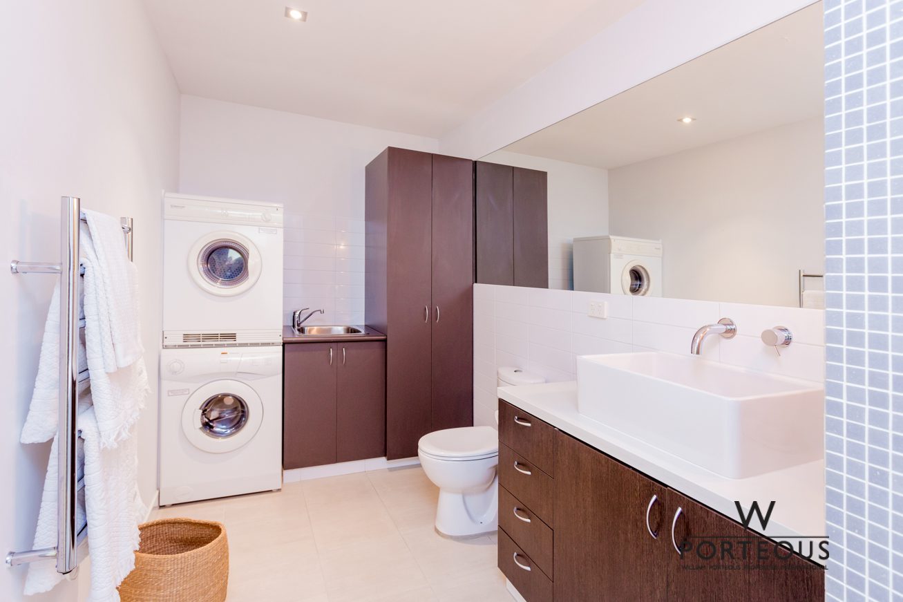 The king-sized mezzanine bedroom features bi-fold doors that lead out onto the second balcony. Generously sized, the bedroom is complete with a built-in media cabinet as well as customised cabinetry. The palatial bathroom features a luxurious spa bath, shower, and modern raised basin. The European-style laundry will easily cater for a washer and a dryer for optimum convenience.