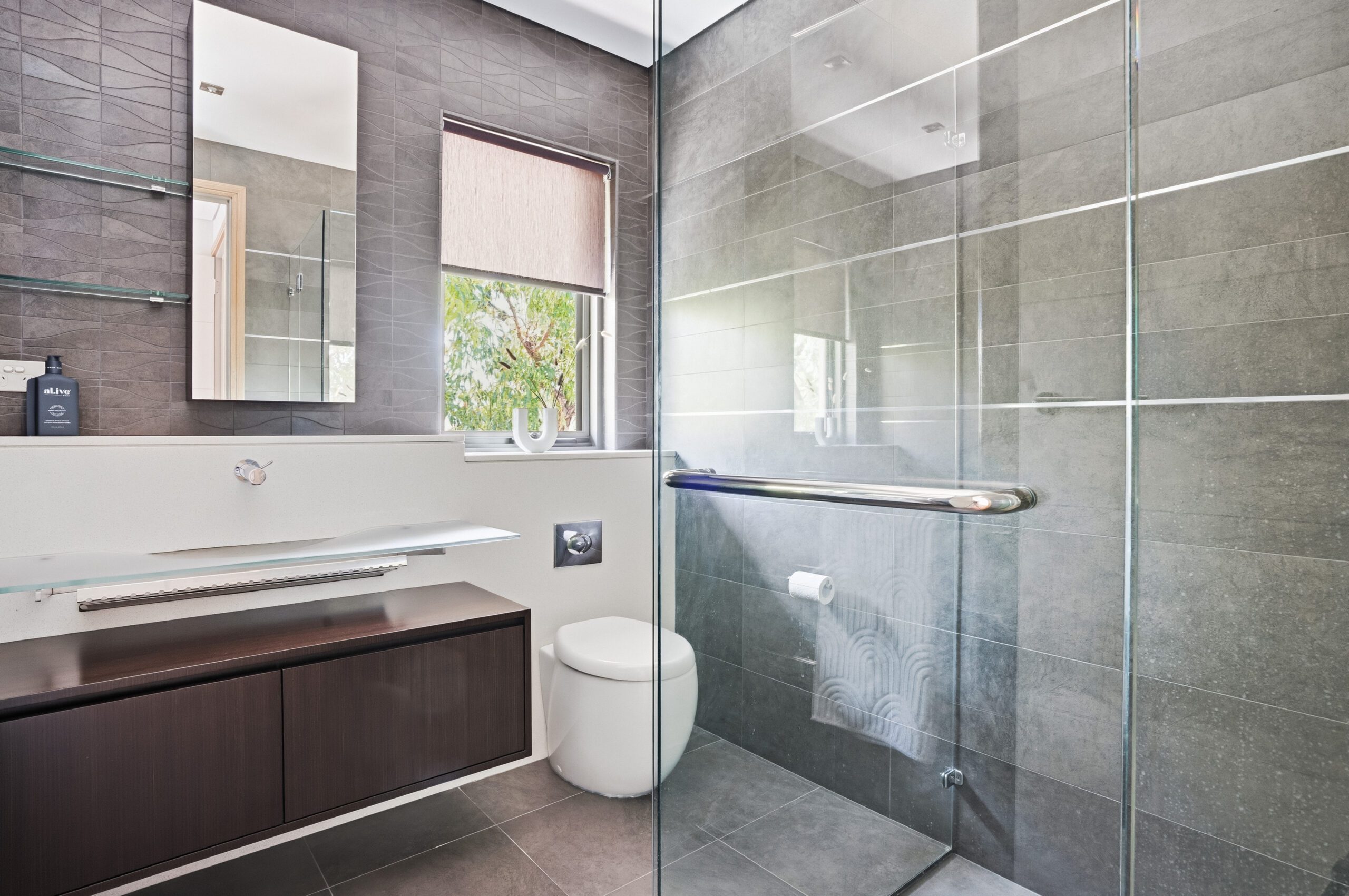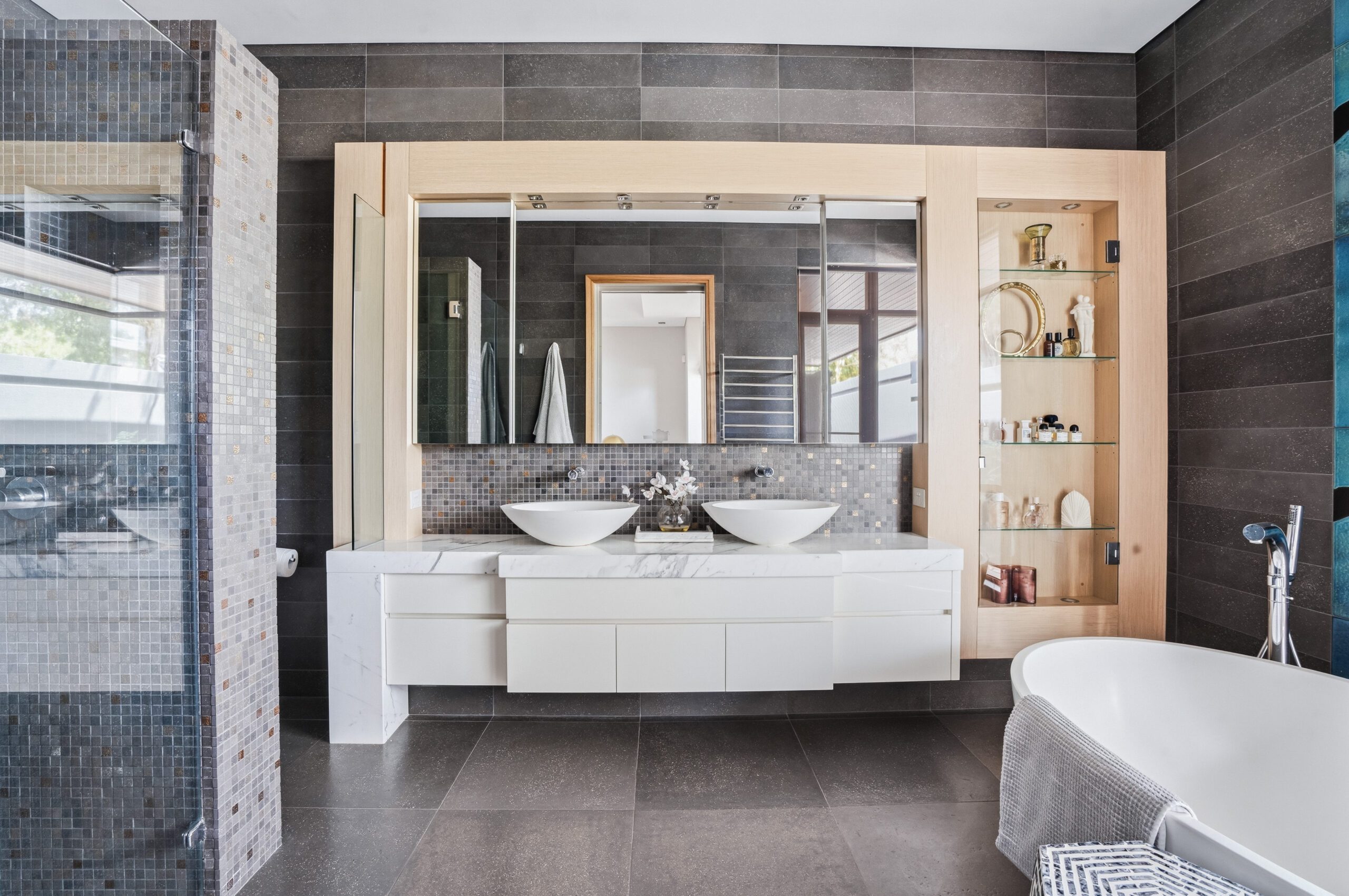 One of the many great features of this home is having the main bedroom suite on the ground floor. Large and stylish, it features a floating bed base and bedsides, a customised walk-in robe and a tranquil outlook over a Japanese-inspired private courtyard complete with a bubbling water feature. The resort-style ensuite completes this sanctuary with under-floor heating, frameless shower, free-standing tub, and floating marble vanity with twin sinks.