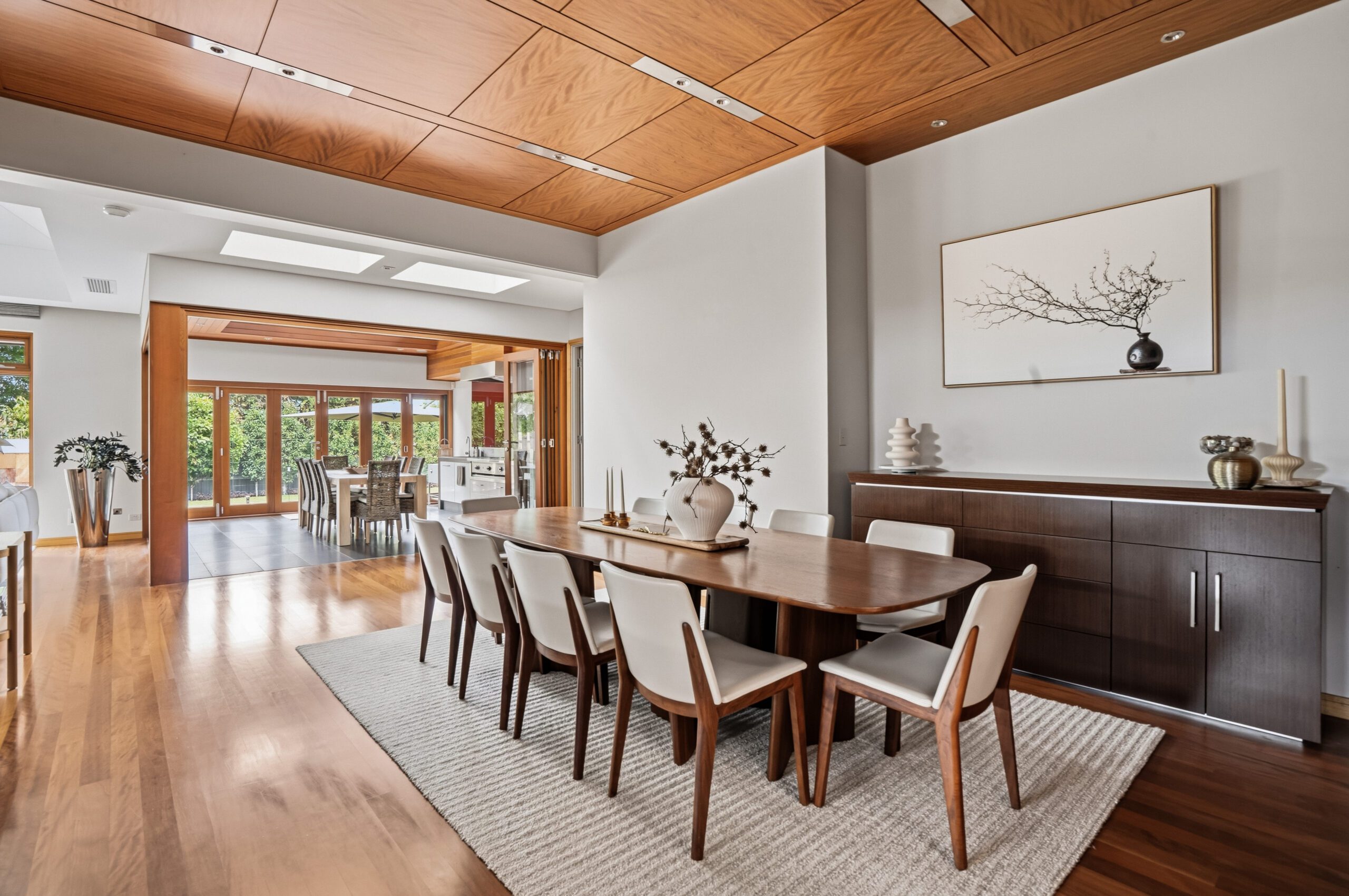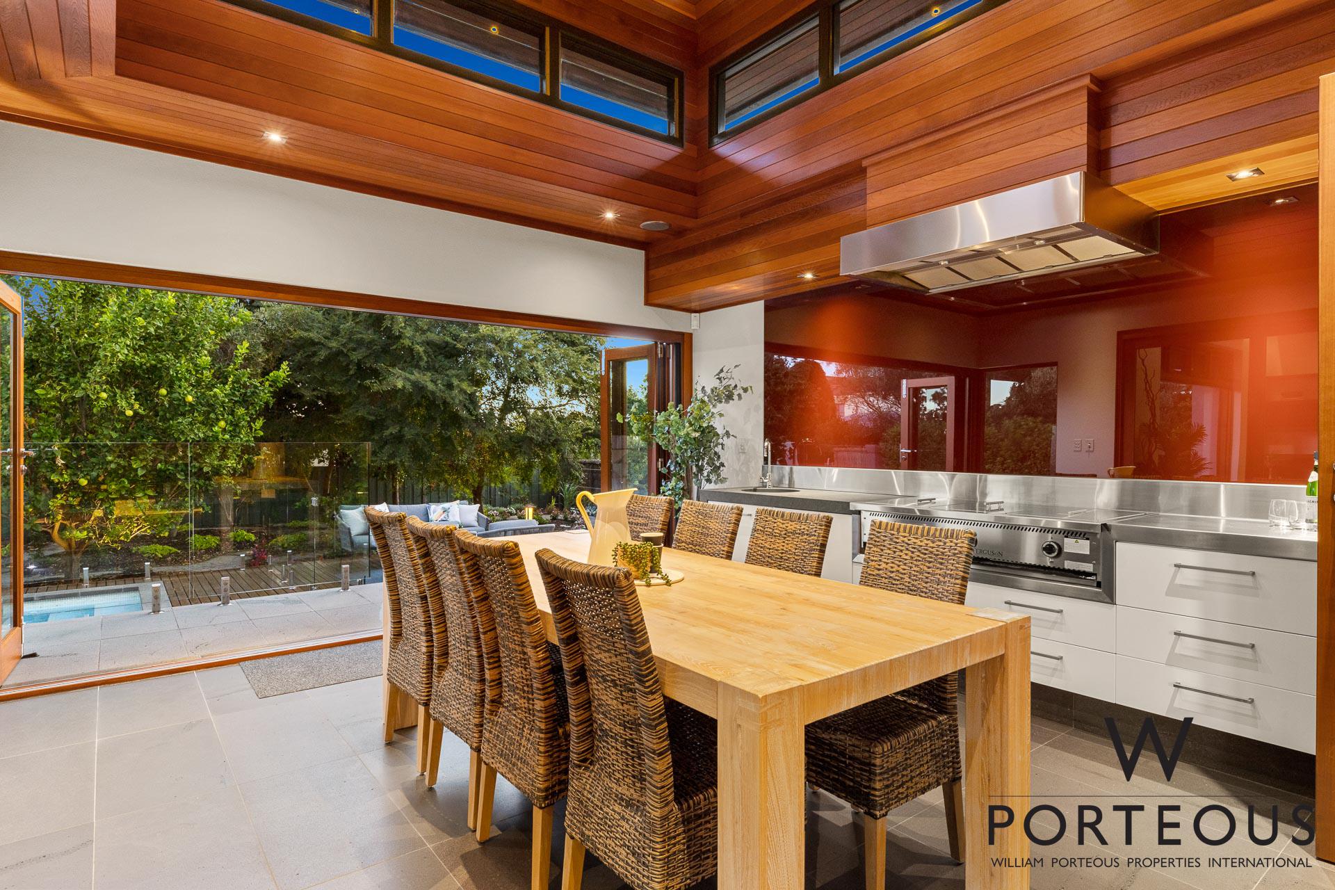 Wall-to-wall sliding and bi-fold doors enclose the alfresco area allowing it to be used as a year round indoor/outdoor entertaining space. It comes complete with a kitchen boasting Ferguson grill, integrated Liebherr fridge and a spectacular cedar-lined vaulted ceiling with a stainless steel fan.