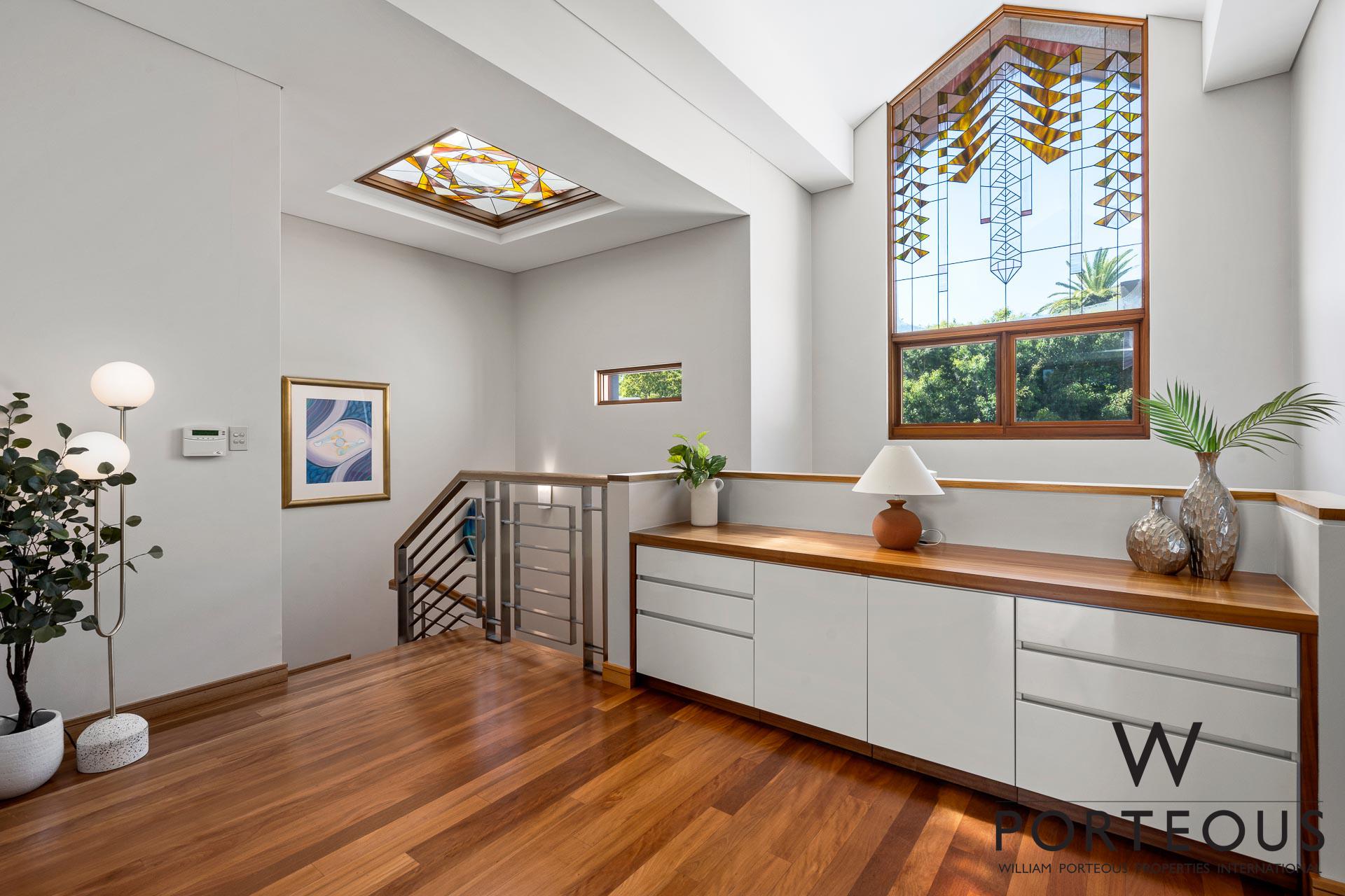 Natural materials are used in abundance, including solid Brushbox flooring, wall and ceiling paneling, Toodyay stone, granite and Cedar. The tone and textures complement the stunning Frank Lloyd-Wright inspired stained glass windows featured at the front of the home.