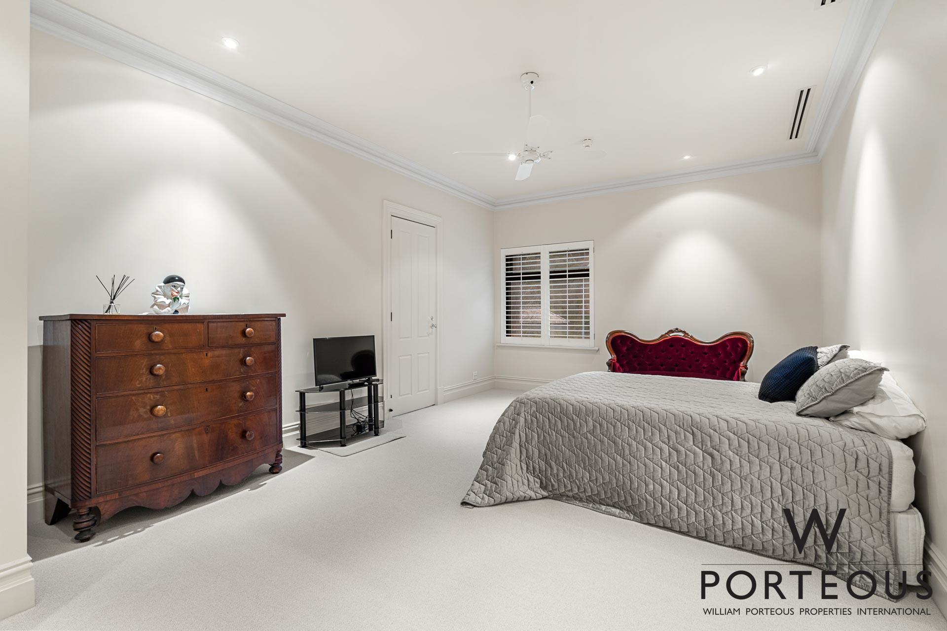 The piece de resistance is the magnificent master bedroom – slightly raised so the magnificent view can be enjoyed from the king sized bed. The wall of built-in robes extends into the vast, luxurious en-suite, complete with two dressing tables, double vanities, a huge shower, and corner spa bath.