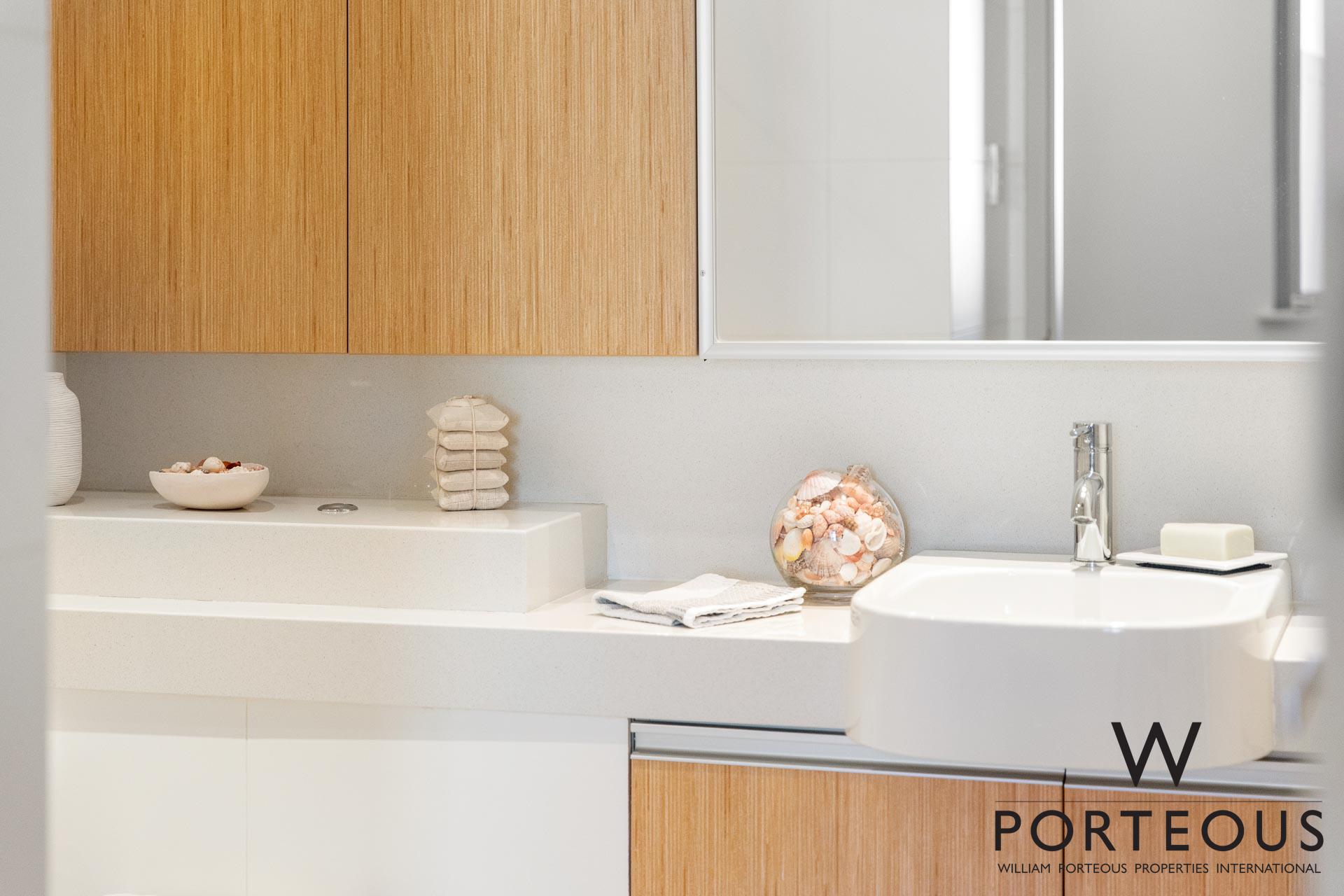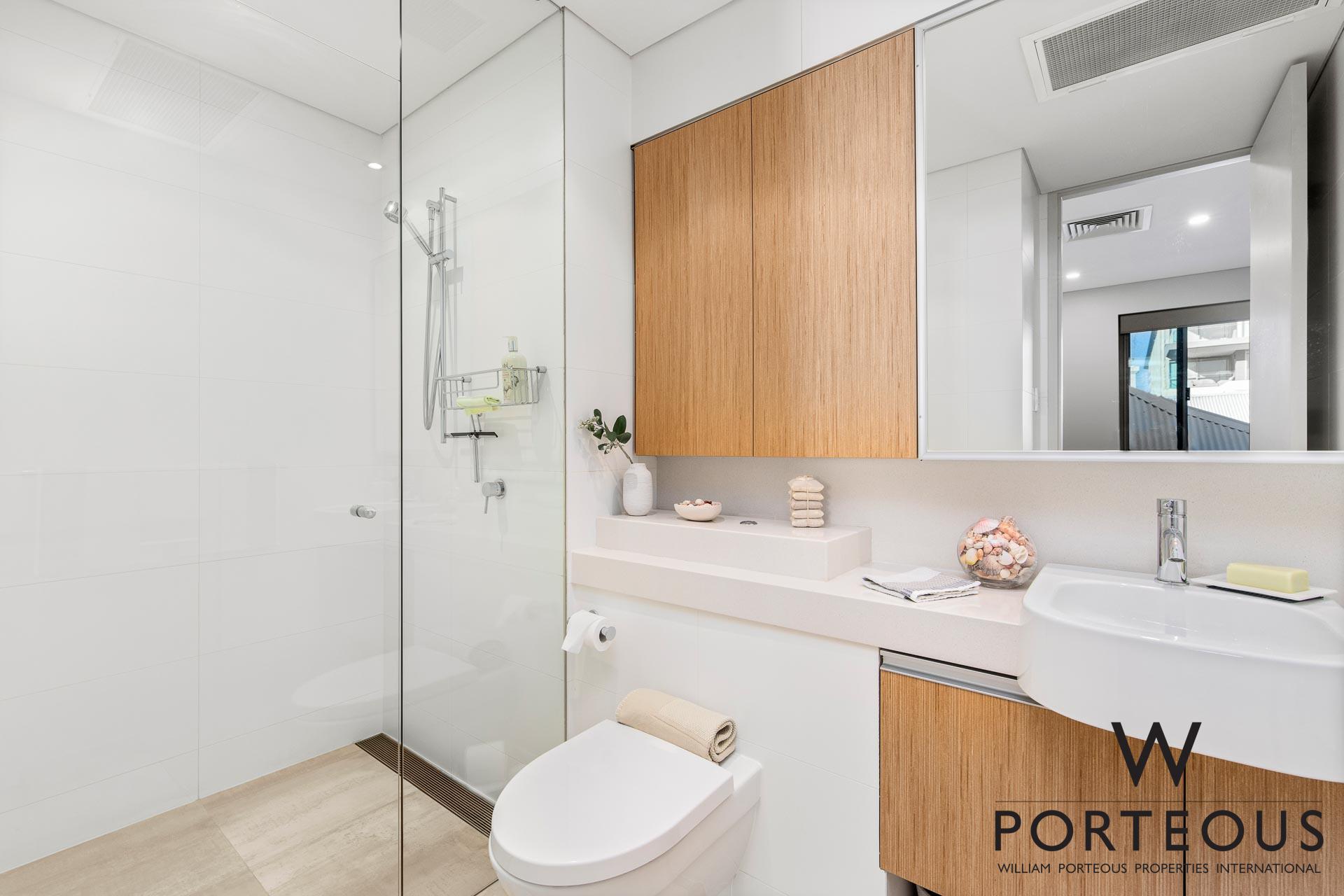 Each spacious bedroom has balcony access and a private, fully-tiled ensuite with a frameless shower, WC and stone-topped vanity. The impressive main bedroom also features wall-to-wall windows, glass sliding doors, and a fully-fitted walk-in robe. There’s a powder room for guests, a generous study nook with a built-in desk and cabinetry, walk-in linen and a good-sized laundry with a Miele washer and dryer included.