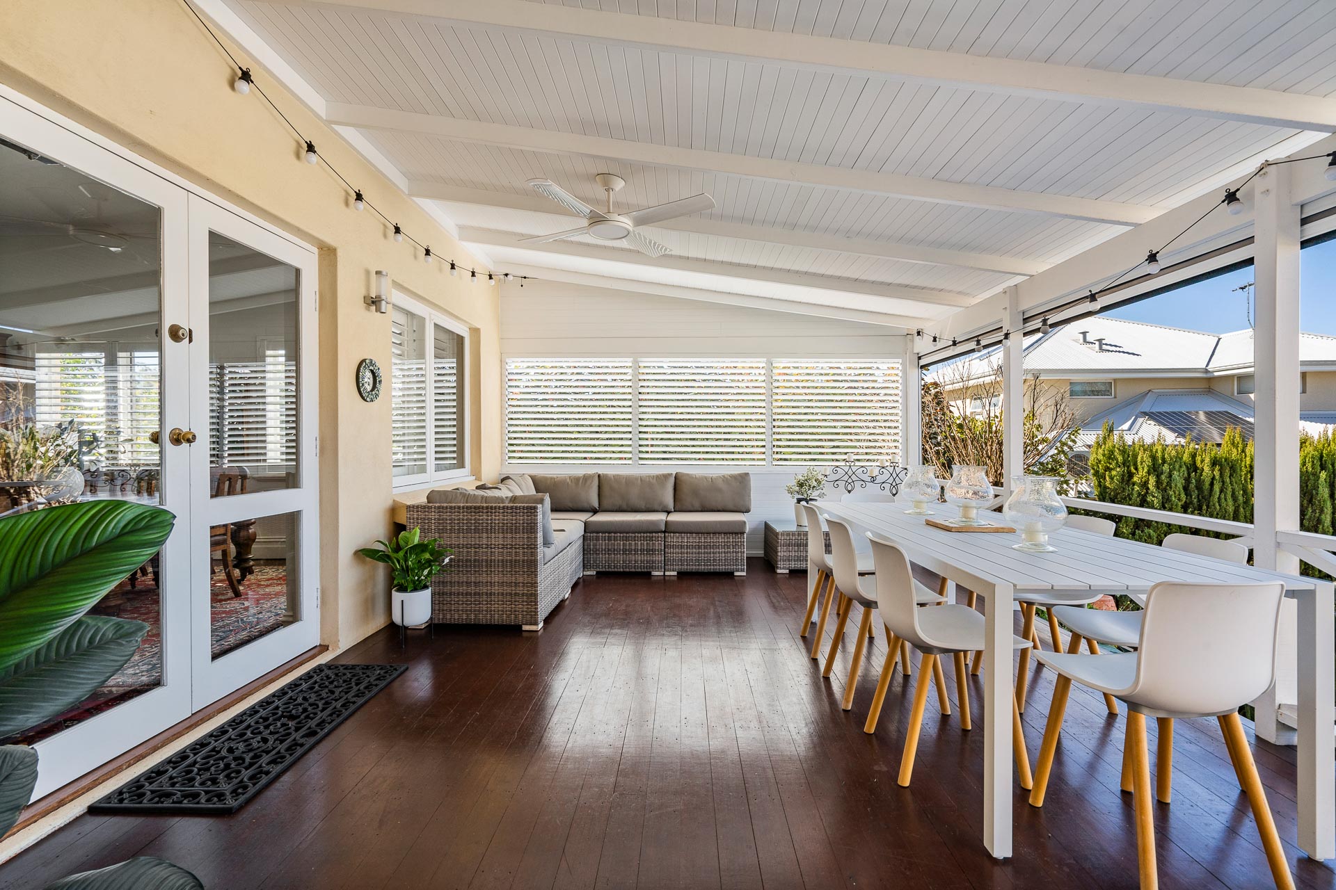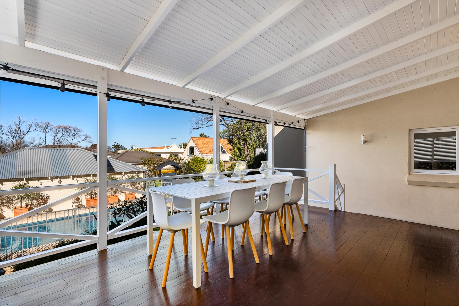 The covered alfresco deck awaits outdoors, flowing from the open-plan dining and family area. Enclosed with shutters and blinds, this elevated outdoor haven can be enjoyed year-round, with a picture-perfect outlook over the landscaped rear gardens and swimming pool.