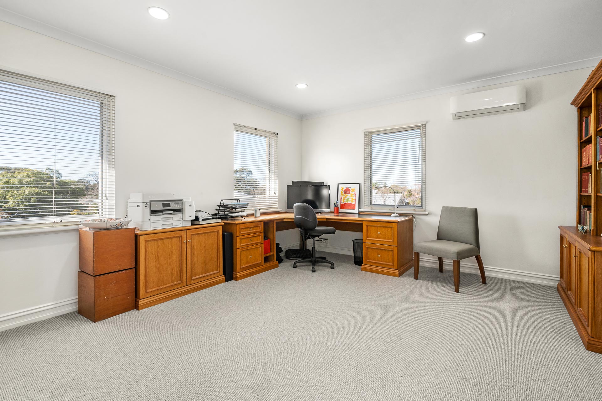 Upstairs we have the main bedroom suite. The bedroom is king-sized, with an abundance of light. The walk-in robe is generous and the ensuite bathroom is modern, fresh and luxurious. A fantastic feature is the adjoining lounge. Currently used as an office space, it offers parents a spacious retreat at the top of the house, overlooking the garden, pool, and out over the surrounding suburb.