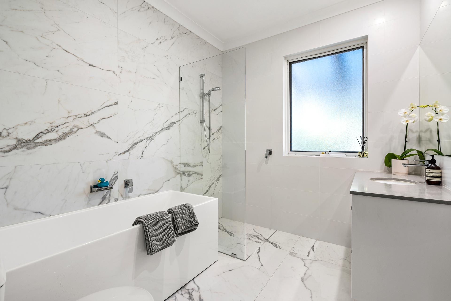 The contemporary bathrooms, elegantly designed by Jane Agnew, feature large floor-to-ceiling tiles and heated towel rails for extra luxury and comfort. A laundry and powder room, with easy access to the pool, add to the practicality and functionality of the home.