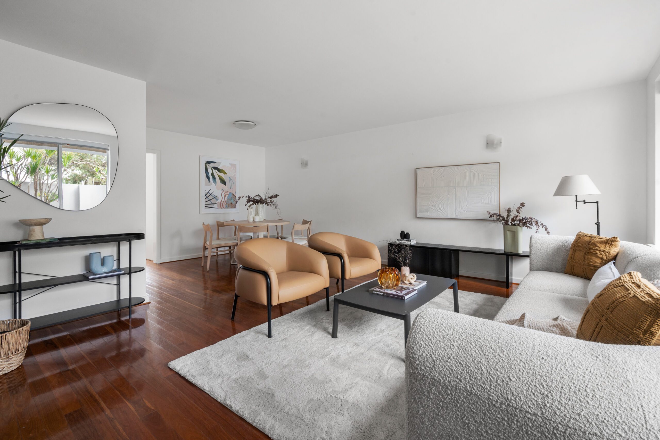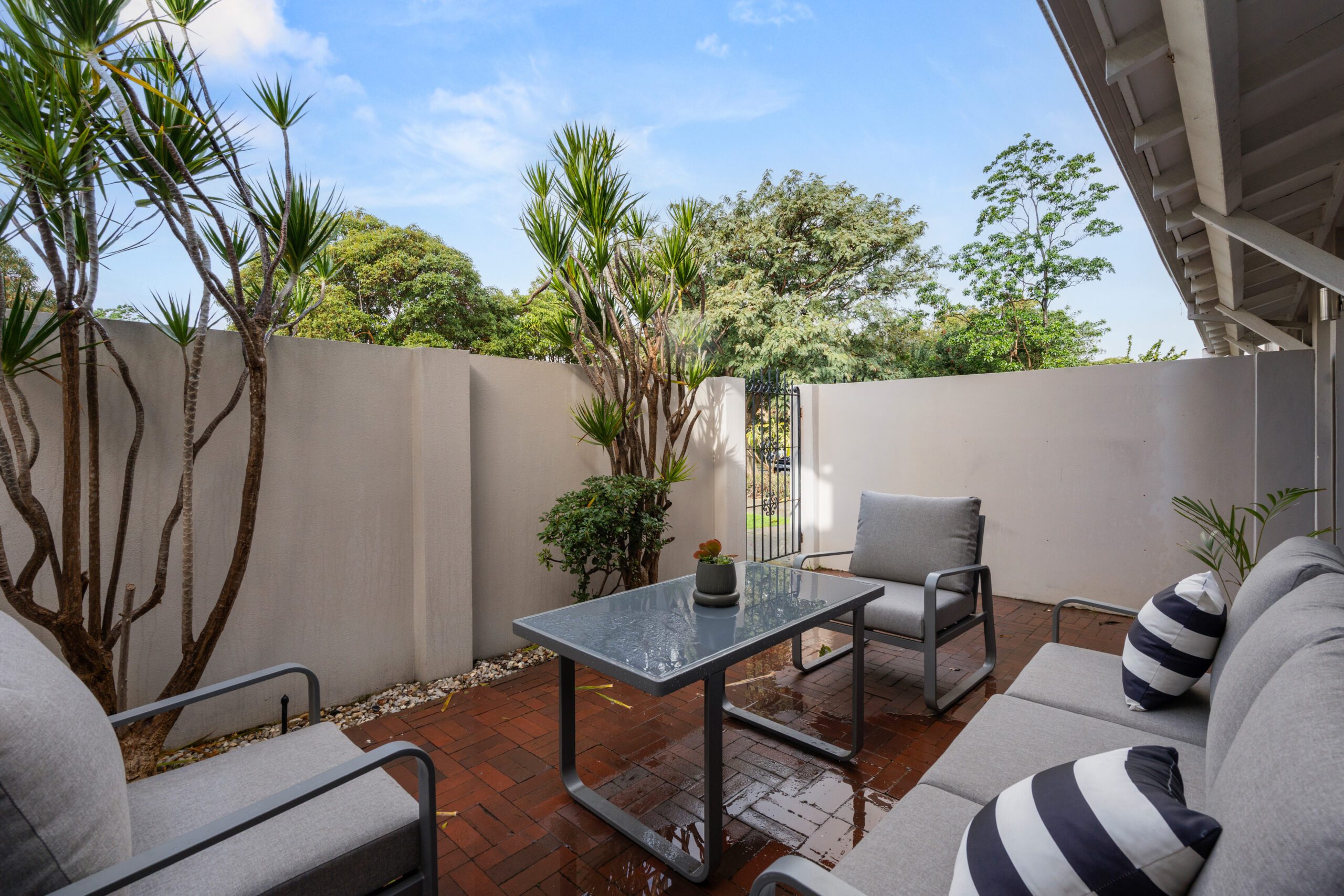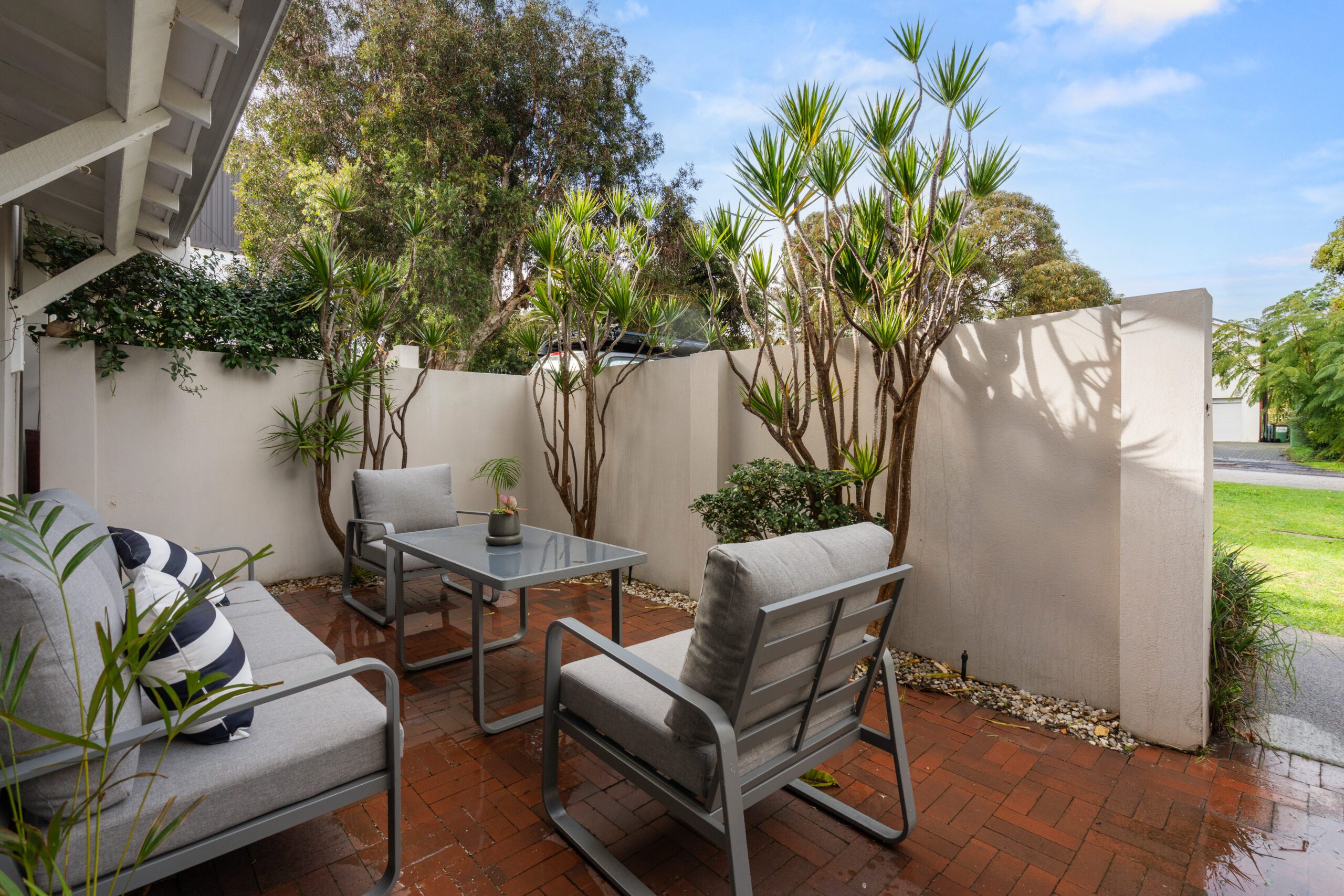 The front courtyard is spacious, private, and faces the morning sun. It is currently set up as a shady, secure play area. The front door opens into the large living room which flows onto the open plan dining area and through to the well-appointed kitchen.