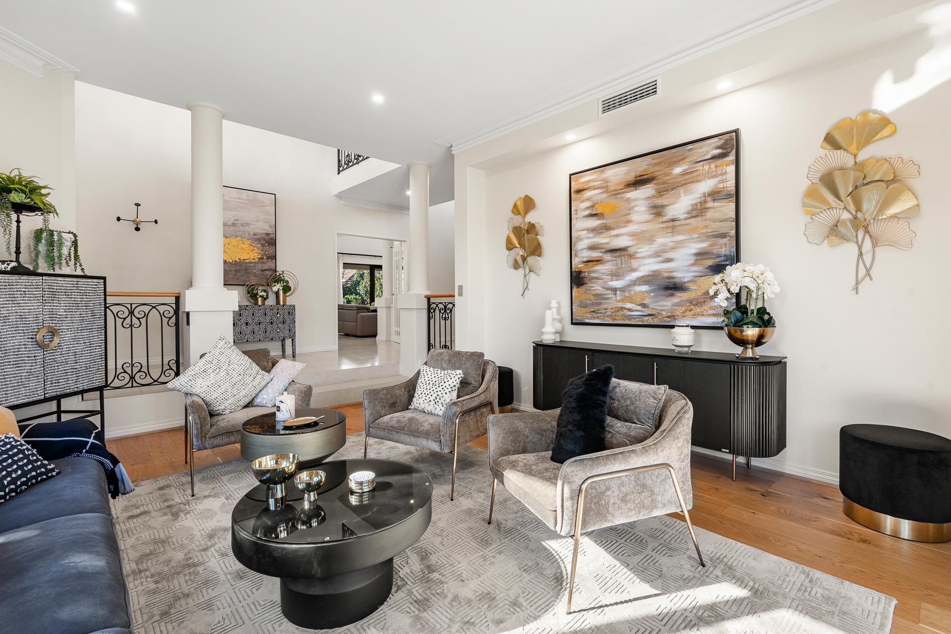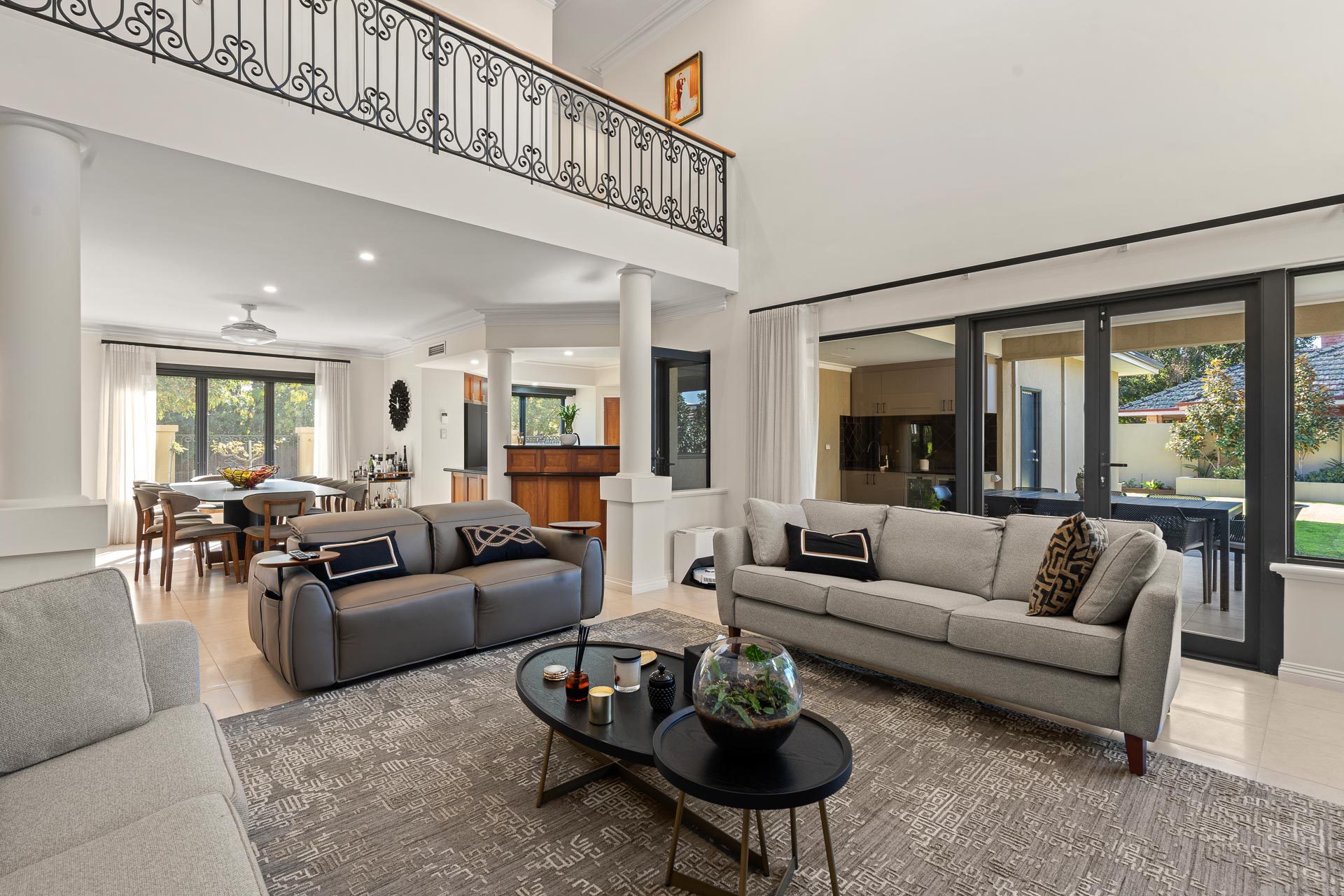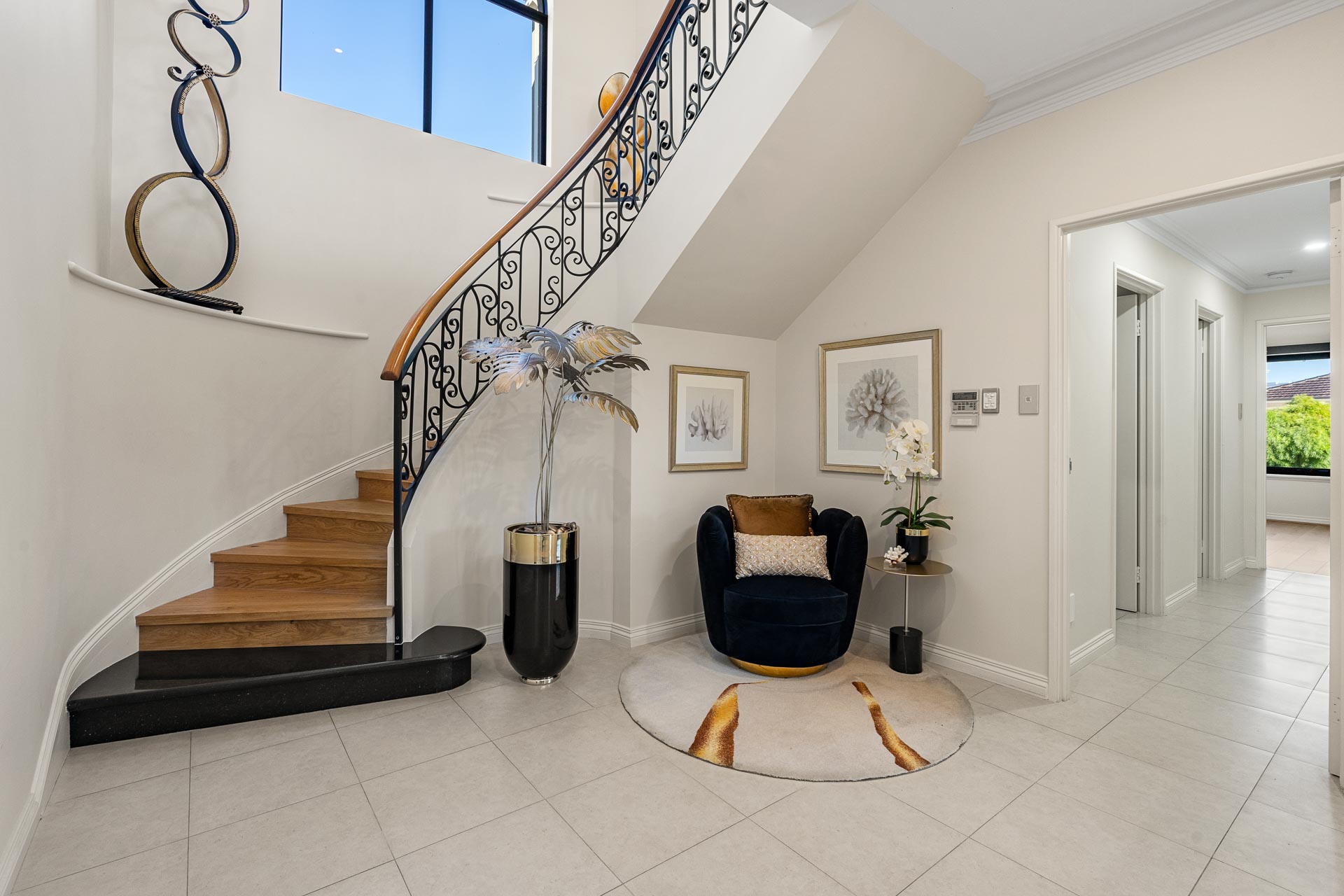 Thoroughly refreshed and refurbished by its current owners, it is private and secure. The entry is through a set of double doors into an impressive entranceway with a sweeping staircase linking the upper and lower levels and a soaring double level void ceiling lending an air of sophistication and understated grandeur.