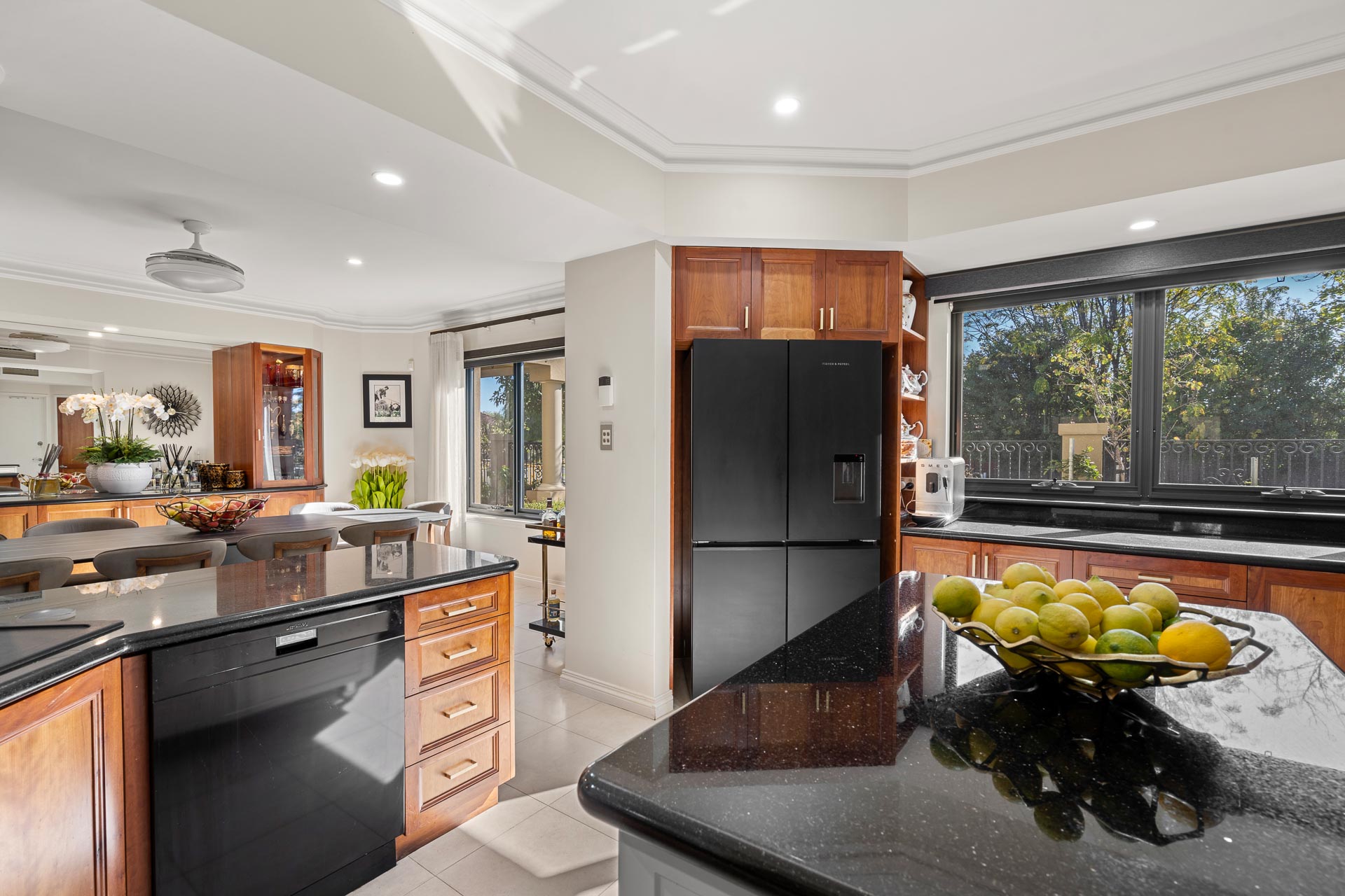 The open plan, contemporary kitchen is an entertainers’ delight with windows to both the north and south boundaries, ample granite benchtops, timber cabinetry, a walk-in pantry and SMEG appliances throughout.