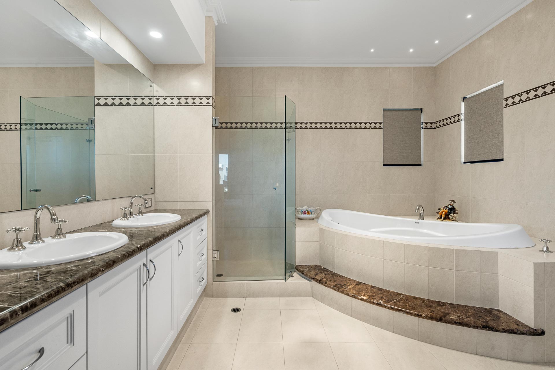The second, upper-level main suite features double doors to the private terrace beyond and a luxe resort style ensuite bathroom with raised oversized bath and consistently styled with granite benchtops, double basin and white cabinetry throughout.