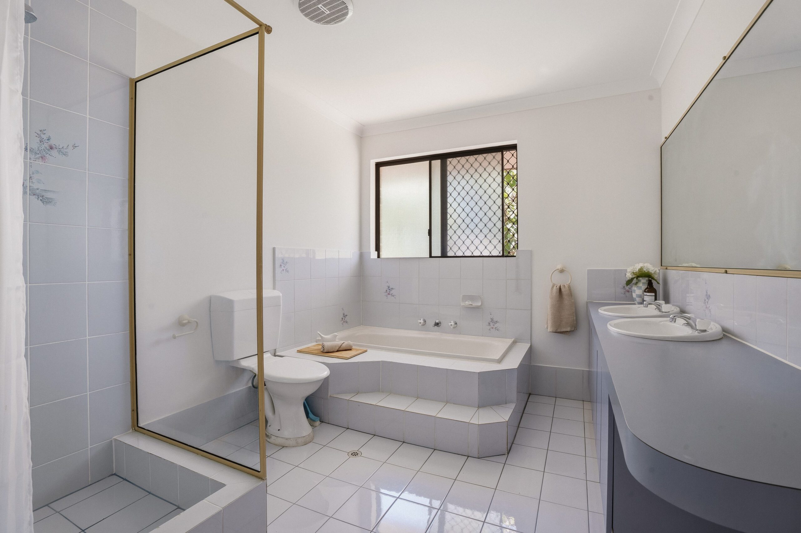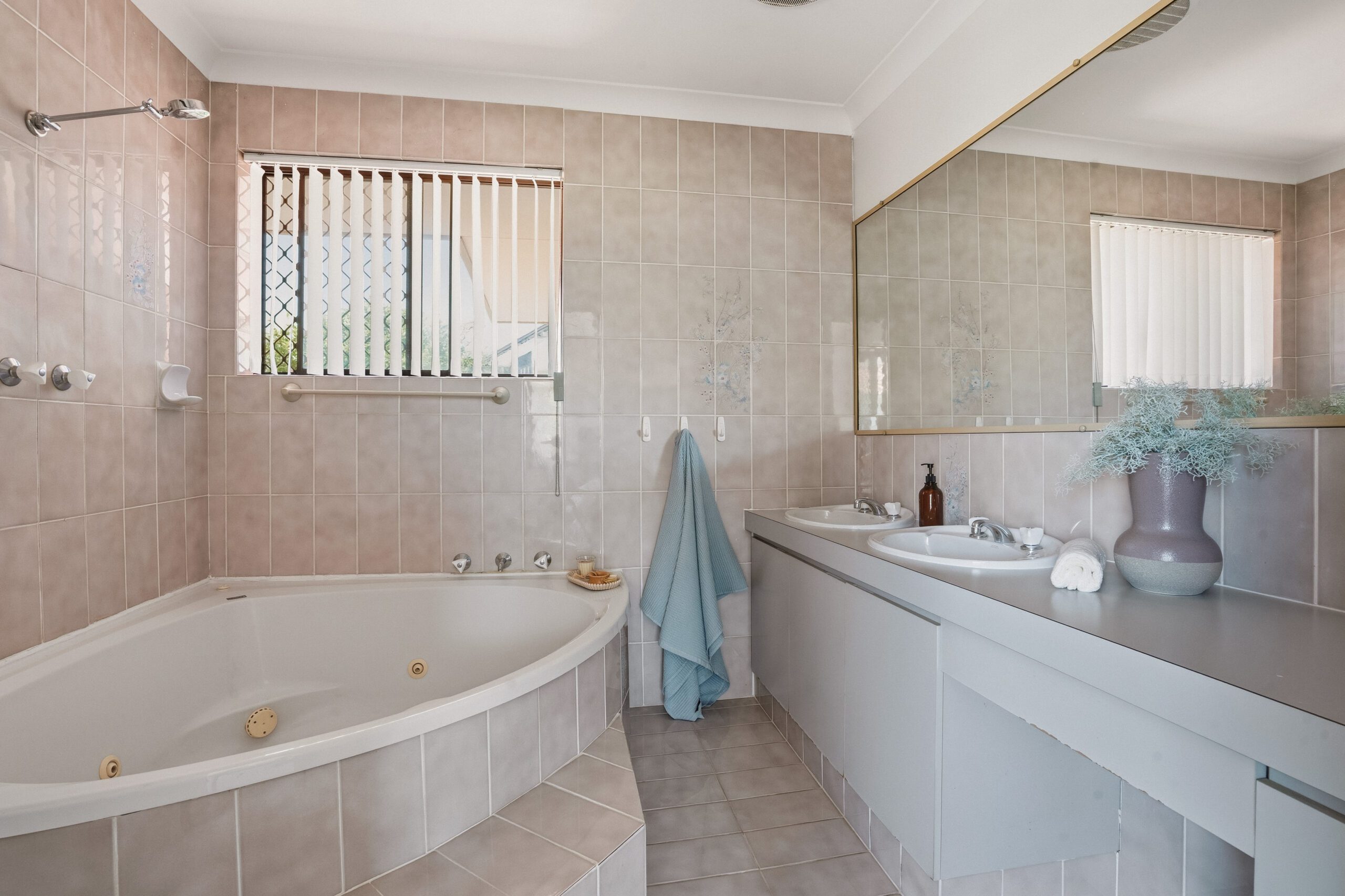 The classic laminate kitchen in true 80s style features an electric oven, induction cooktop, gas stovetop, and dishwasher, while the bathroom and large laundry in retro pink offer the perfect canvas for a makeover for the keen renovator. Direct access from here leads to the alfresco.