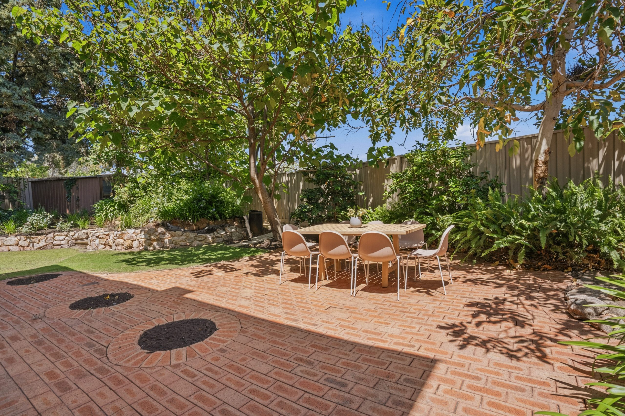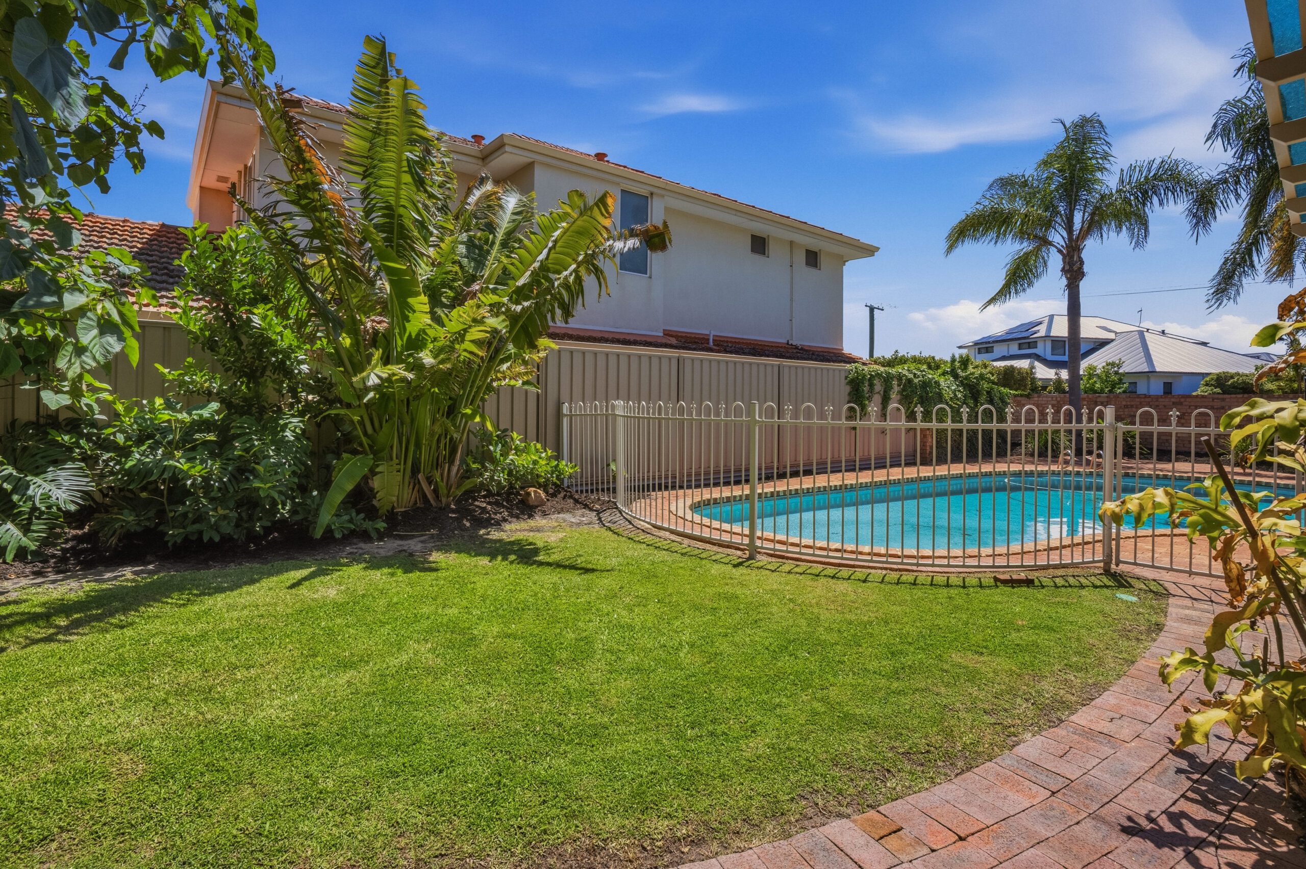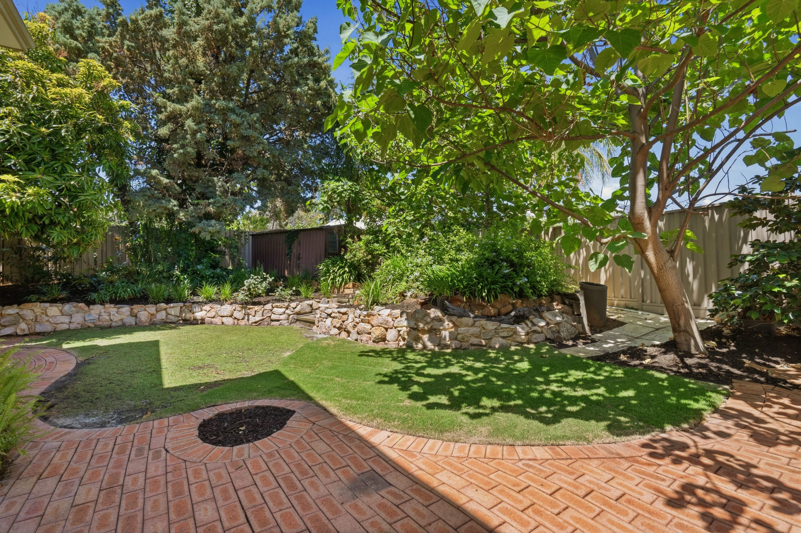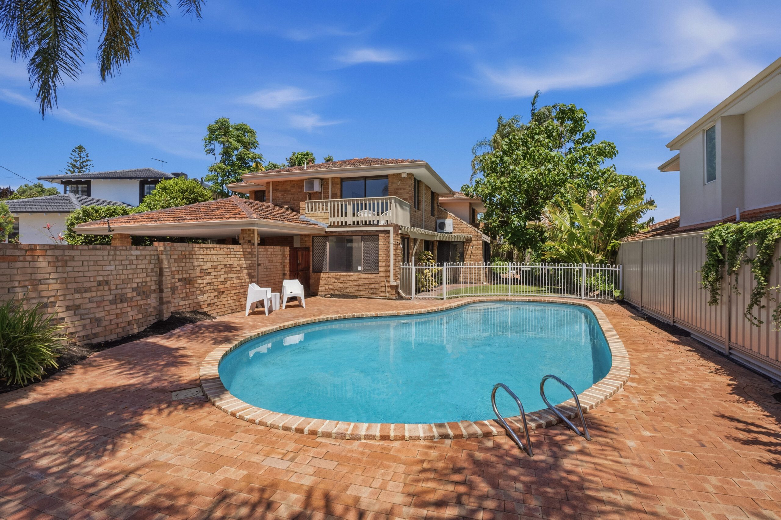 Outside, tall trees, flourishing greenery, and stretches of lawn framed by stone bordered garden beds create a peaceful and private sanctuary. Paved brick areas are ideal for an outdoor setting or barbecue, as the pool curves around palm trees, with gated access to the carport. Round the back, the shady serenity continues to a spacious and versatile corner garden shed.