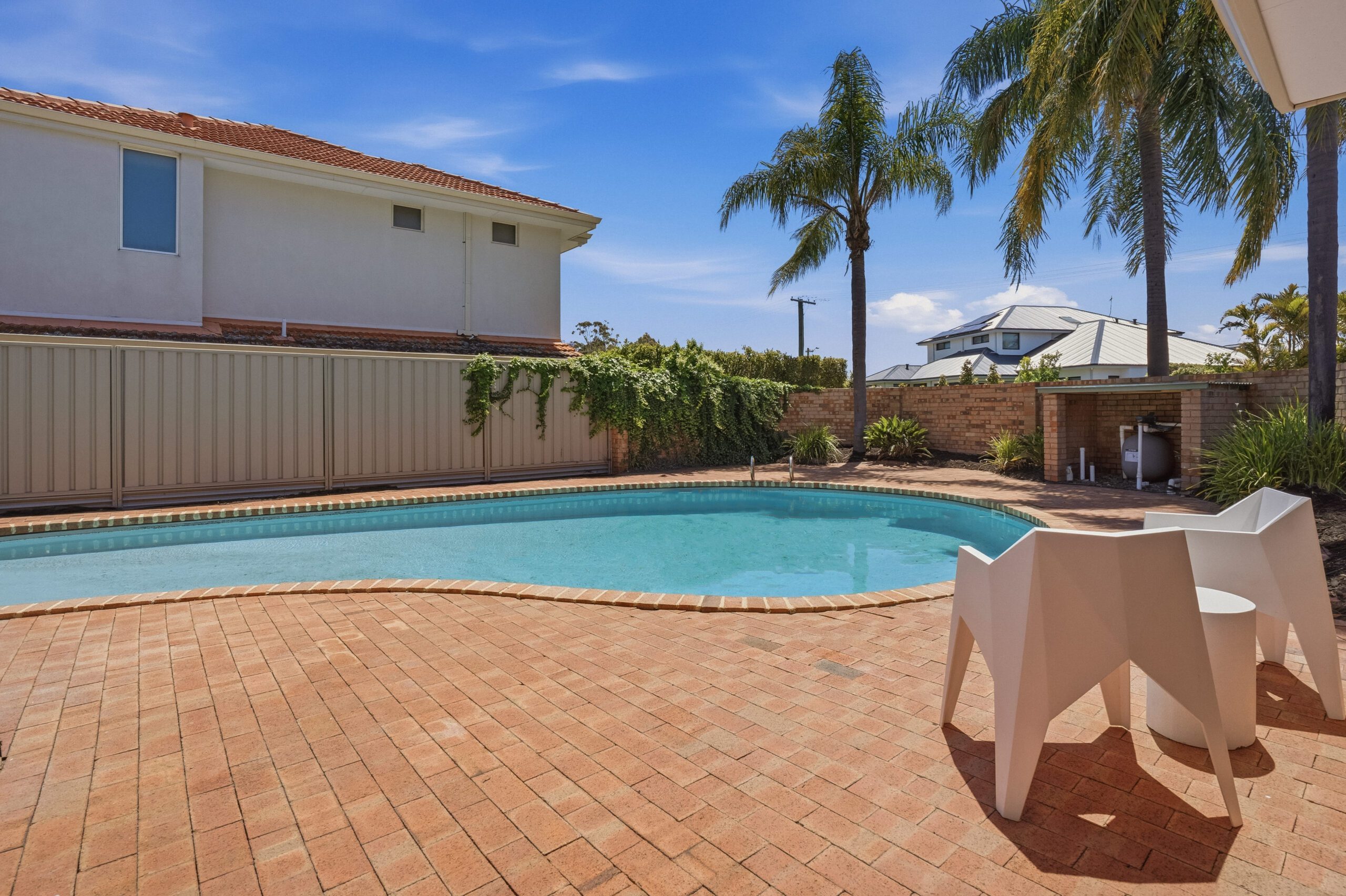 Curving around a peaceful cul-de-sac, this two-storey home is perfectly placed for relaxed family living, on par with its palm-lined surrounds and private poolside setting.