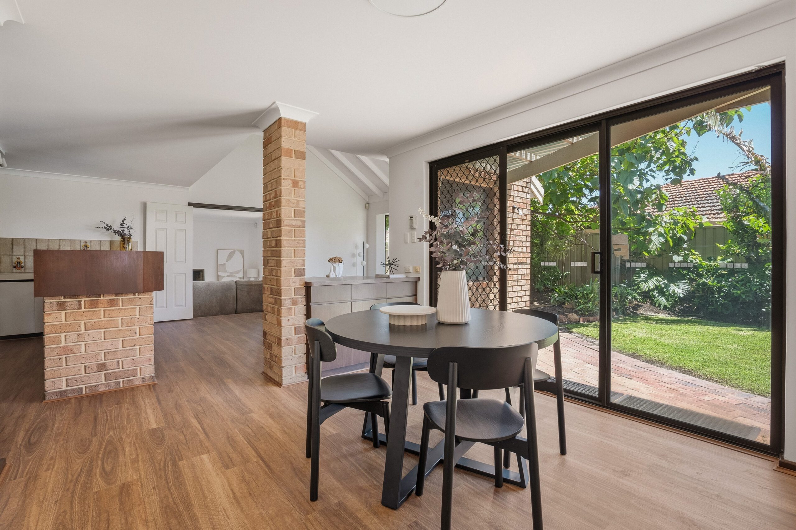 A lofty vaulted ceiling enhances the sense of space, with air-conditioning and gas heating for year-round comfort, as double doors flow through to a generous family room with a series of sliding doors to the exterior.