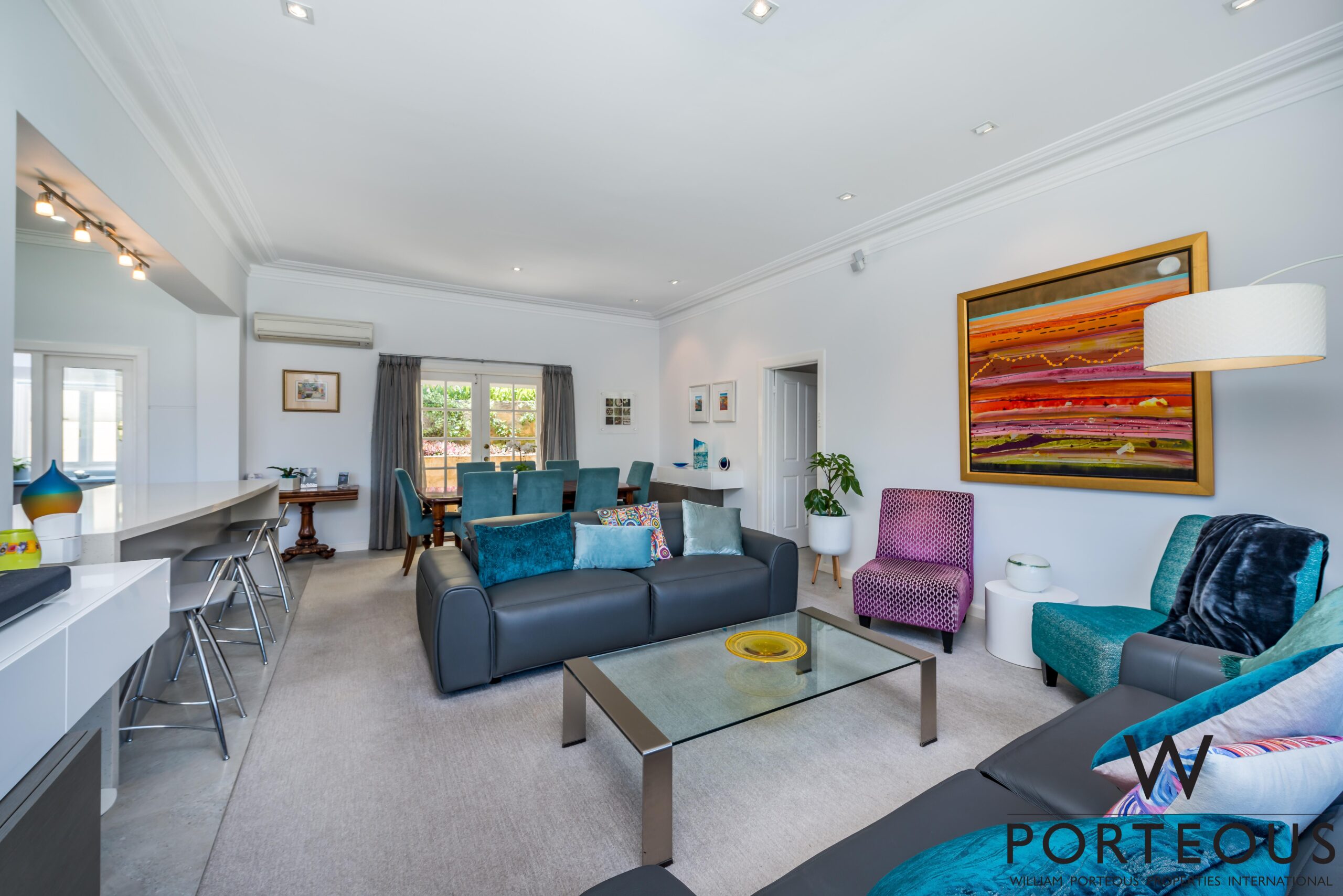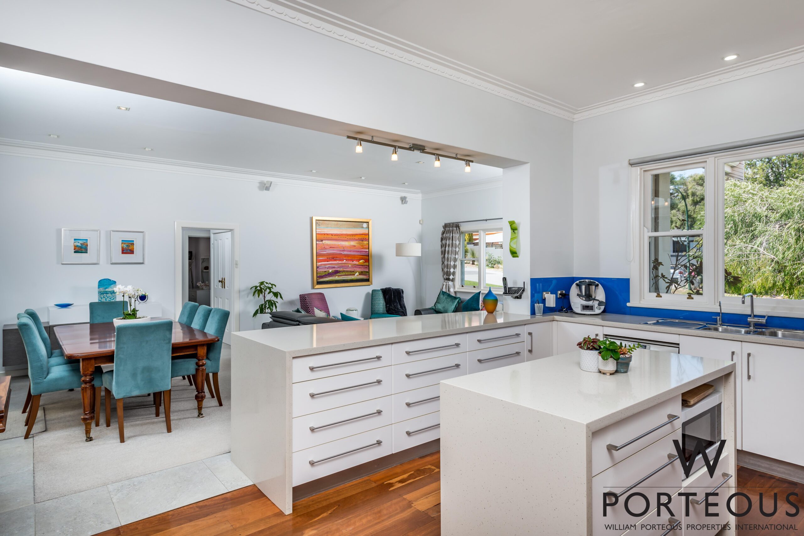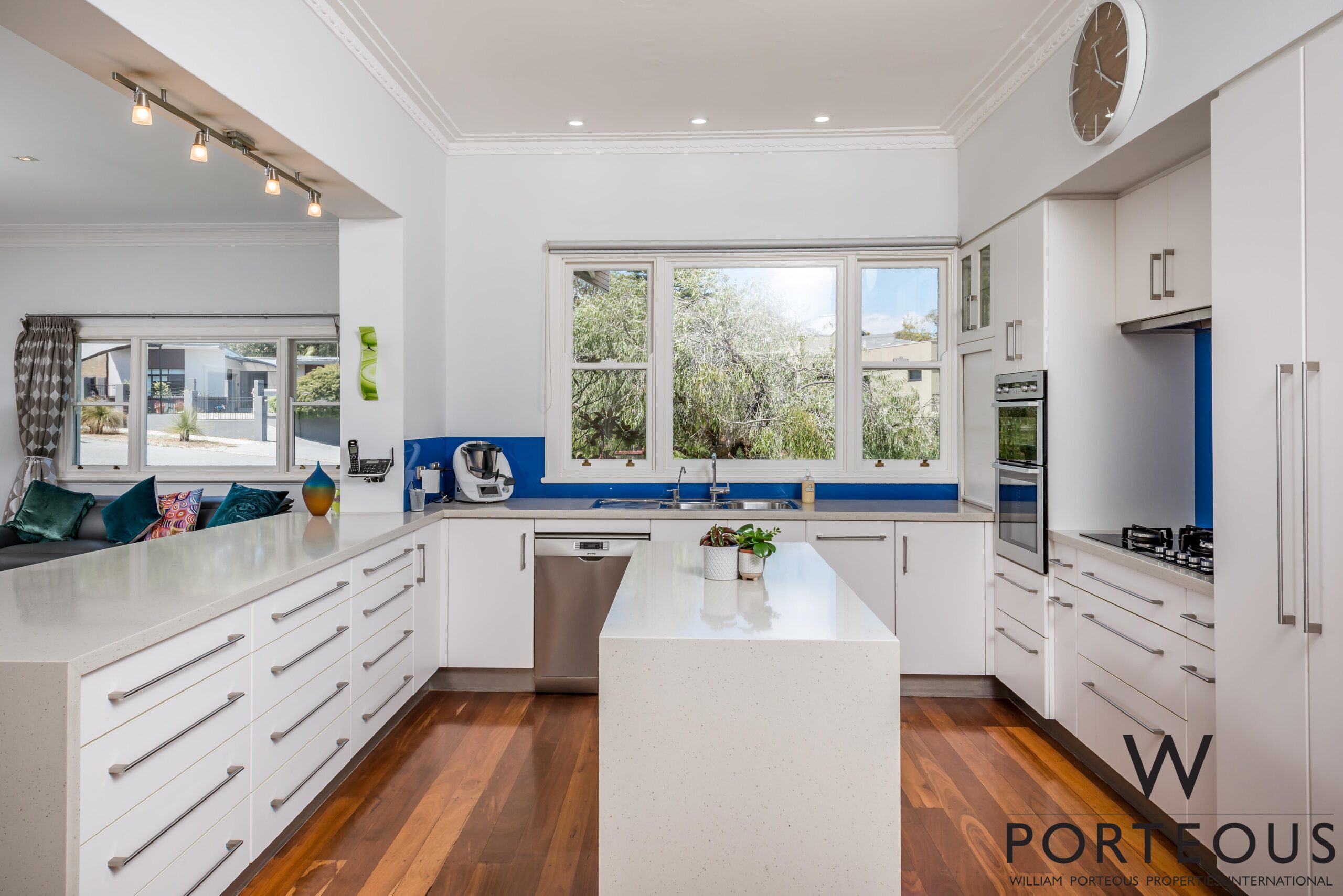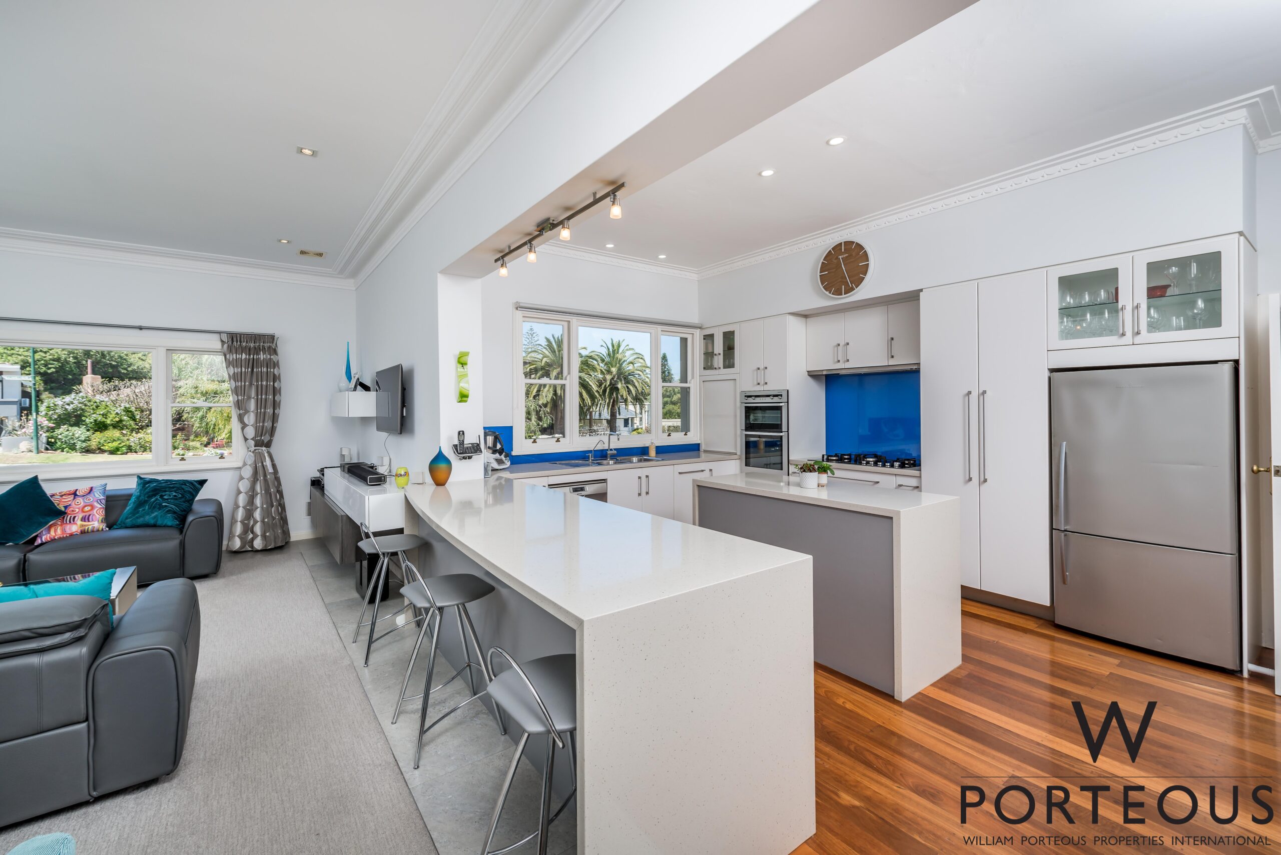 In between, expansive, beautifully balanced open plan family living, dining and kitchen are perfectly zoned and integrated, ideal for both intimate gatherings and large scale entertaining. The sleek superbly appointed kitchen is a triumph of convenience with banks of white cabinetry, stone counters with casual seating, waterfall edge stone island, vibrant deep blue splashback and quality European appliances.