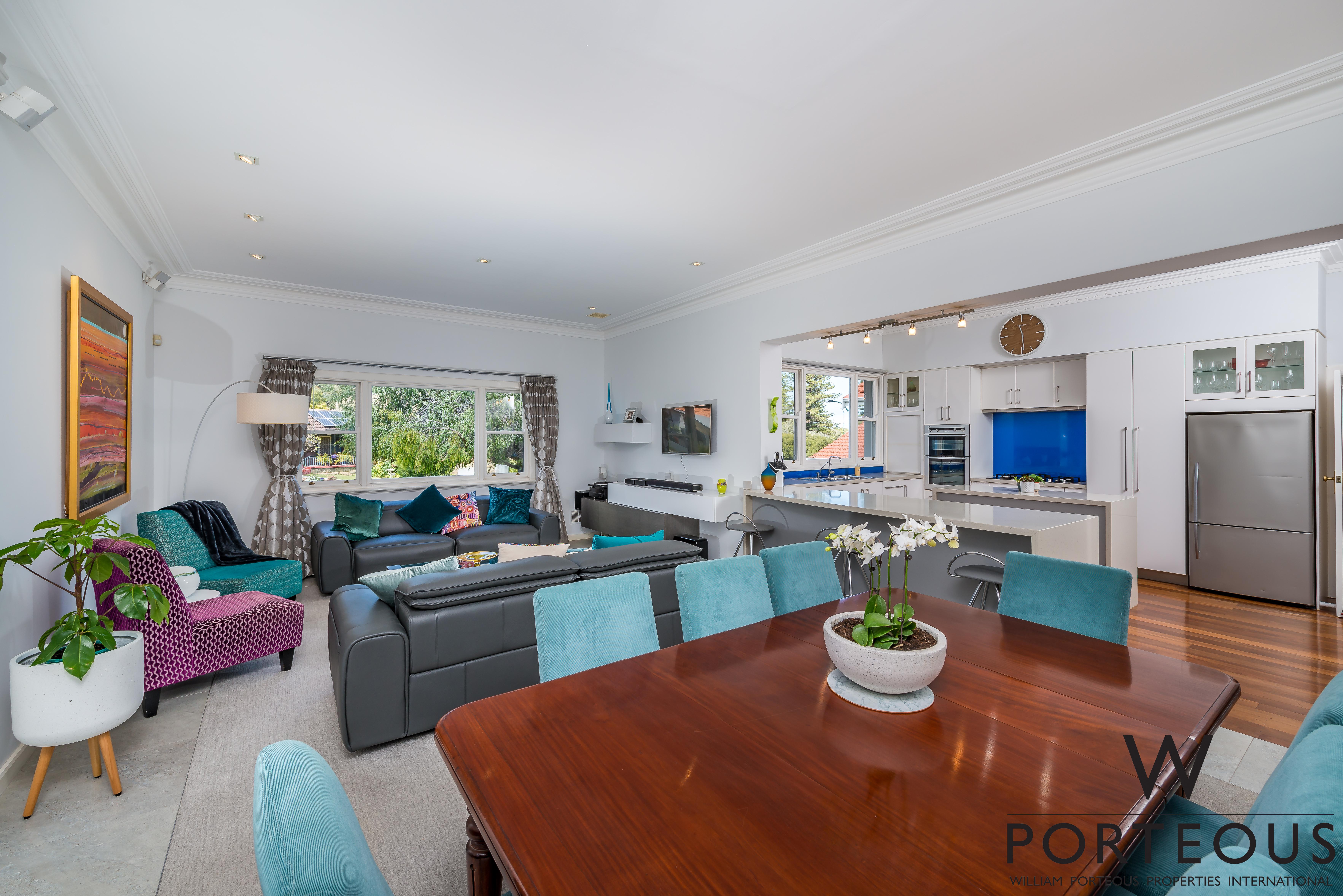 Characterized by generous proportions, sundrenched, light filled interiors and supreme family appeal, the versatile and intuitive floorplan is perfectly designed for flexible functionality and superb separation of space. With a nod to the past, long traditional hallway, gleaming jarrah floors, picture rails, decorative cornices, ceiling roses and soaring ceilings sit easily alongside open plan areas designed to bring the family together.