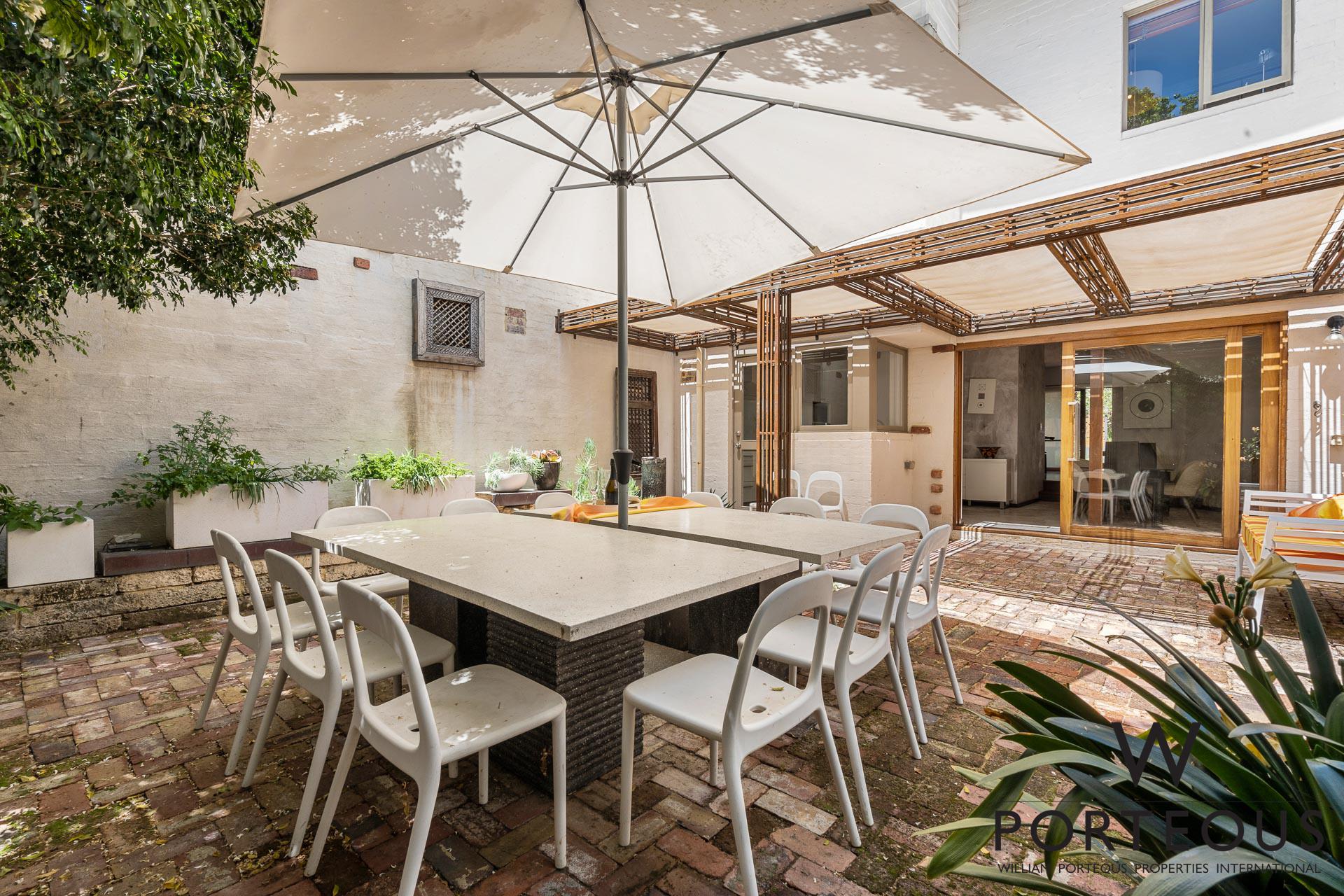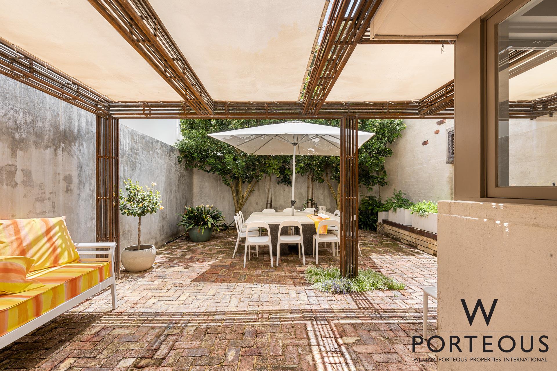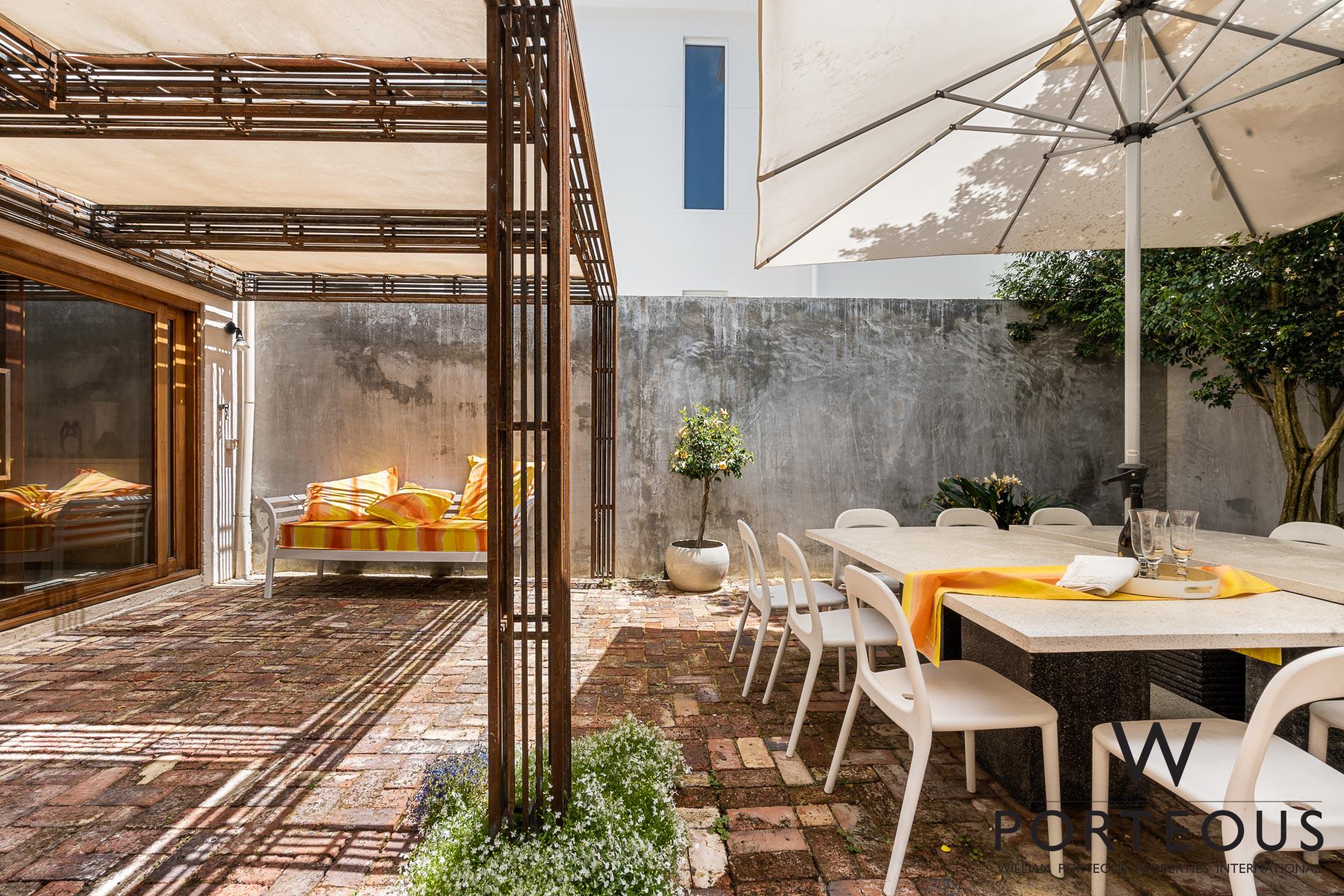 The rear north facing courtyard is generous with the current owners table accommodating sixteen. It has the appearance of a walled garden, private and peaceful. A patinated steel pergola, custom made and designed, extends the living space into dappled light soaked seating. Washed grey polished cement, limestone, and copper bench tops combine to make an inviting entertaining area for crowds or a quiet coffee catch up with friends.
