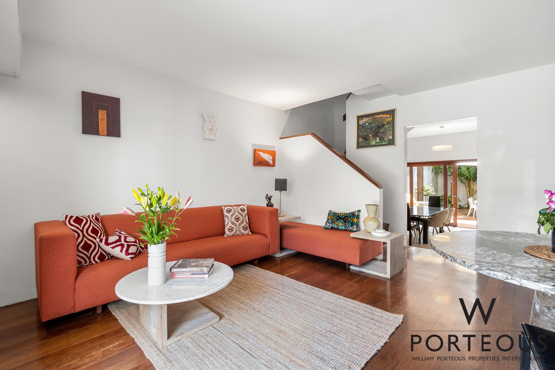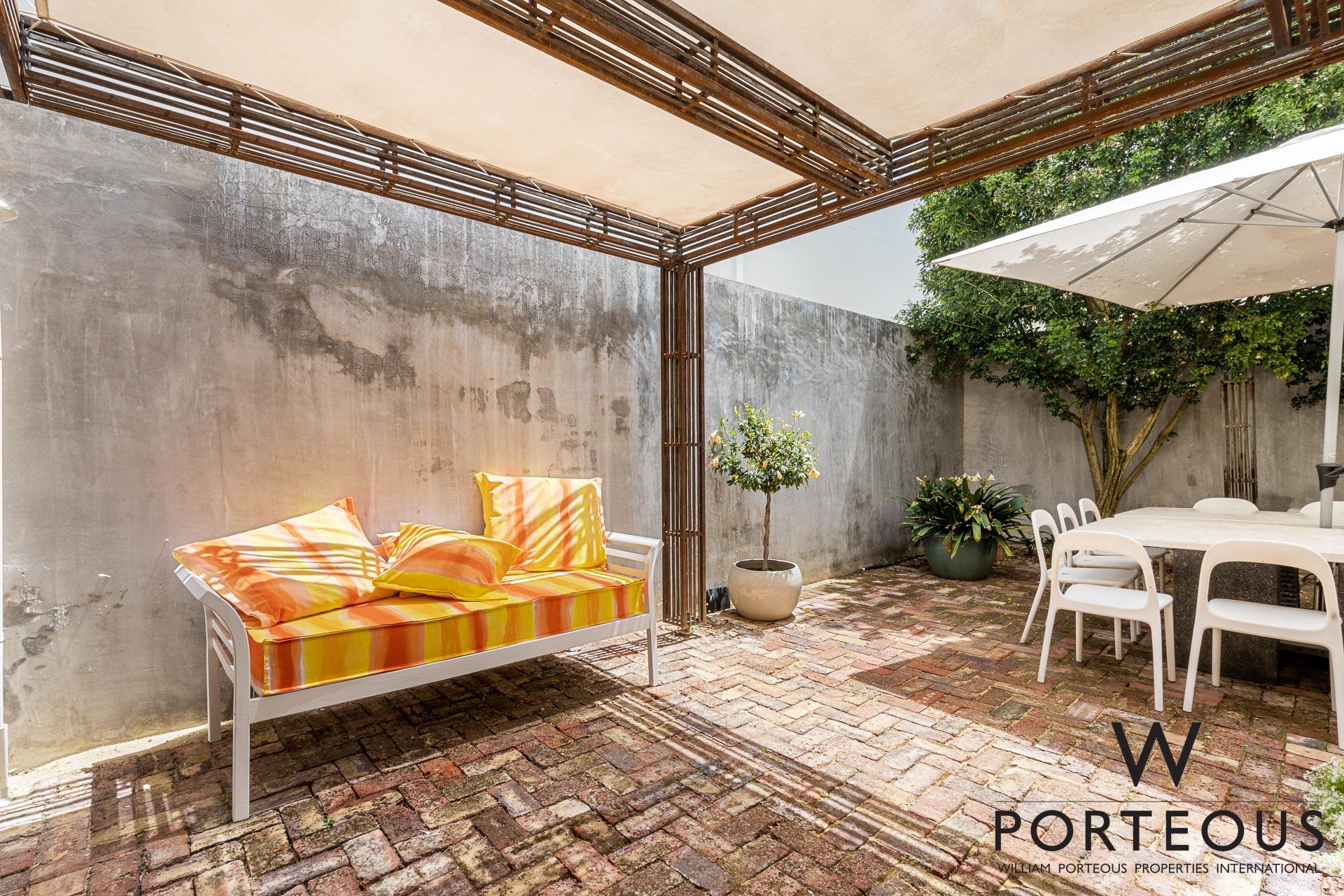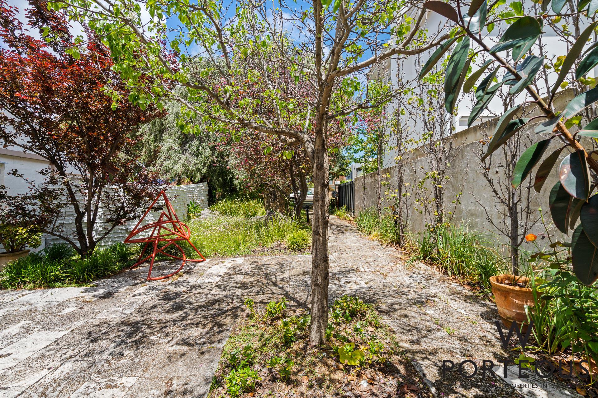 The rear north facing courtyard is generous with the current owners table accommodating sixteen. It has the appearance of a walled garden, private and peaceful. A patinated steel pergola, custom made and designed, extends the living space into dappled light soaked seating. Washed grey polished cement, limestone, and copper bench tops combine to make an inviting entertaining area for crowds or a quiet coffee catch up with friends.