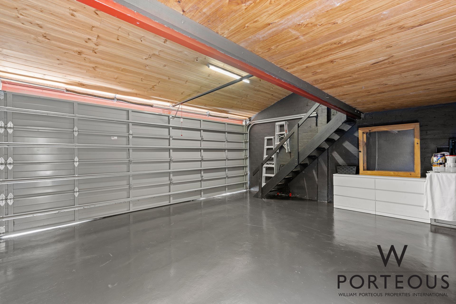 A two-car garage is generous in size with a mezzanine spanning the garage width, used as a studio and for storage by the current owner.