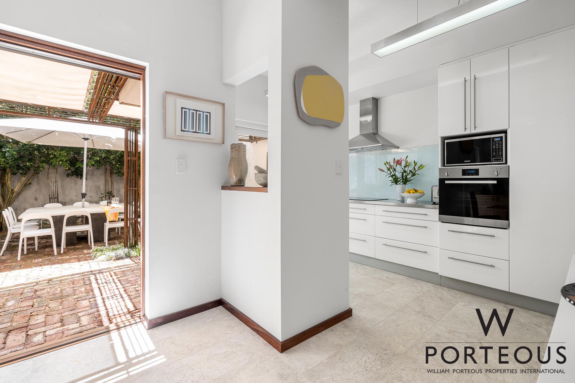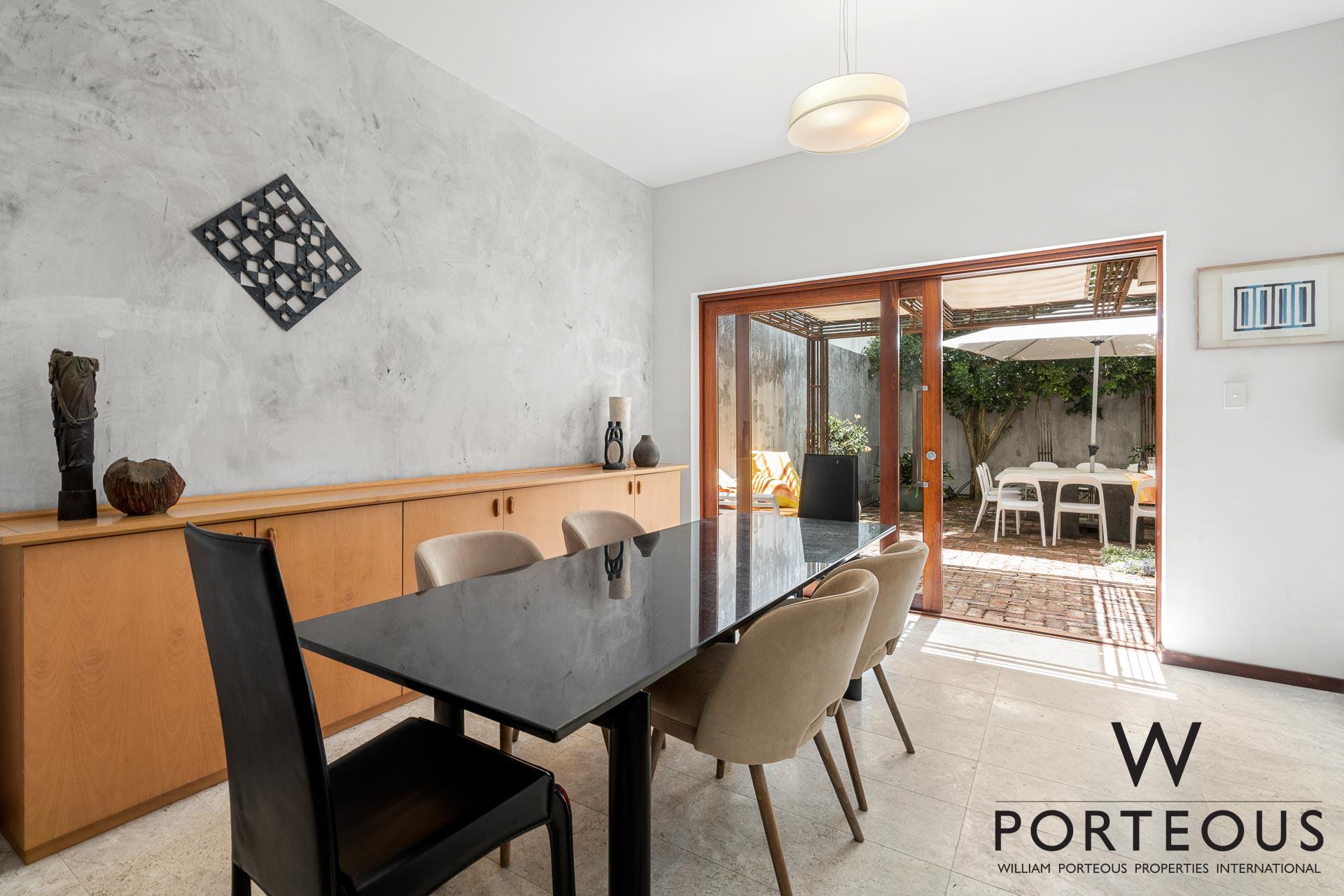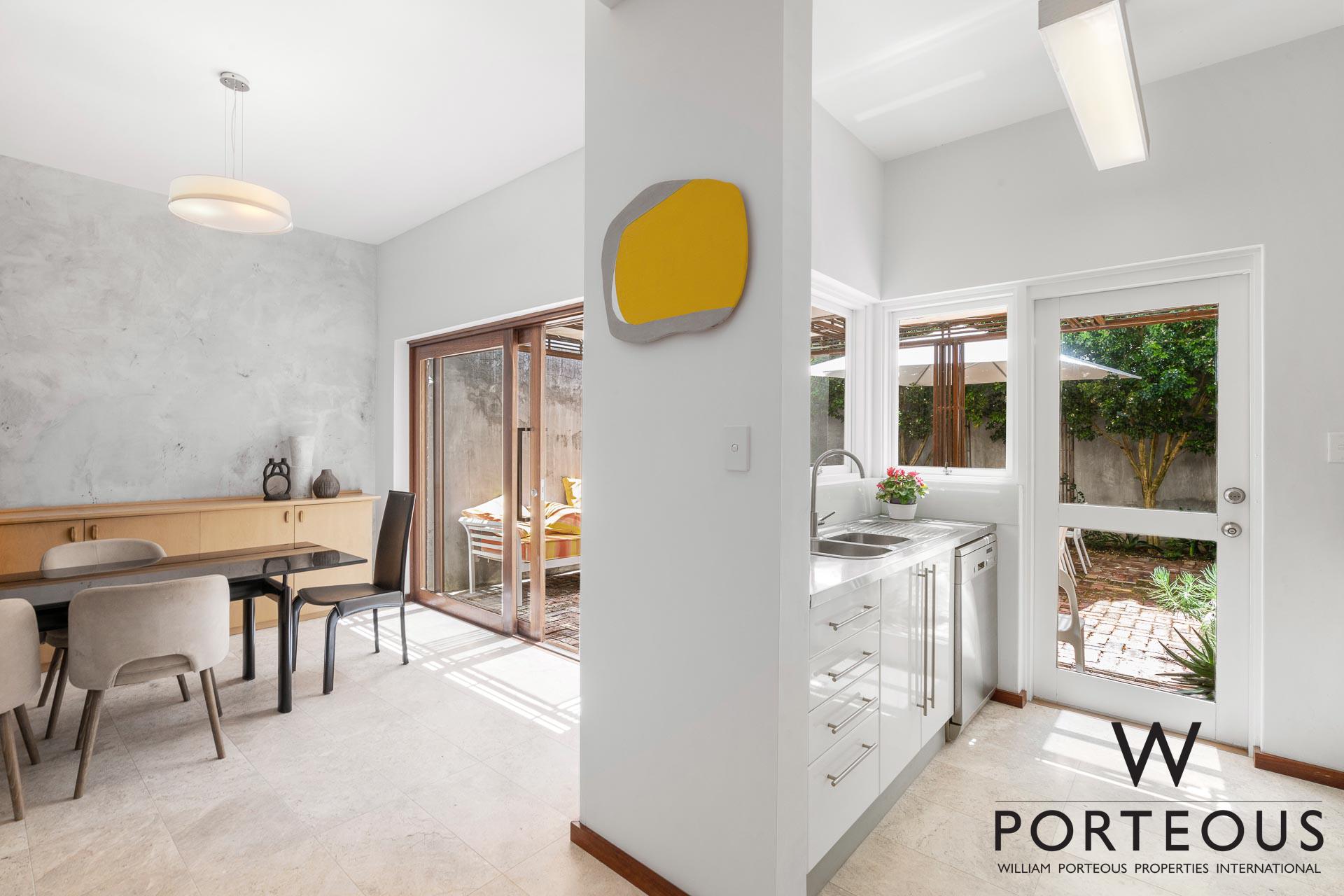 Large timber sliding doors frame the view from the dining room to the north facing courtyard. Custom polished plaster walls add richness and individuality to the space. The kitchen preparation area is discreetly screened, still allowing for a connection and flow to the dining area and the attached scullery and laundry.