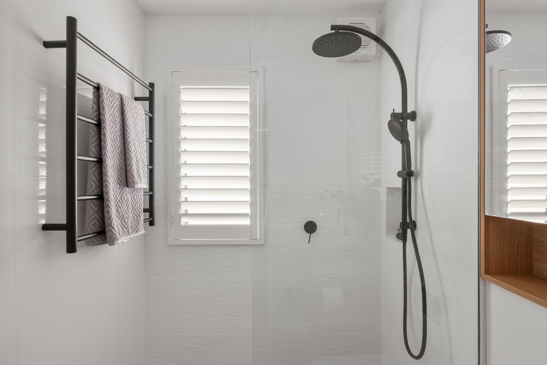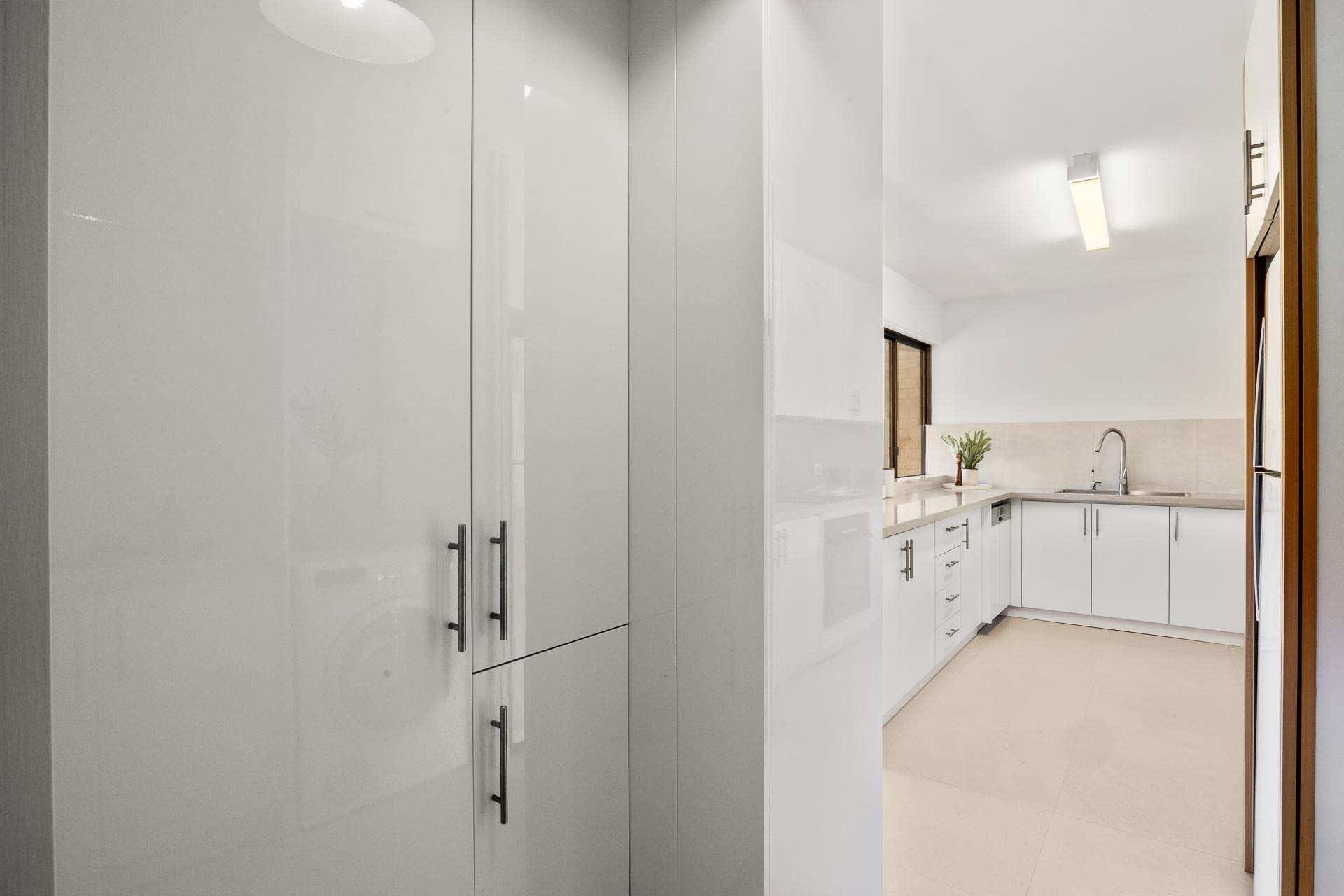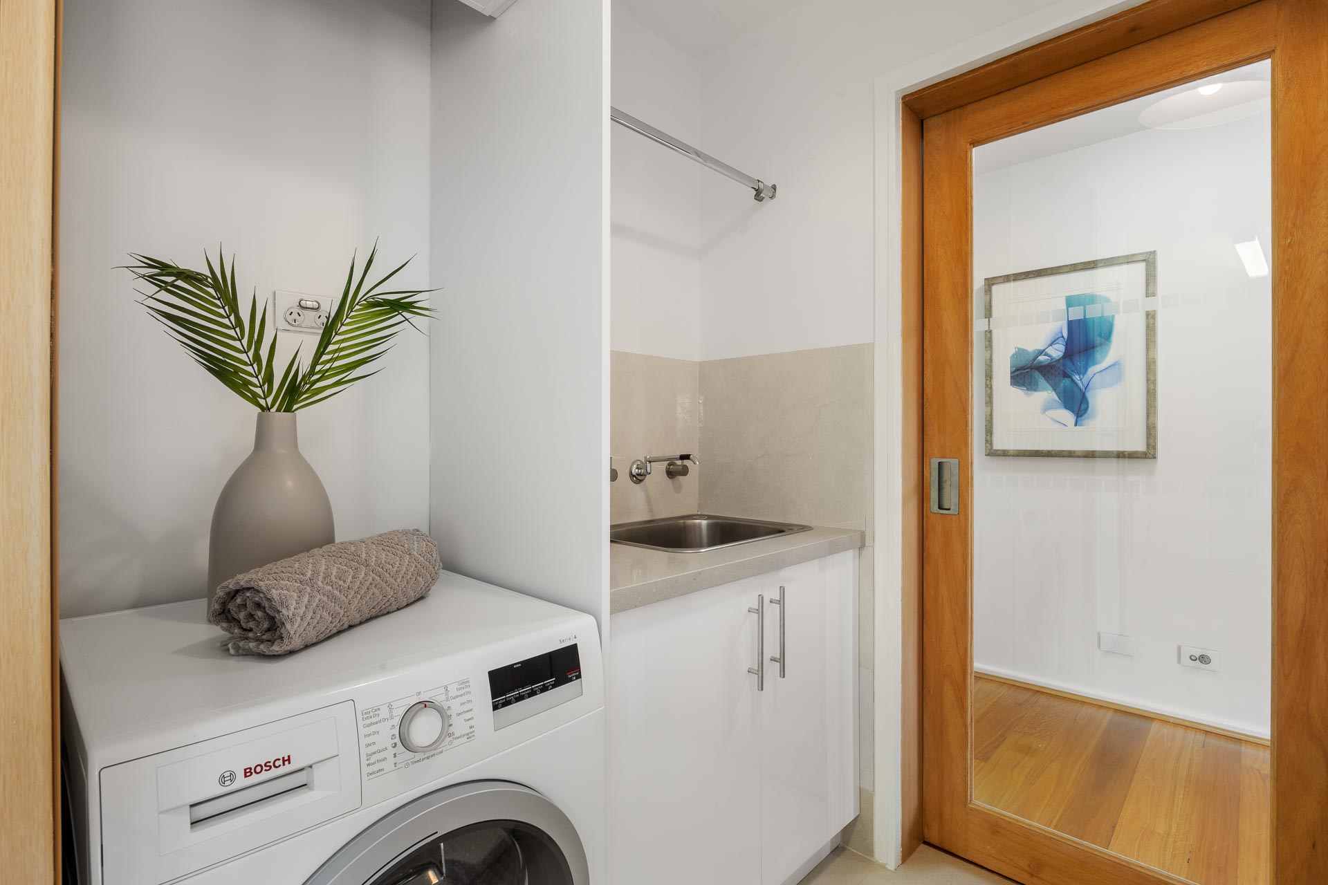 An incredibly functional utilisation of the space here involves the addition of a spacious pantry, storage cabinet great for shoes and bags, and a ‘hidden’ laundry with tub, cleverly tucked in between the entry and kitchen. This can be closed off from the entry and kitchen with an internal sliding glass door.