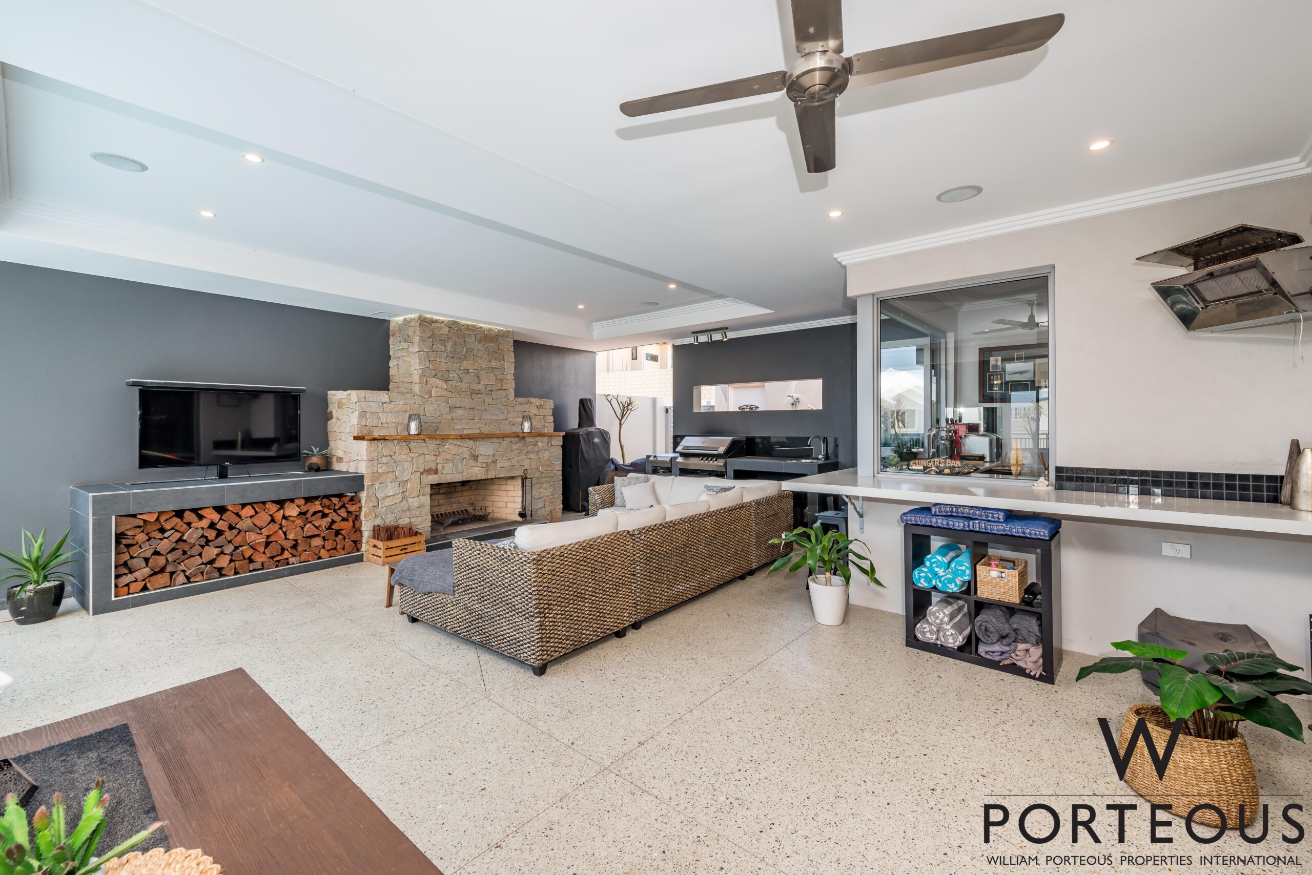 – Under-cover alfresco with stunning stone fireplace, bar and pop-up TV