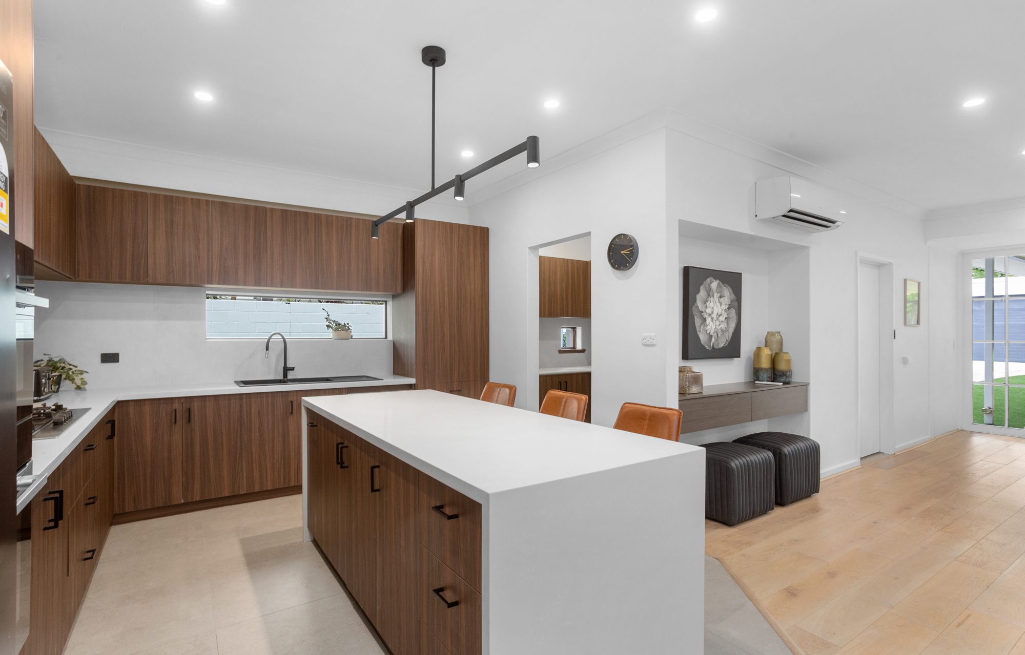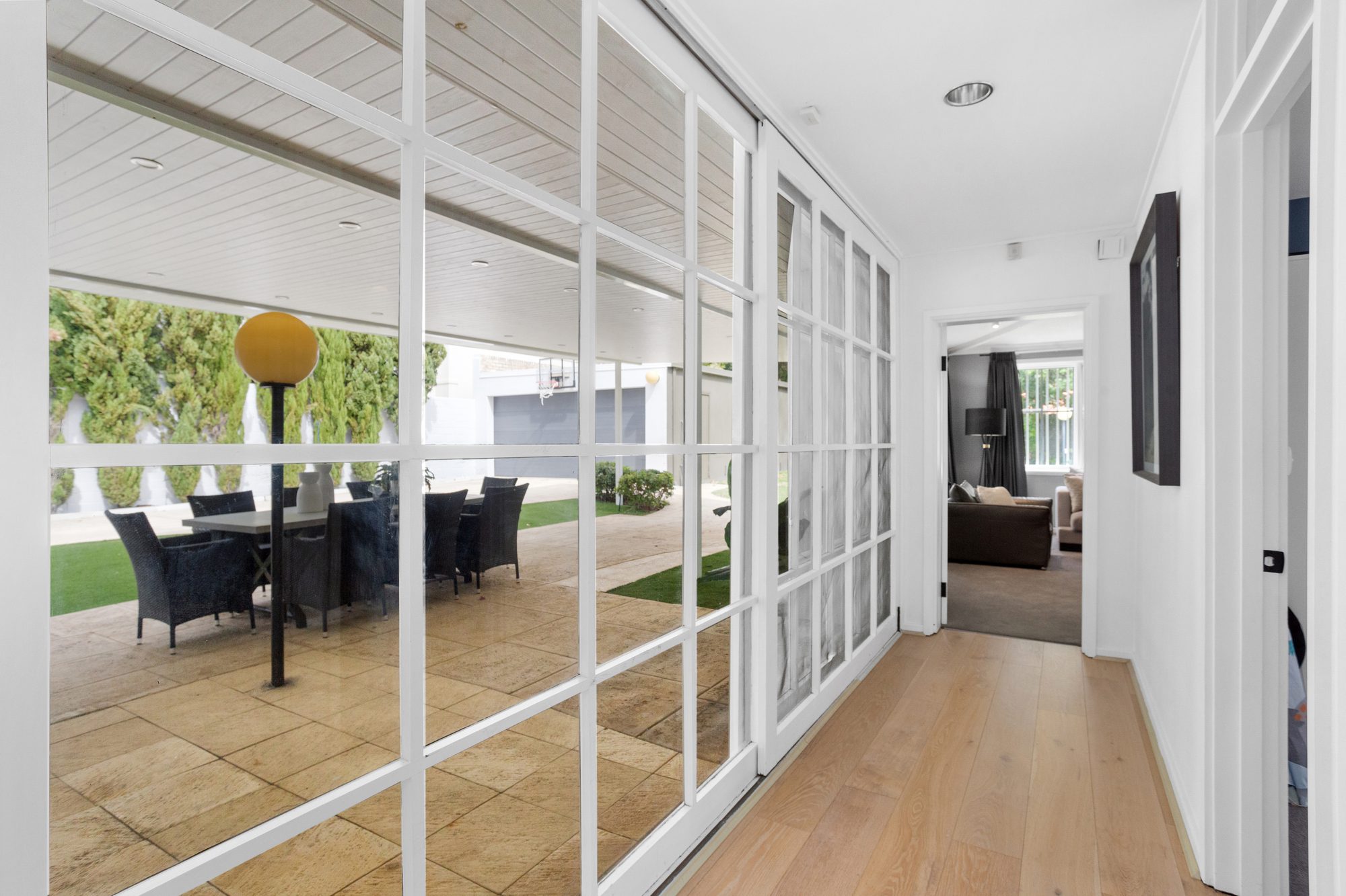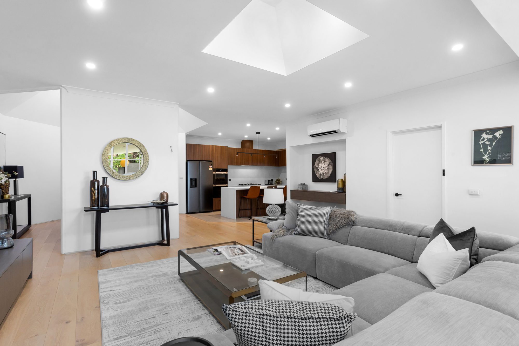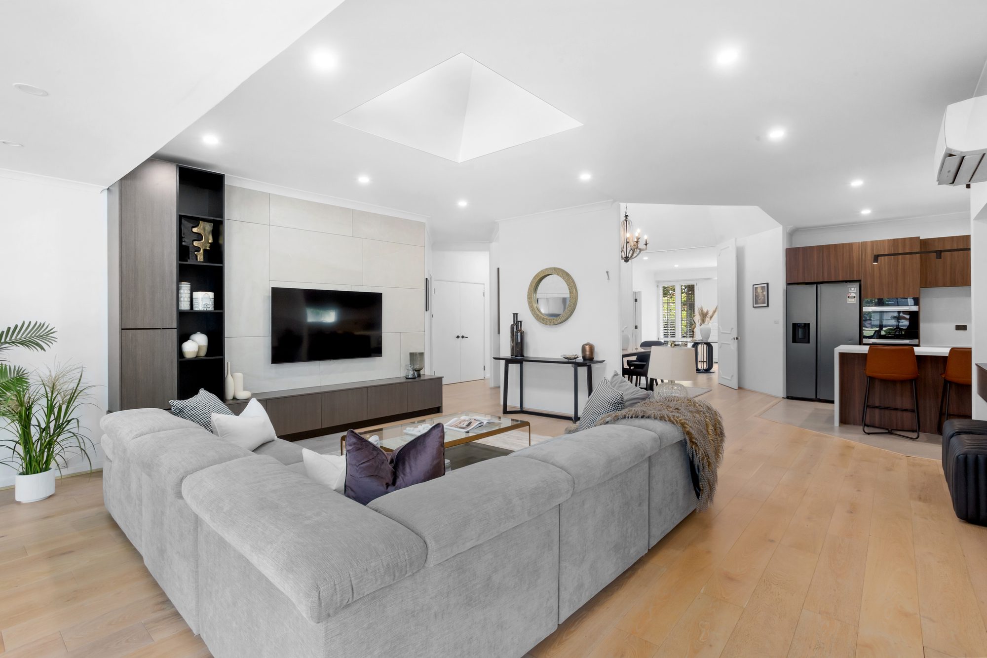 Superbly freshly renovated, from front to back, including all bathrooms, a completely new kitchen, laundry, walls, flooring, lighting ++, this classic 1970s bungalow now features stunning engineered oak flooring that flows through the living and traffic areas, creating a warm and inviting atmosphere. The front lounge/theatre room is a great space to relax or entertain, featuring built-in cabinetry and French doors. Opposite, the main bedroom is separated from the secondary accommodation, making it an ideal parents’ retreat. It features a luxe, fully-tiled ensuite with a semi-frameless rain shower and a heated towel rail.