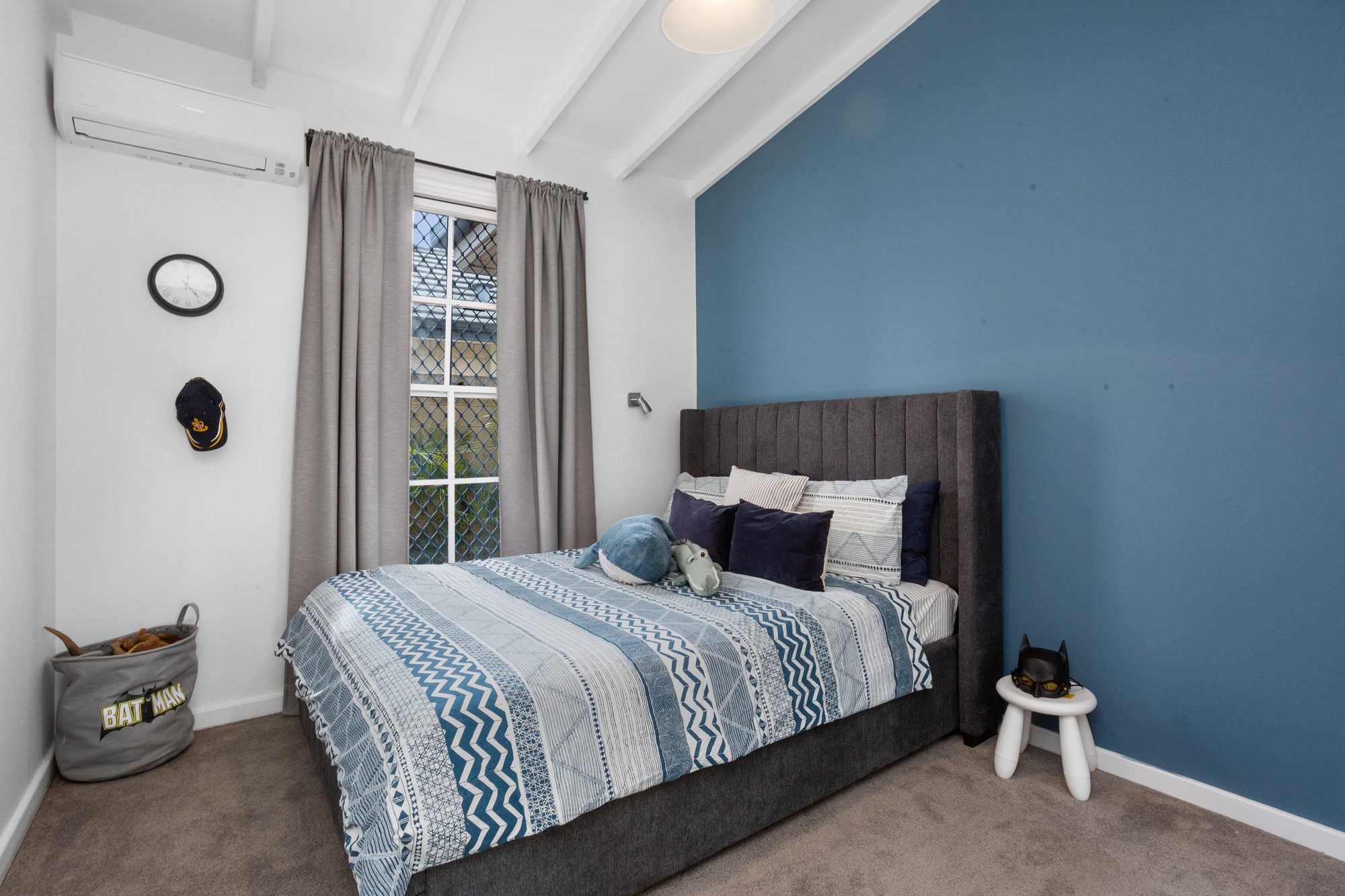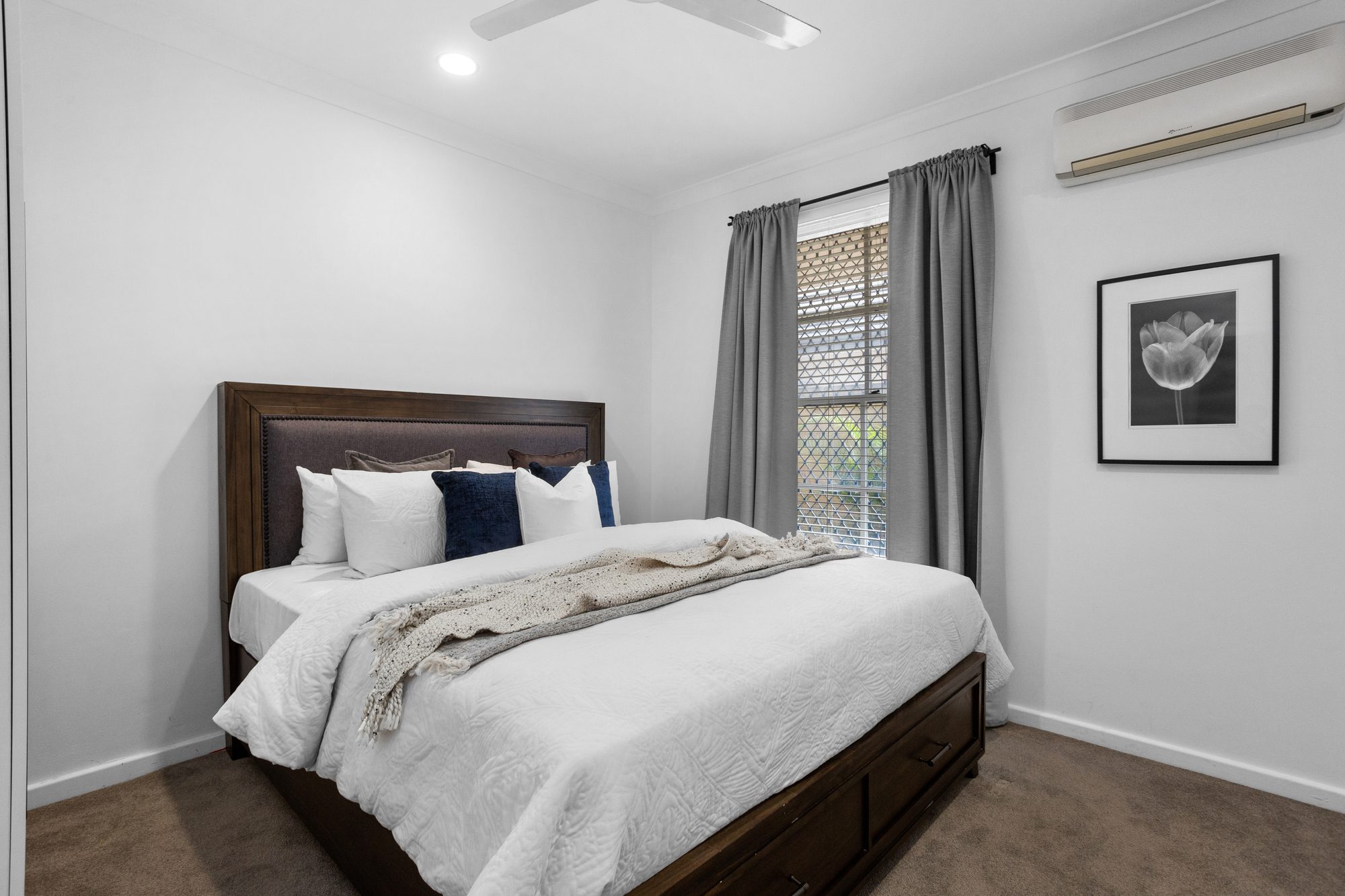 The family bathroom is equally impressive, featuring a semi-frameless rain shower, a double vanity, and an adjacent powder room. The three secondary bedrooms are comfortable and appointed with carpeted floors, ceiling fans, and split-system air conditioning units.